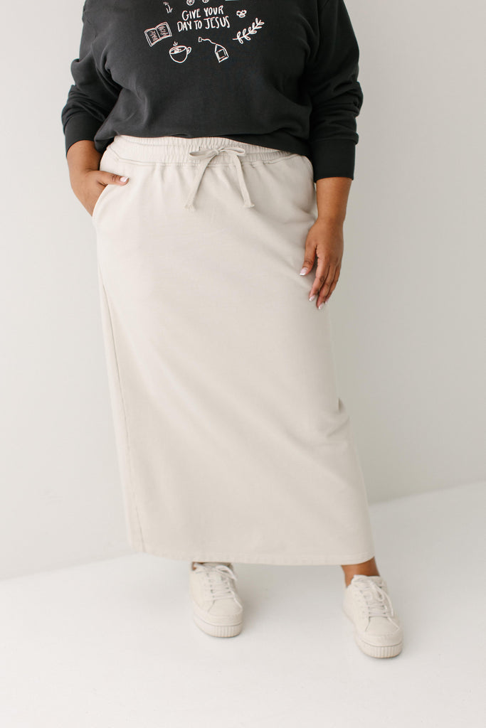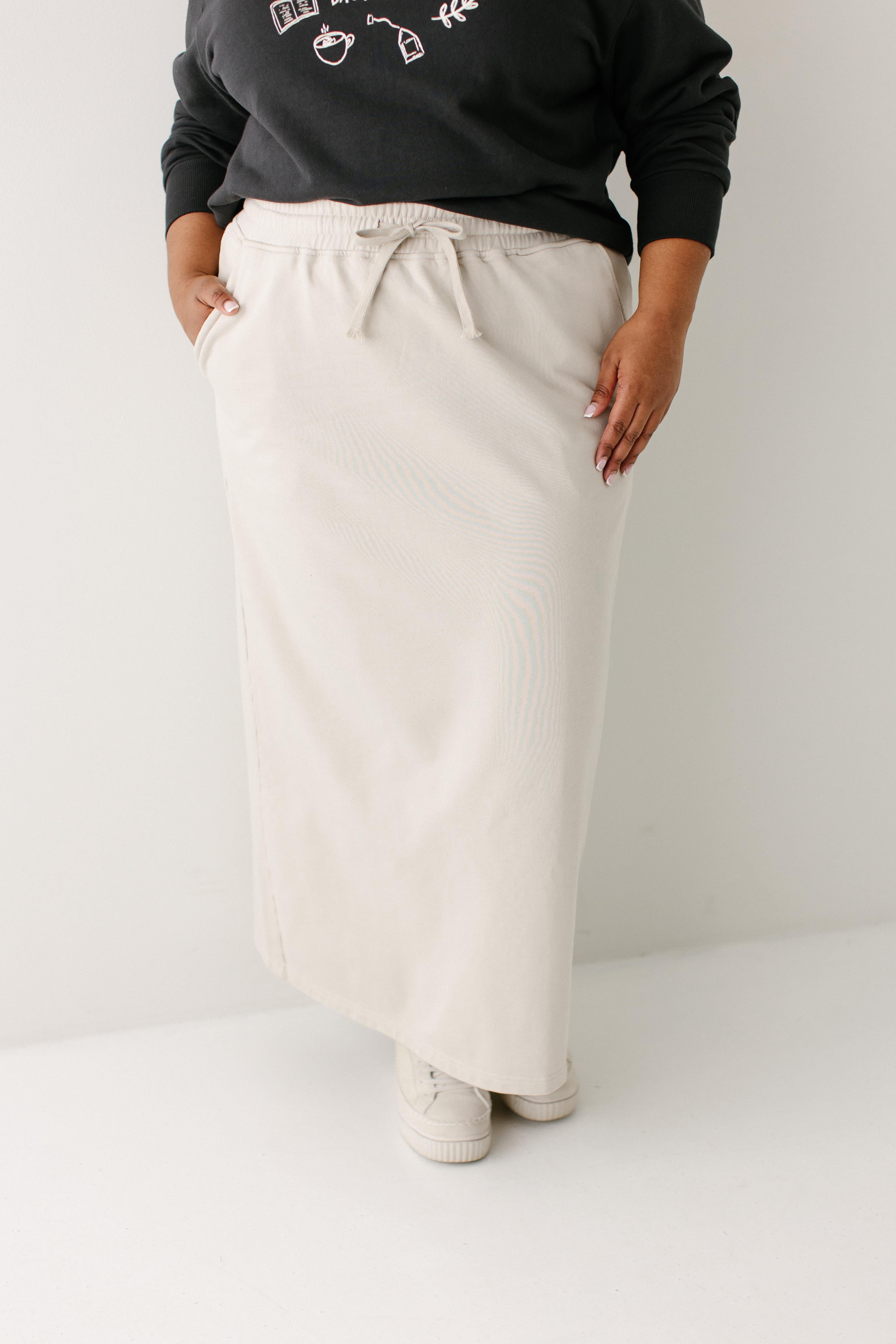 Model wearing the 'Camden' Classic Stripe Cotton Sweater with the 'Megan' Maxi Sweatshirt Skirt