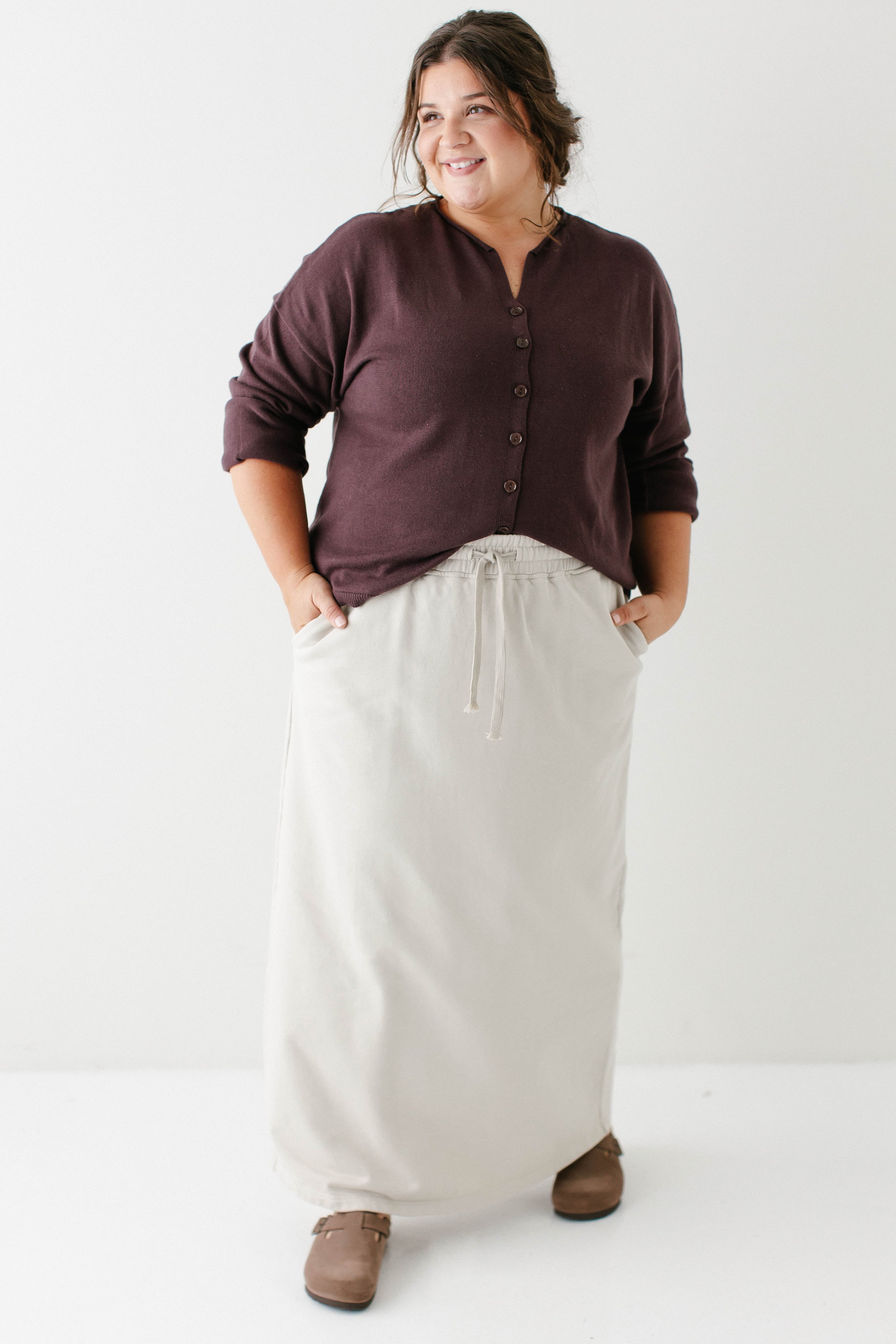 Model wearing the 'Jana' Drop Sleeve Cardigan in Deep Plum with the 'Megan' Maxi Sweatshirt Skirt