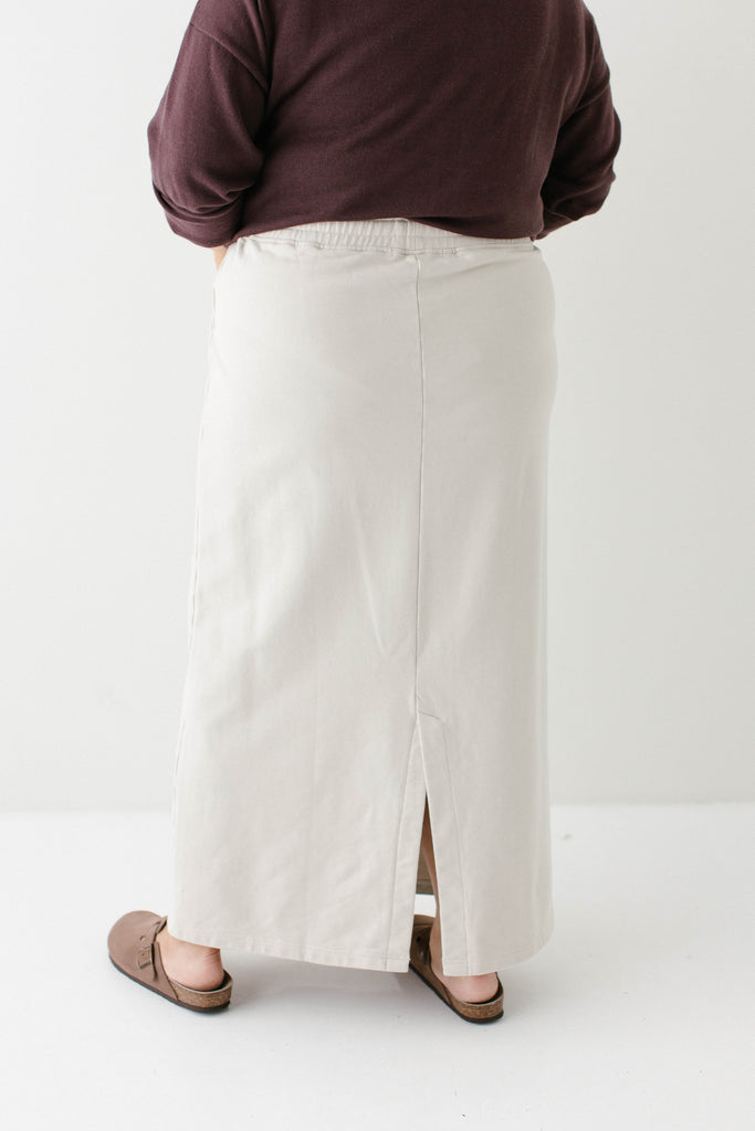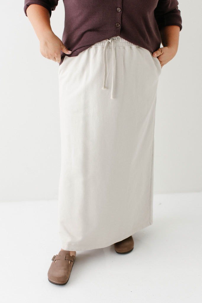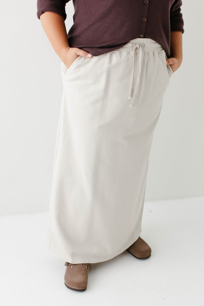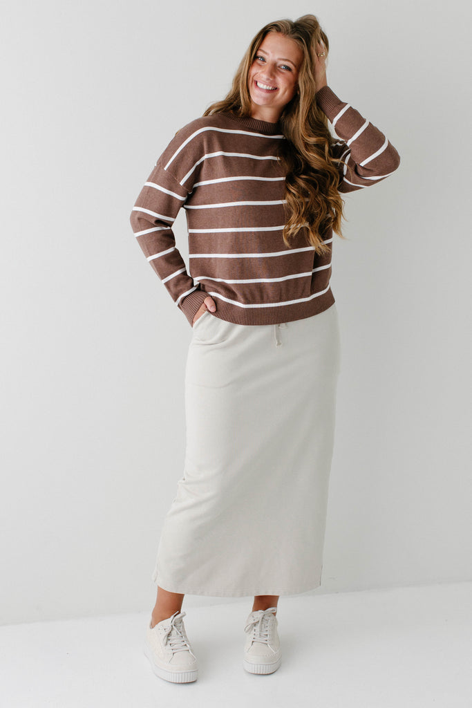 Model wearing the 'Camden' Classic Stripe Cotton Sweater with the 'Megan' Maxi Sweatshirt Skirt
