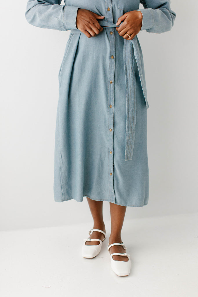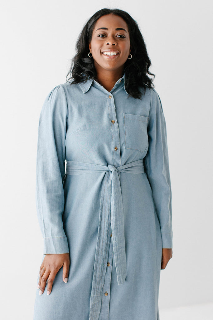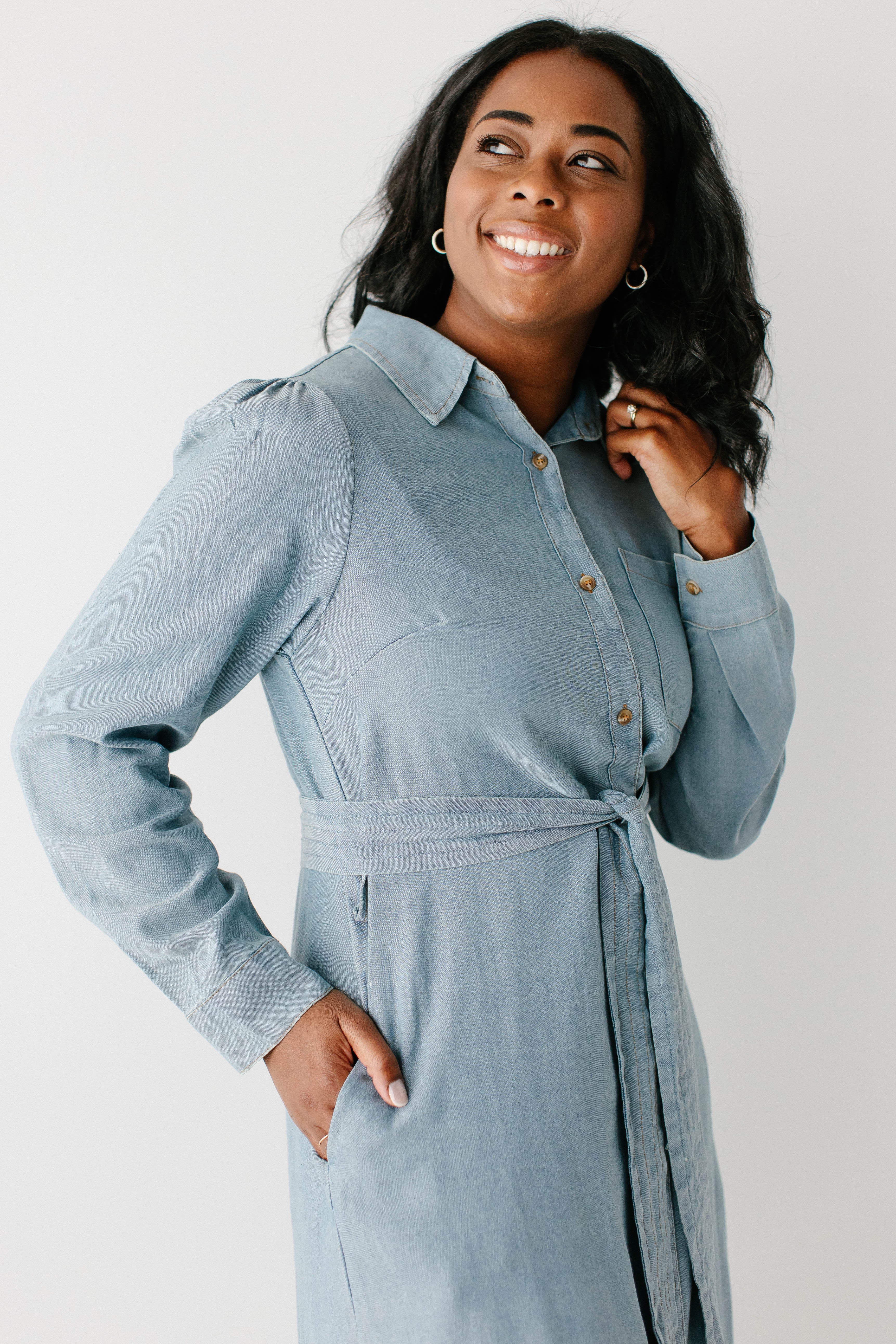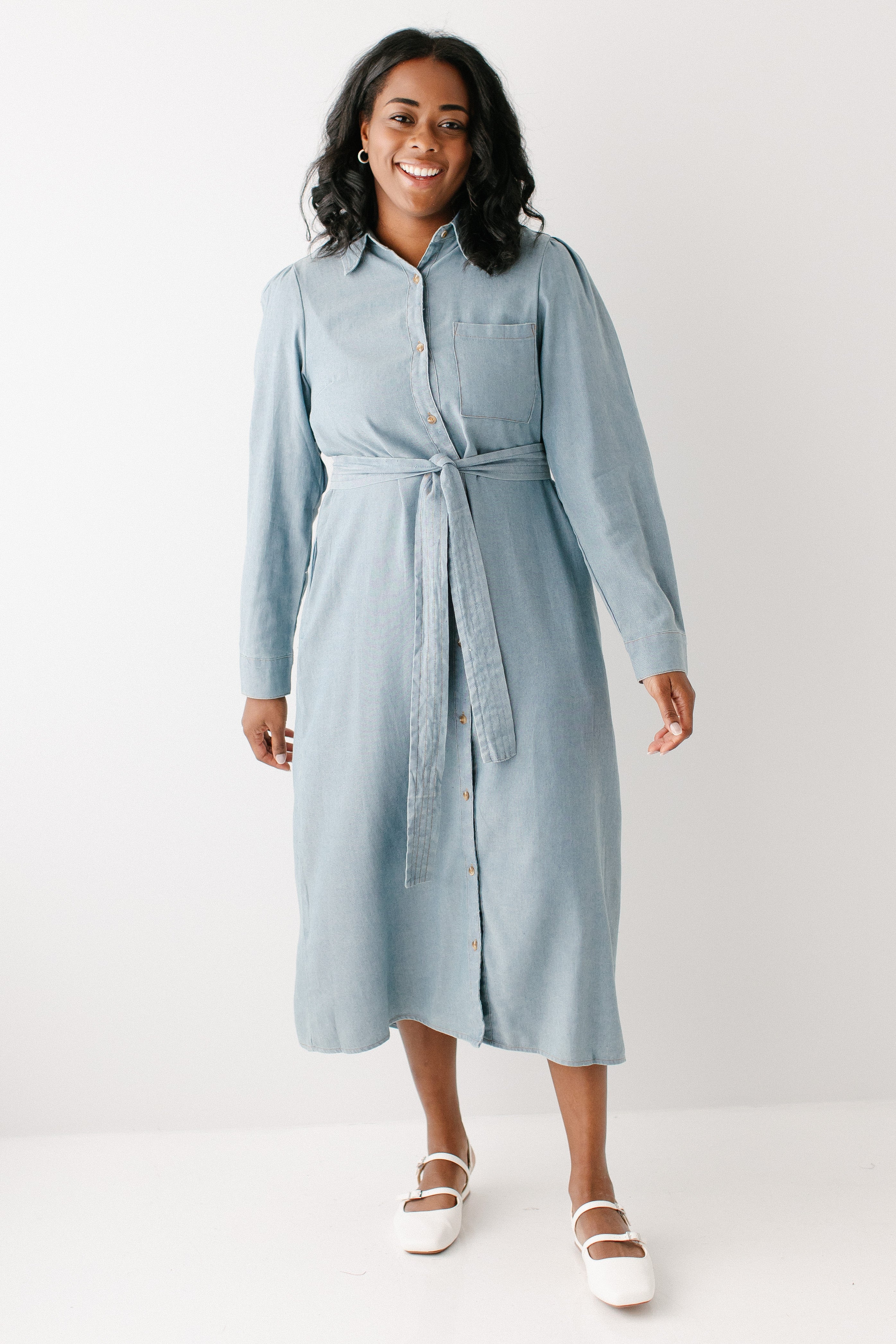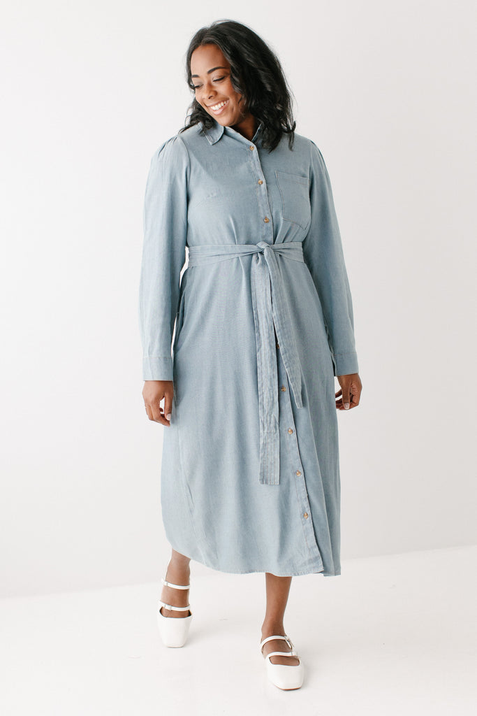 With the look of real denim but in the comfort of soft chambray fabric, introducing the 'Misti' Chambray Button Down Shirtdress! This dress has functional buttons the entire way down, a removable matching belt, long sleeves, and all in a soft light wash shade. The ‘Misti’ will keep you stylish in this season and the next! Style it with a cozy jacket and leather bag, or leave it as is.