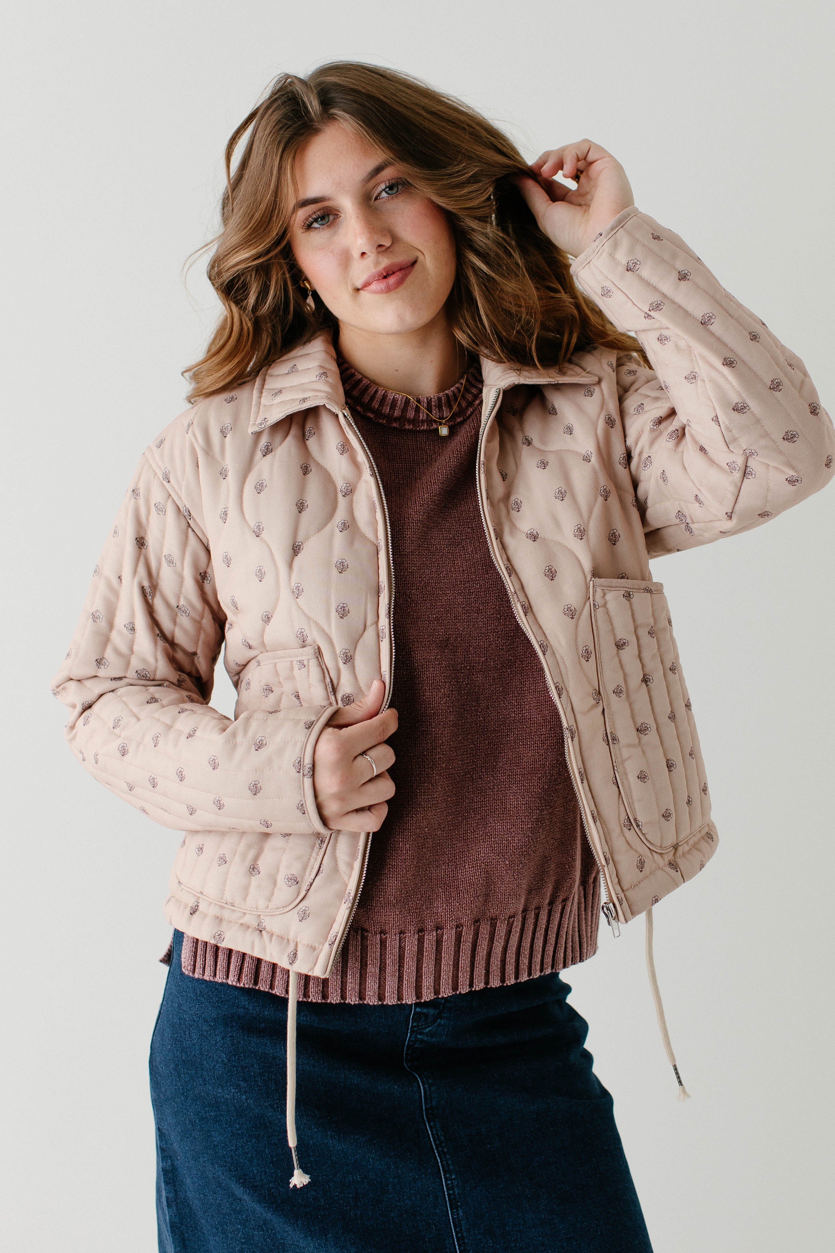 Model wearing the 'Moriah' Washed Cotton Sweater with the 'Margaret' Stretch Denim Midi Skirt