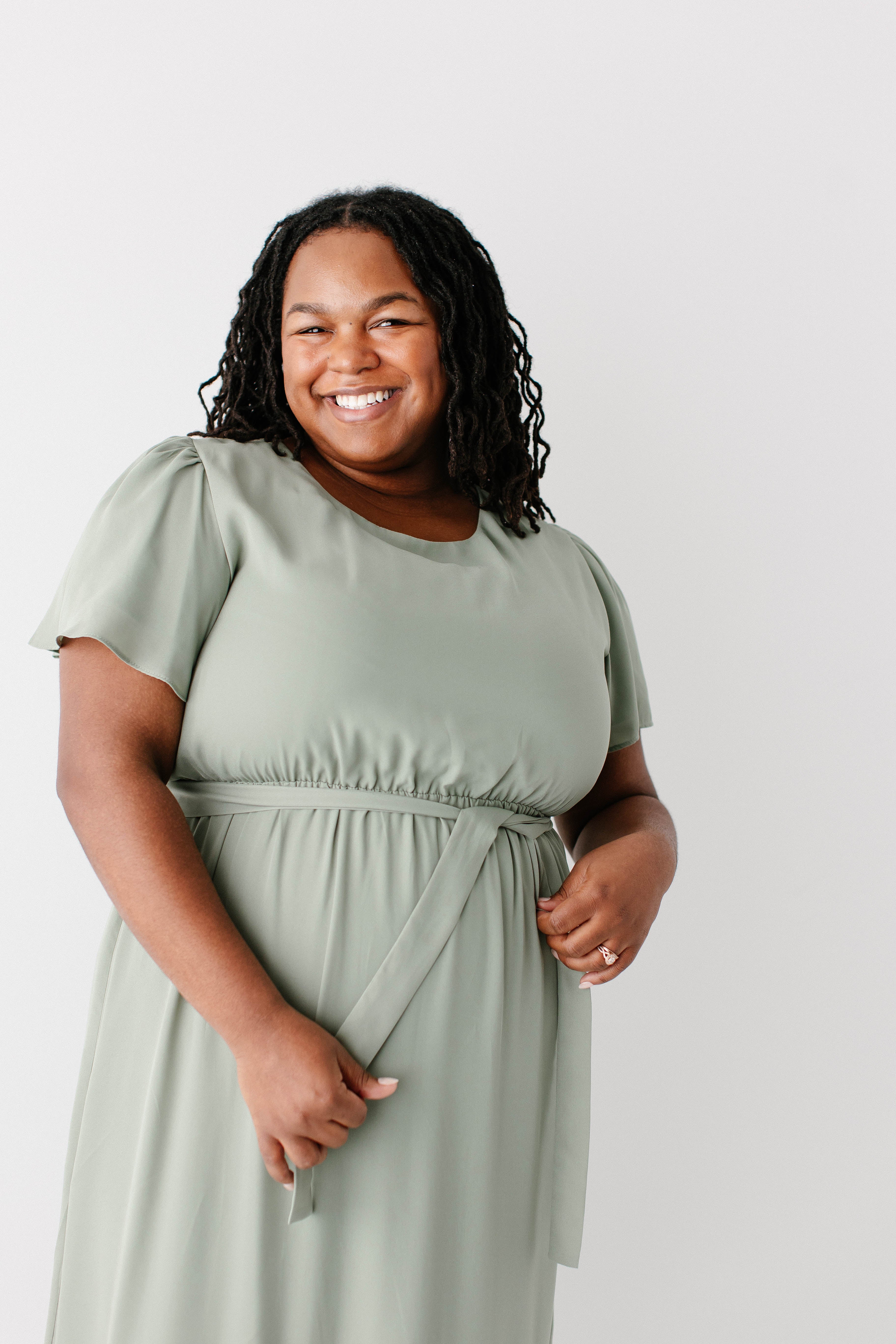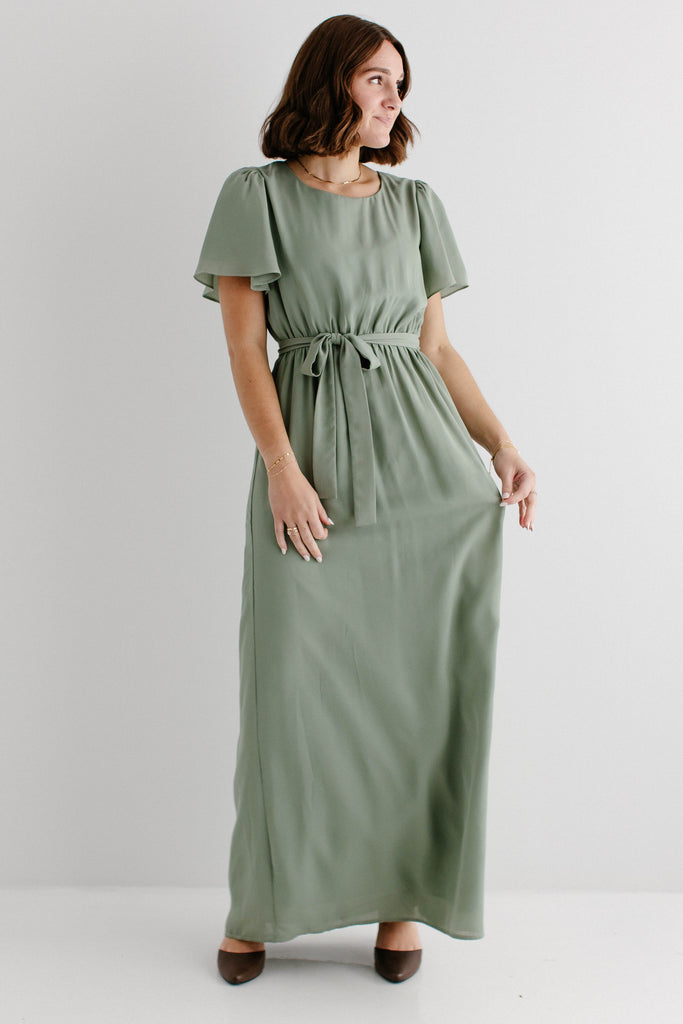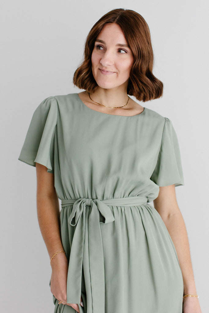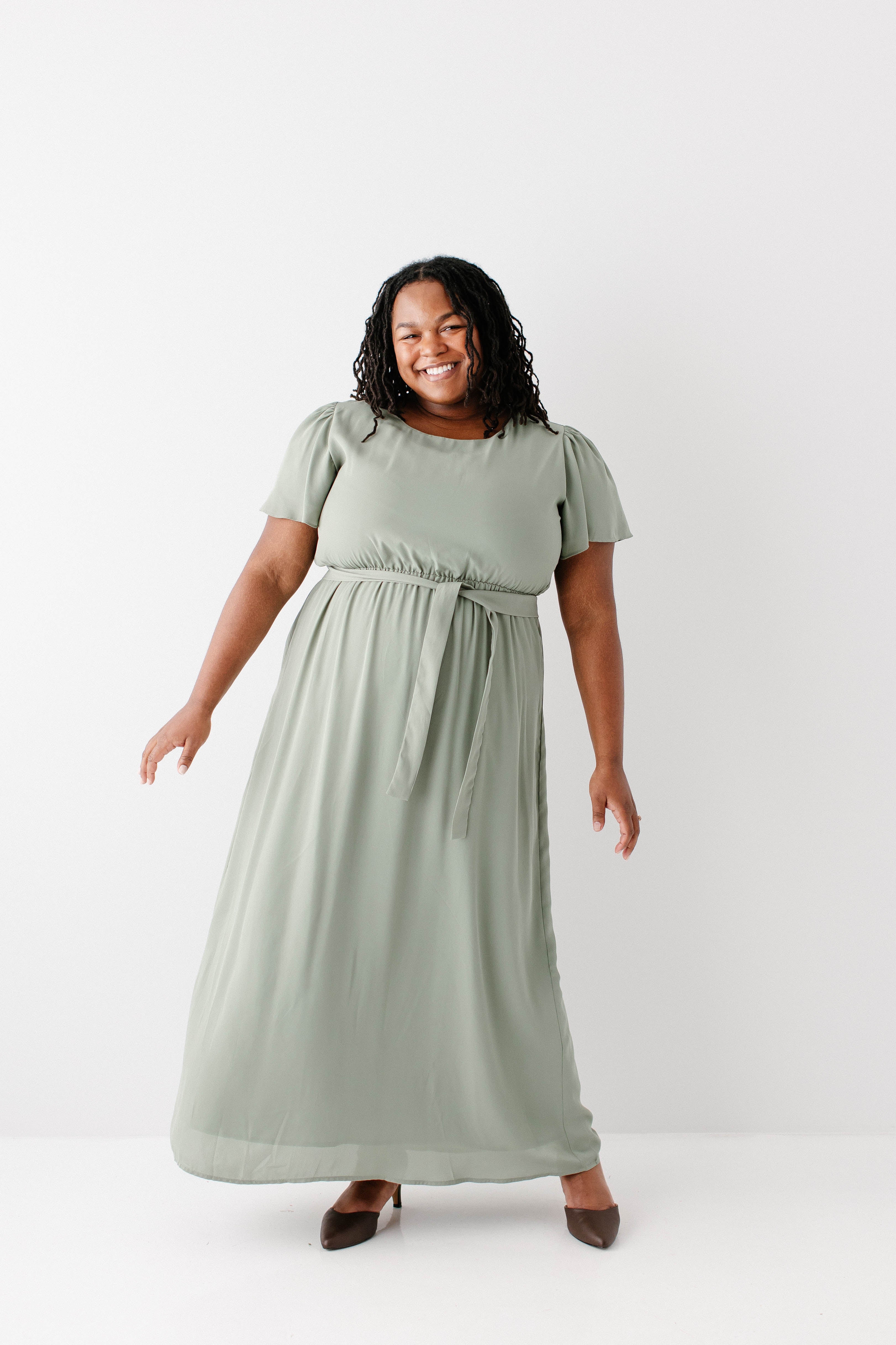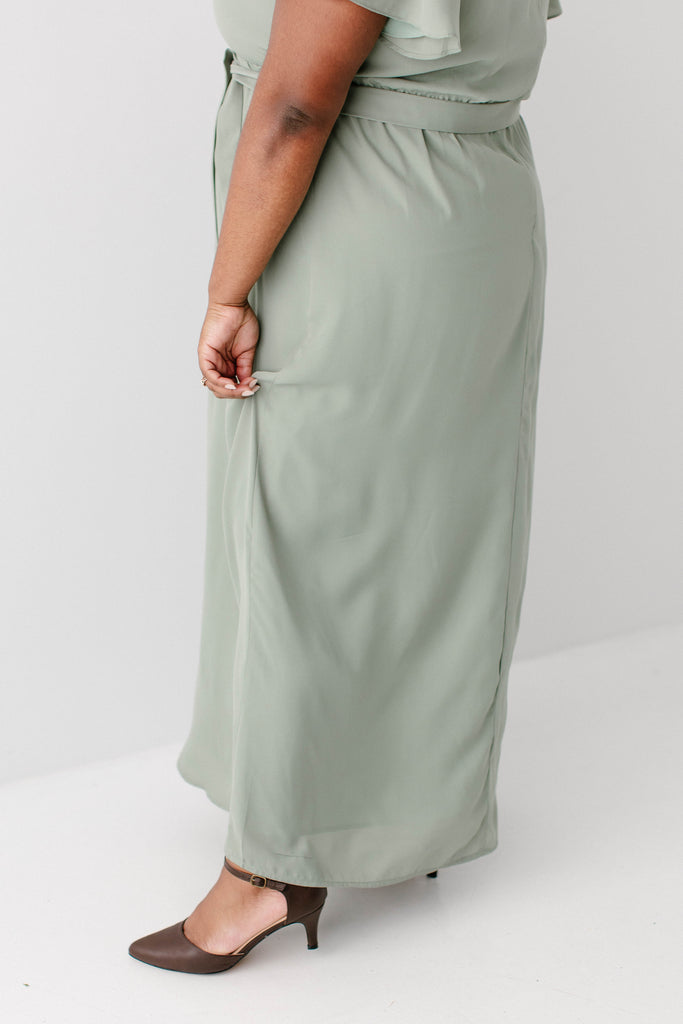 Graceful, feminine, and delicate – the 'Naomi' Chiffon Belted Maxi Dress is perfect for any occasion. Featuring a beautiful sage green color and matching belt, this maxi dress creates a breathtaking look. Dress it up with low heels and a clutch or dress it down by layering with a denim jacket and clogs. Exclusively designed by us with you in mind!