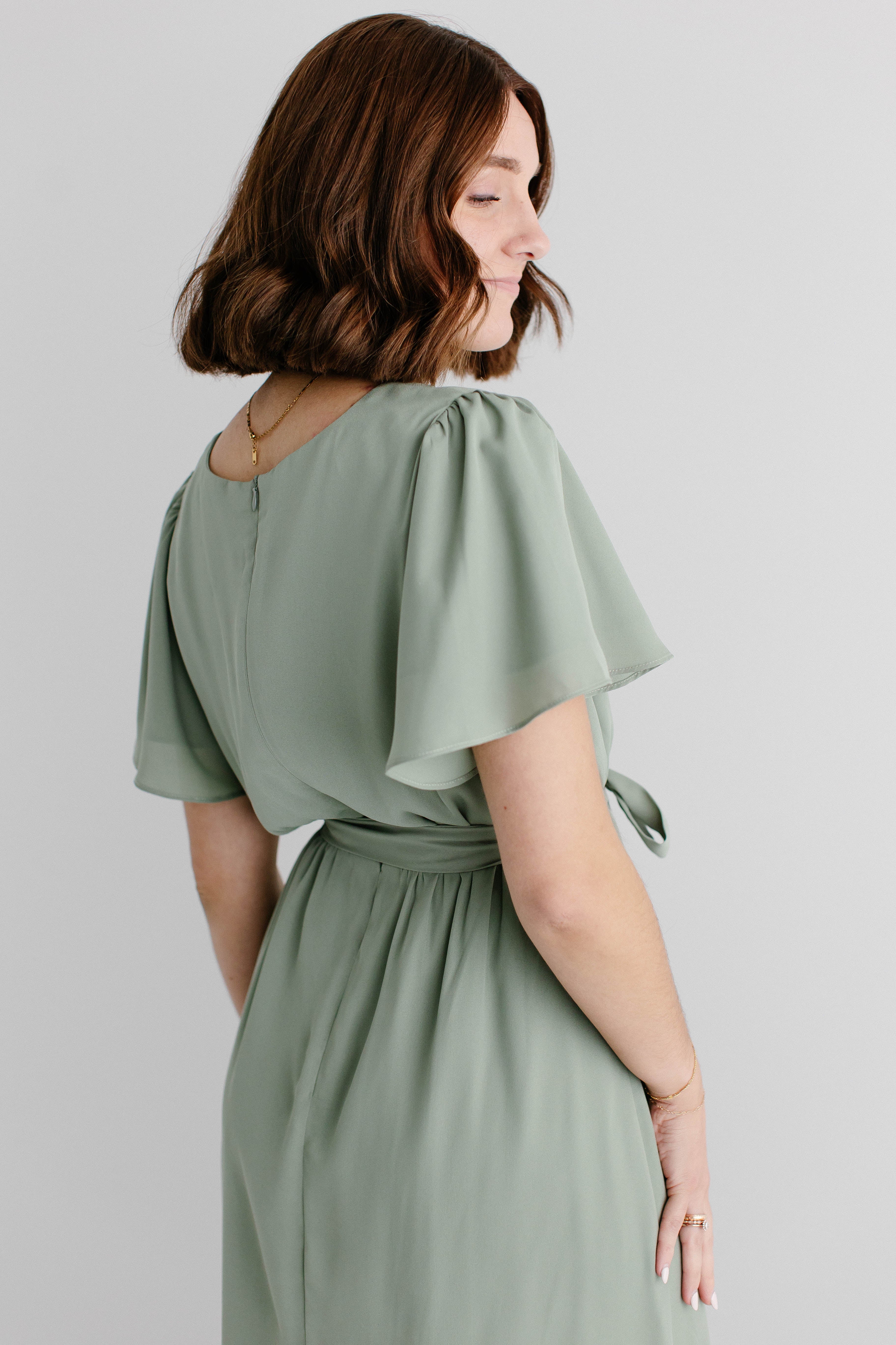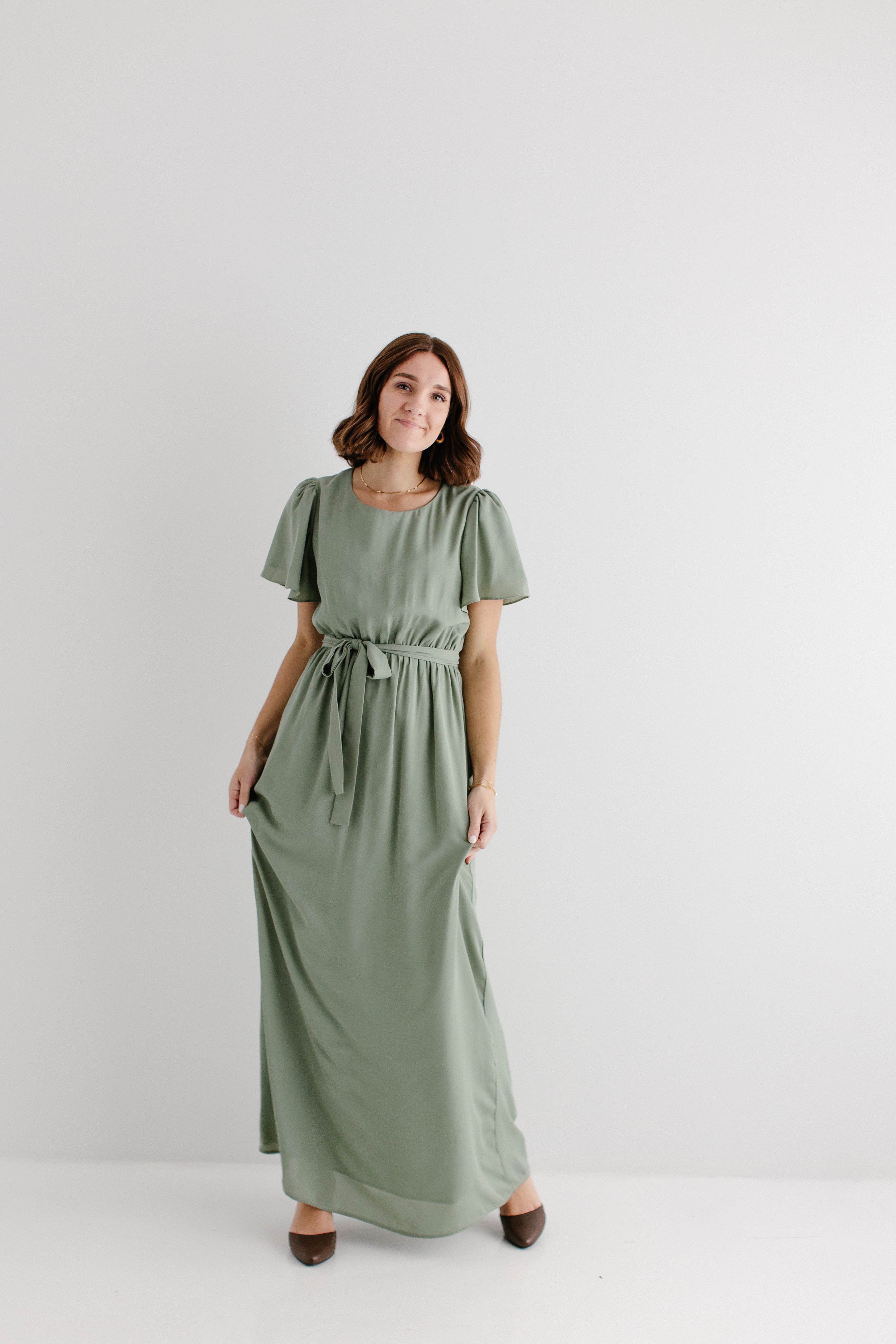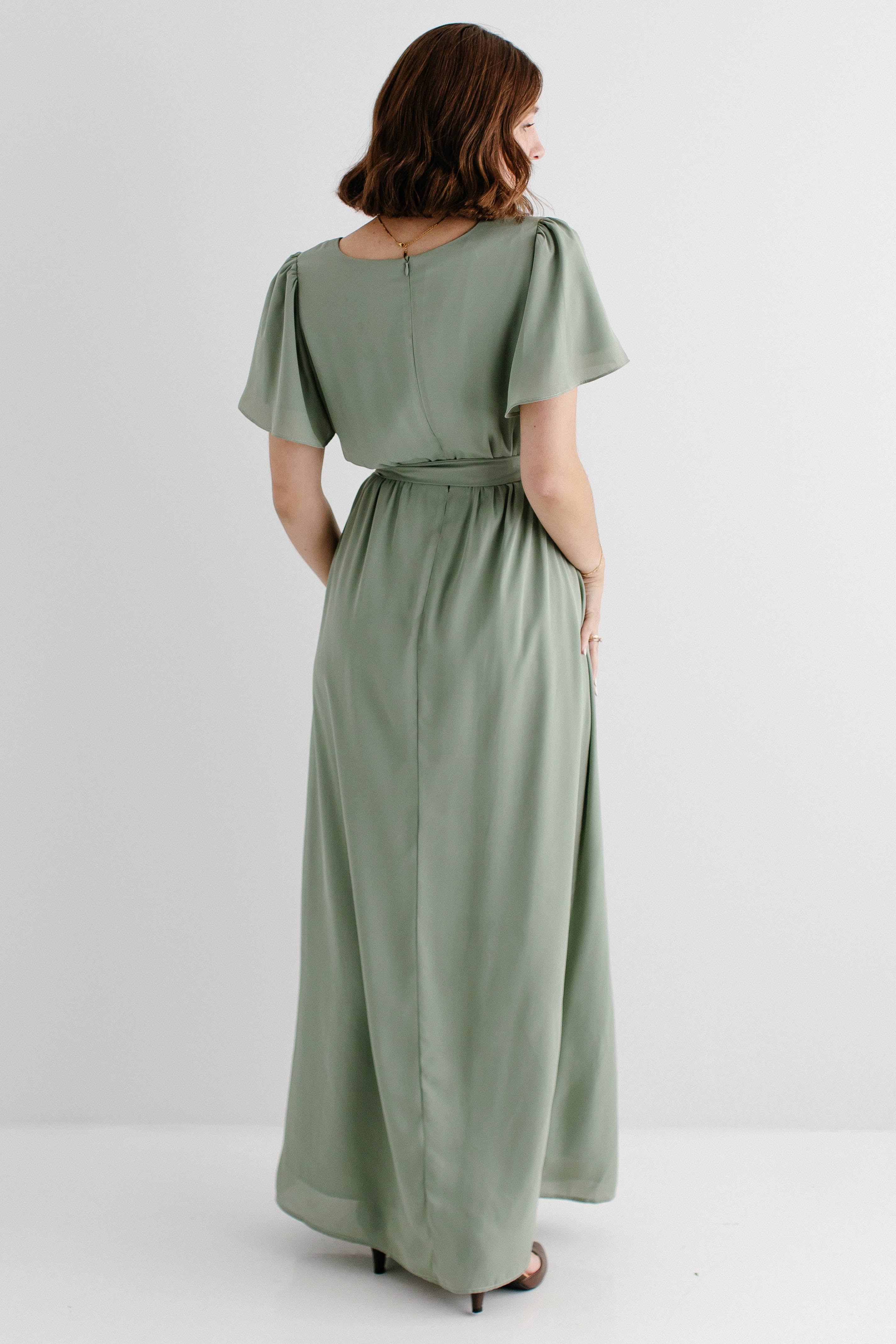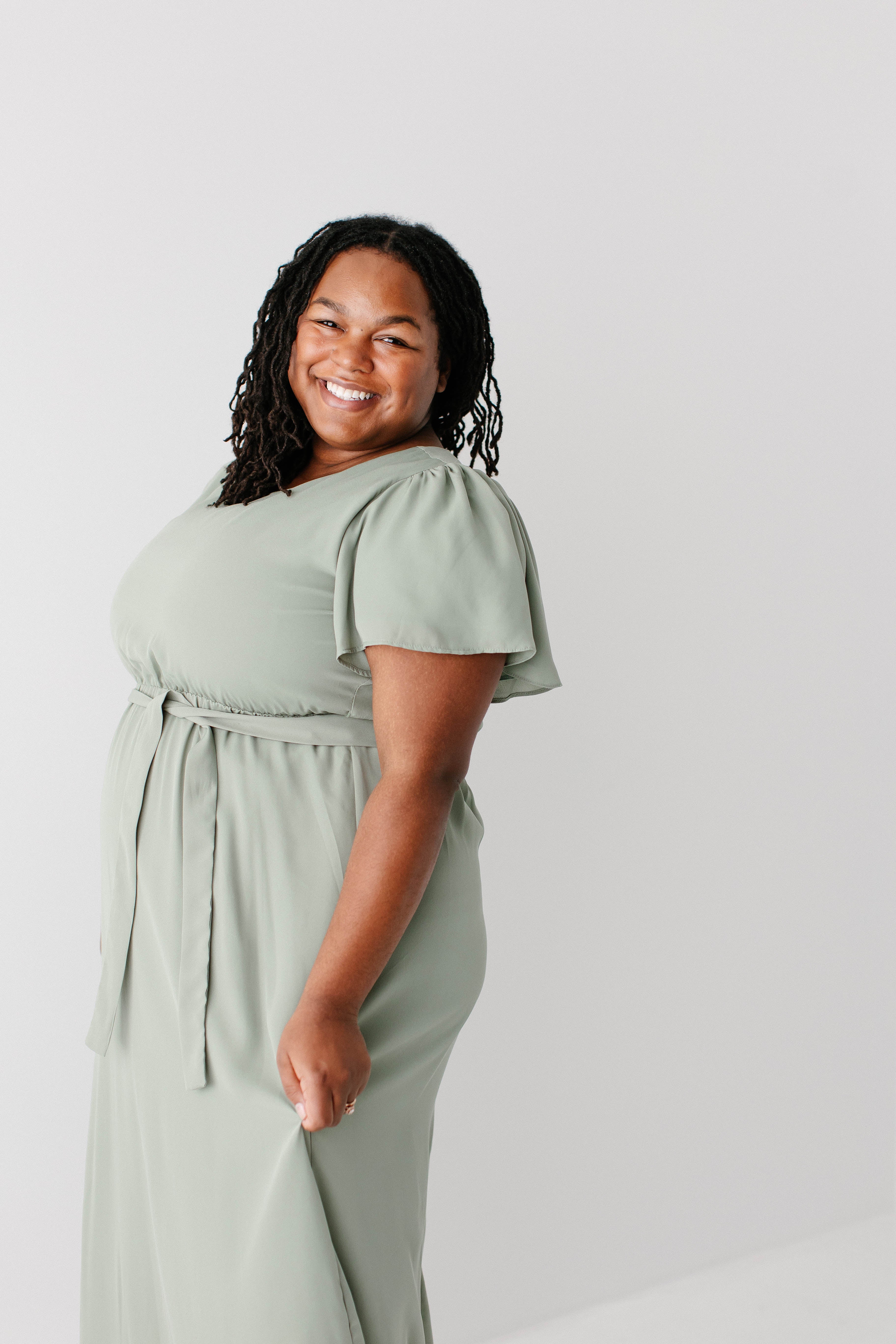 Graceful, feminine, and delicate – the 'Naomi' Chiffon Belted Maxi Dress is perfect for any occasion. Featuring a beautiful sage green color and matching belt, this maxi dress creates a breathtaking look. Dress it up with low heels and a clutch or dress it down by layering with a denim jacket and clogs. Exclusively designed by us with you in mind!