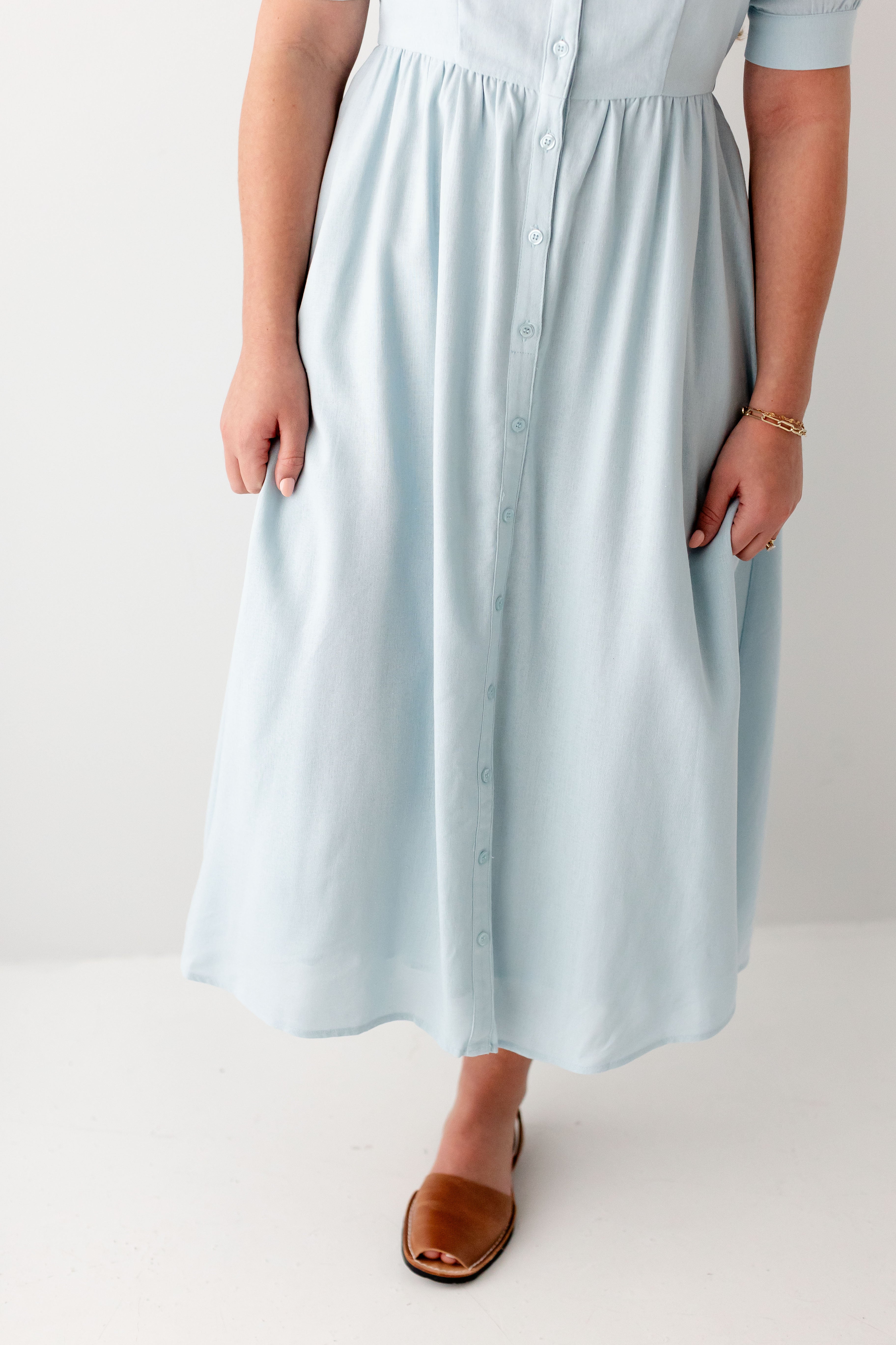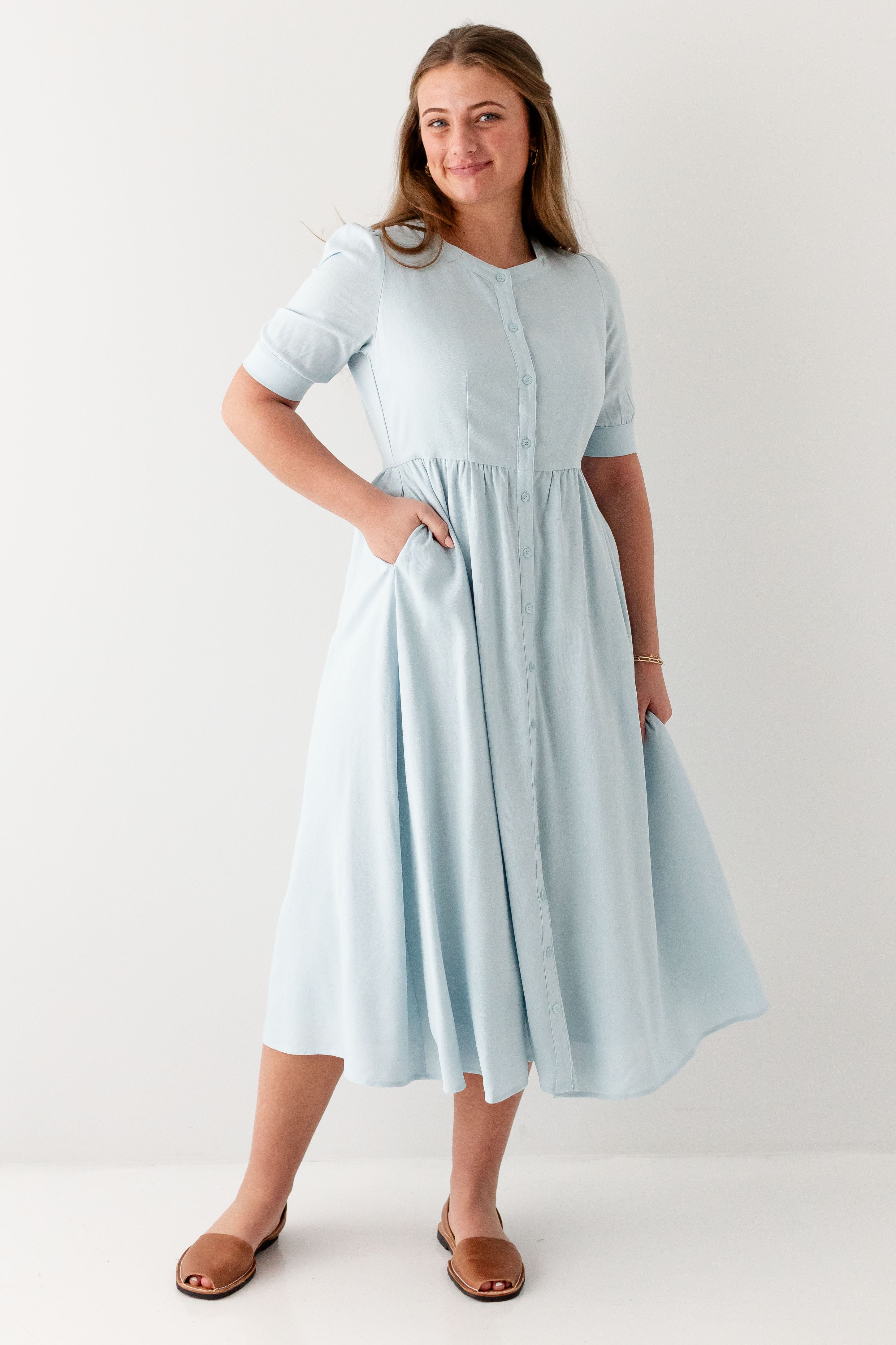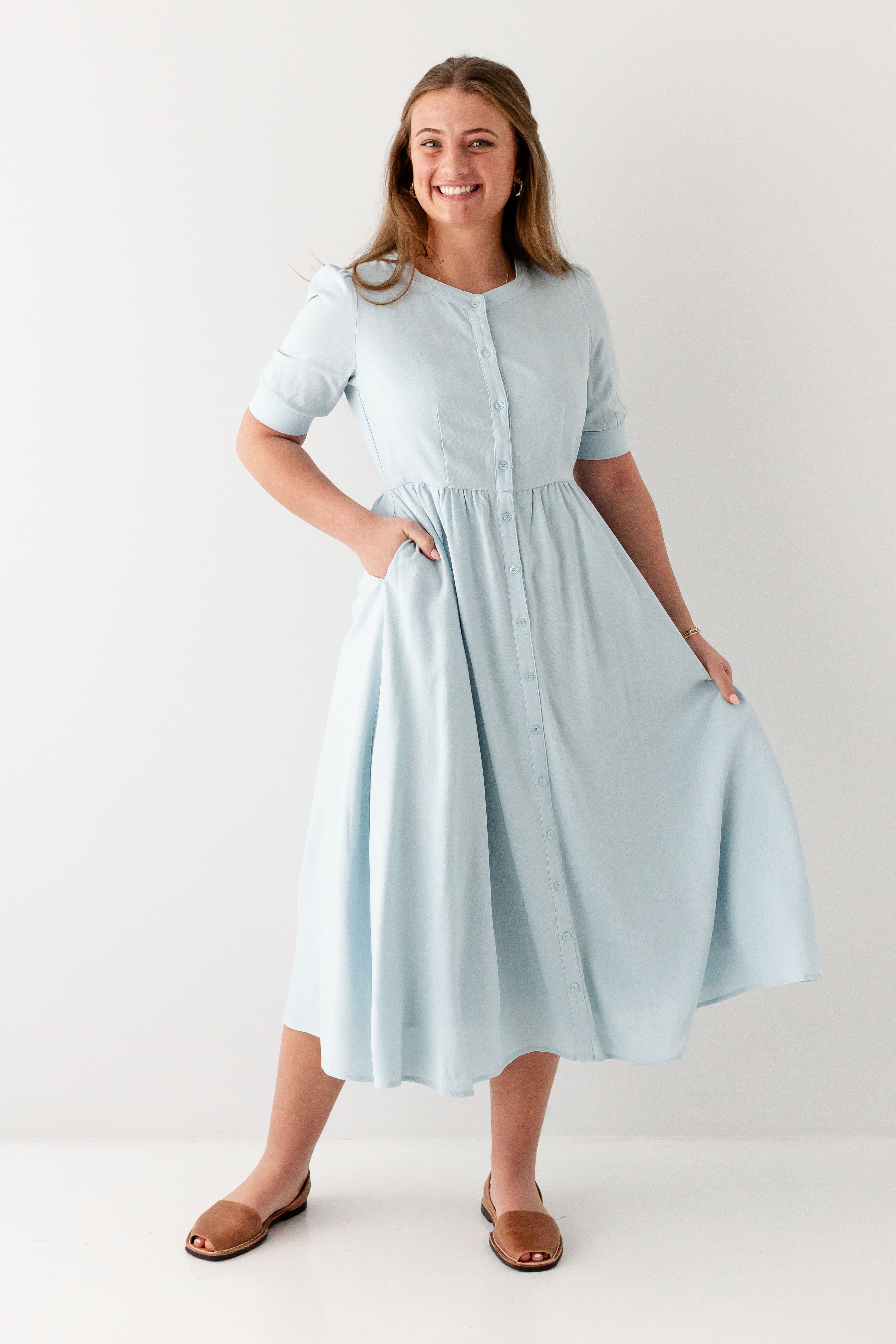 A nod to the 1940s, the 'Nora' Button Front A-Line Dress comes in a breathable cotton/linen blend fabric with a full cotton lining, a modest sweetheart neckline, functional buttons down the bodice, flowing A-line skirt, structured top, and in two fun colors - chai brown and light blue. What’s not to love about the ‘Nora’? Exclusively designed by us with you in mind.