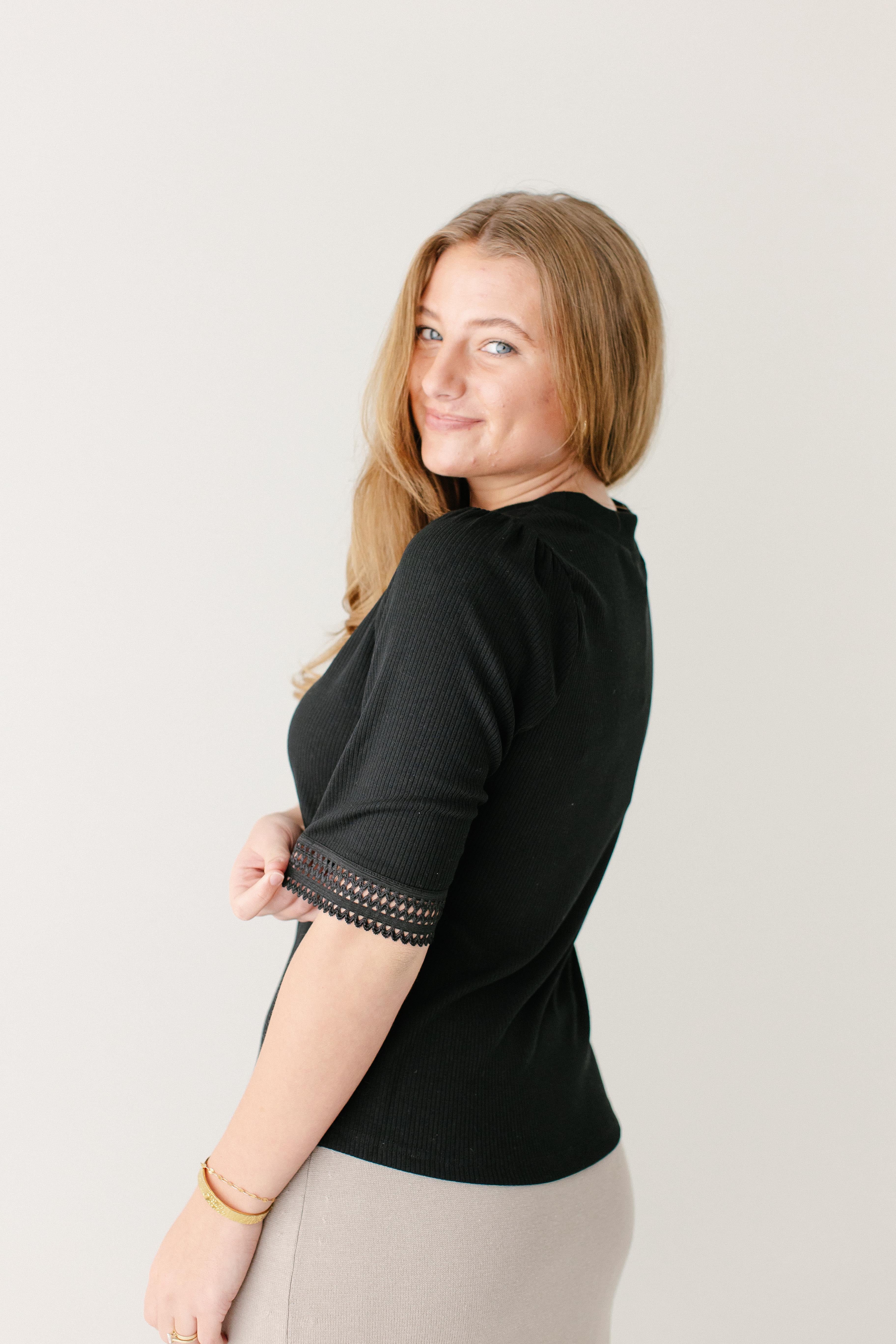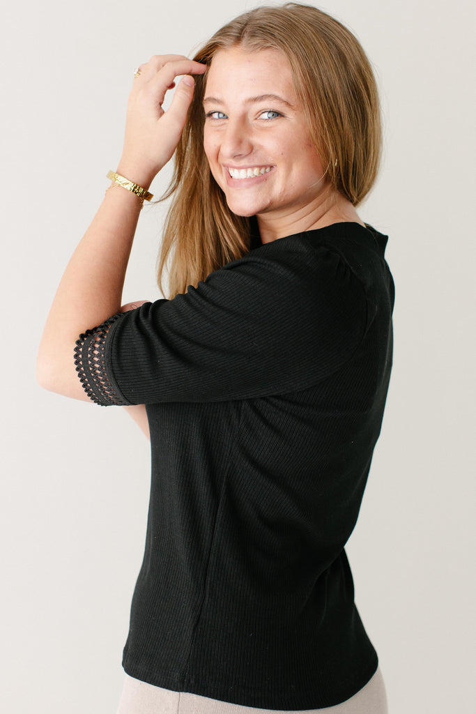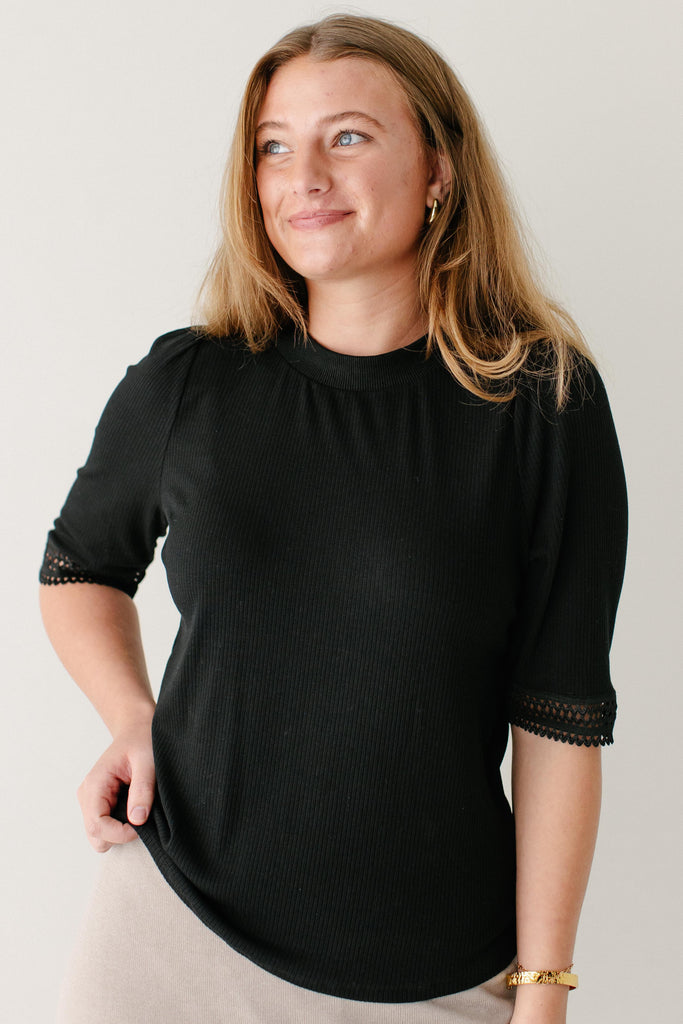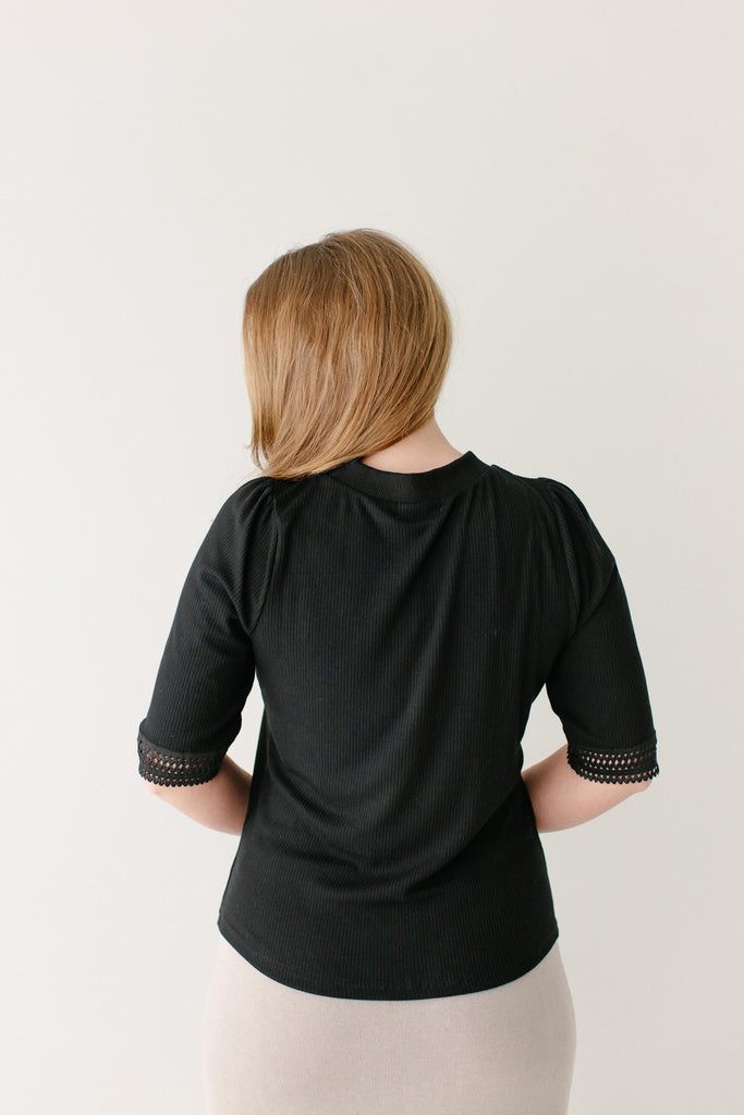 A perfect elevated top is a necessity for every woman’s wardrobe. The 'Onyx' Lace Detail Ribbed Top is made with soft ribbed fabric and a half sleeve with an elegant lace detailing along the edges. This is the perfect piece to elevate any everyday look for a day at the office!