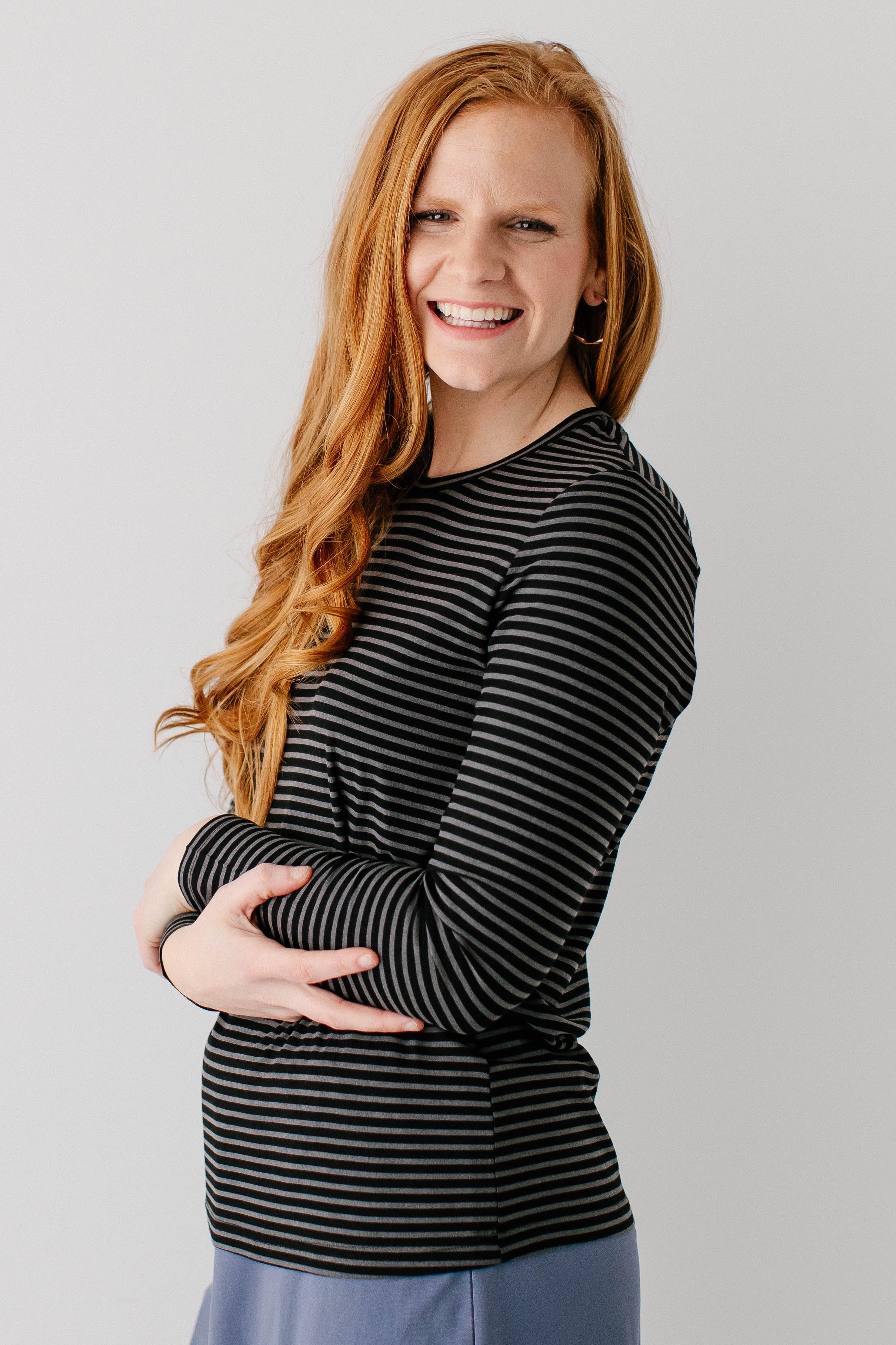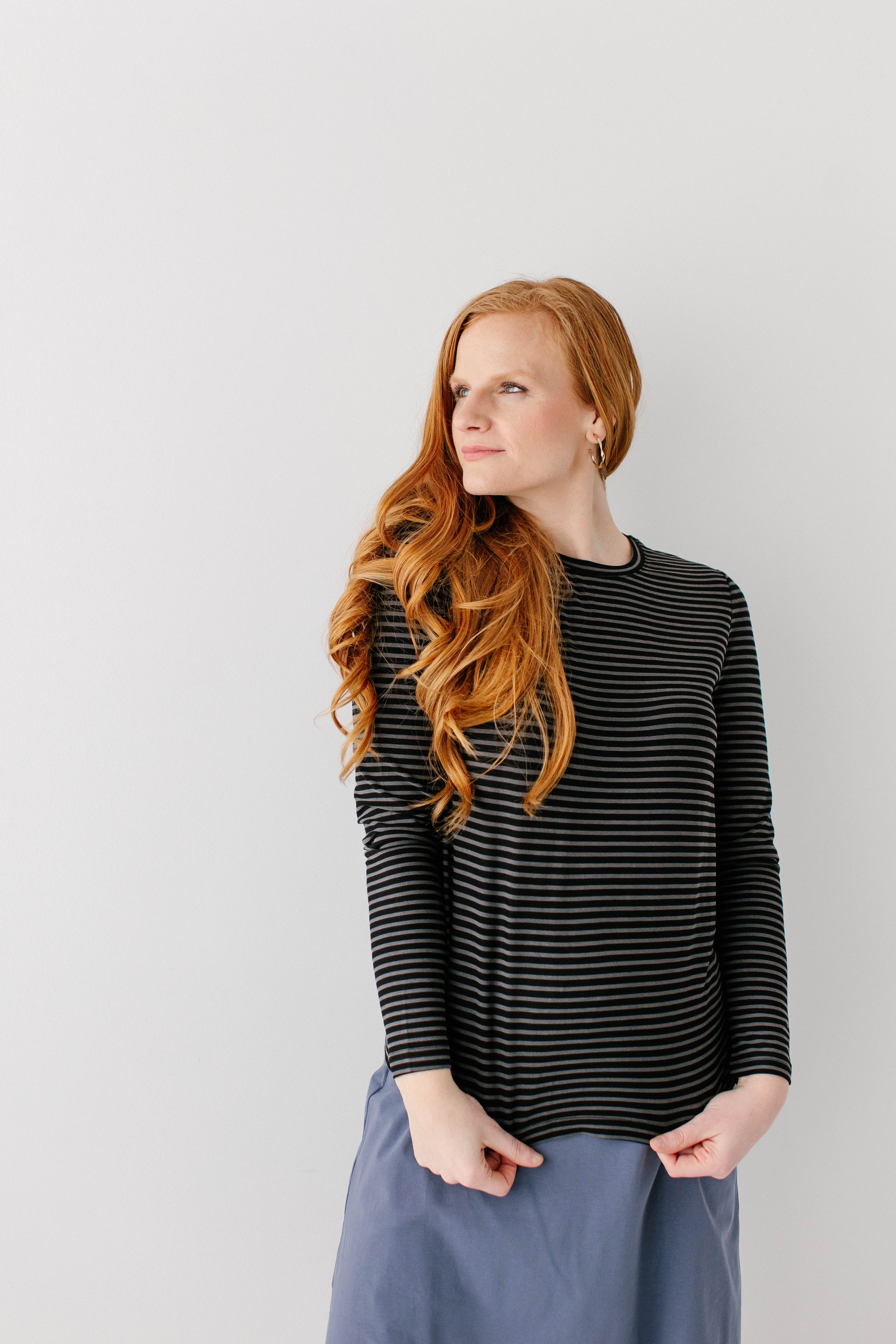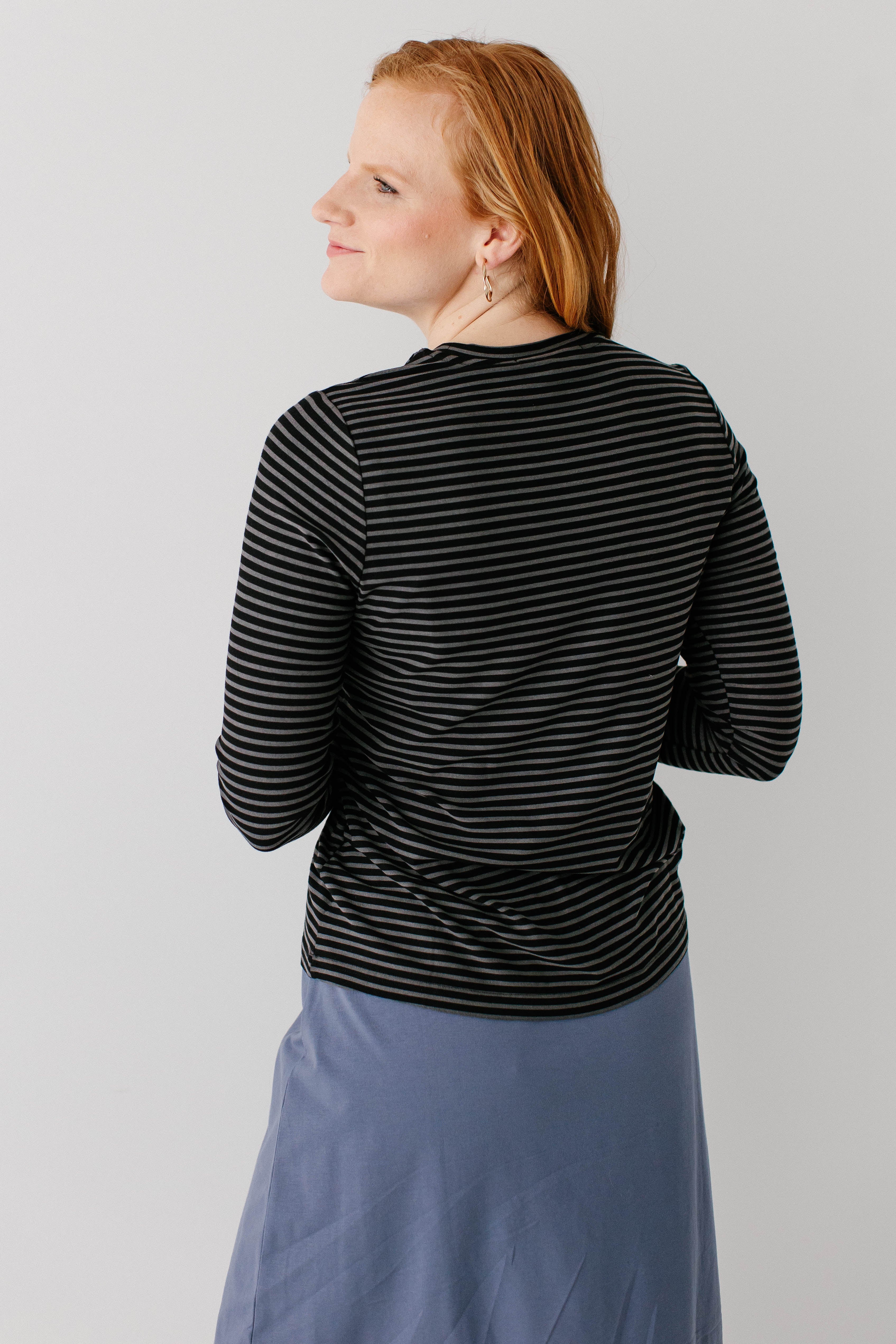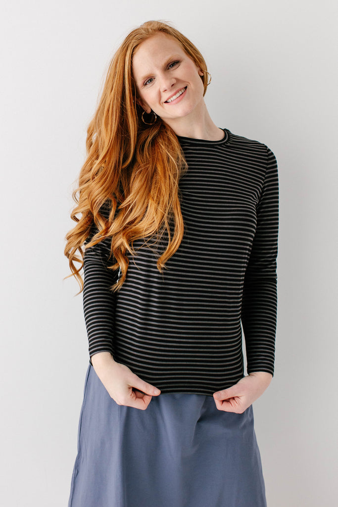 A classic striped long sleeve tee is a necessity for your closet! The 'Palmer' Long Sleeve Striped Tee is designed with a bamboo blend fabric in an easy black background and dark grey stripe so you can pair it with any of your outfits! Exclusively designed by us with you in mind.