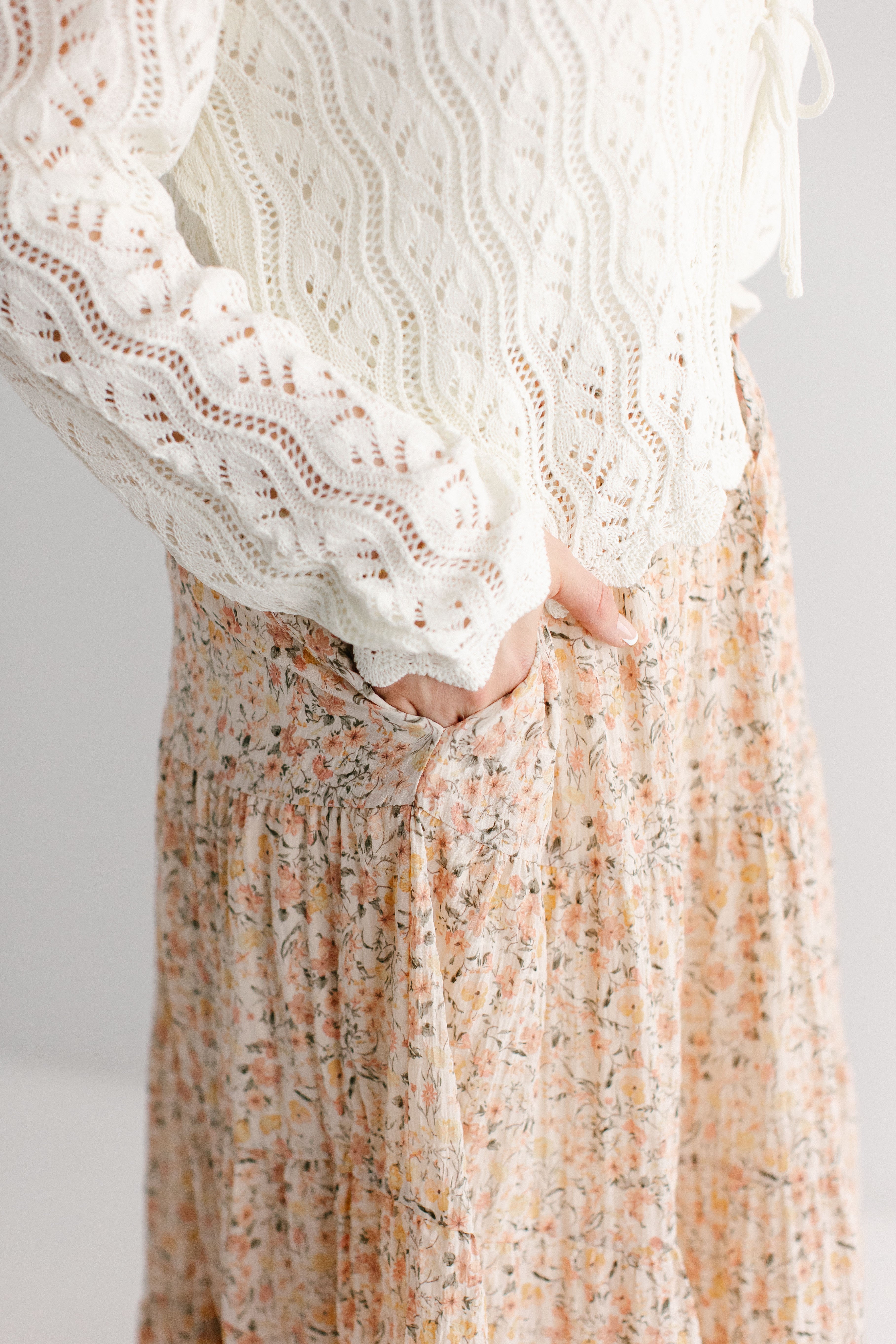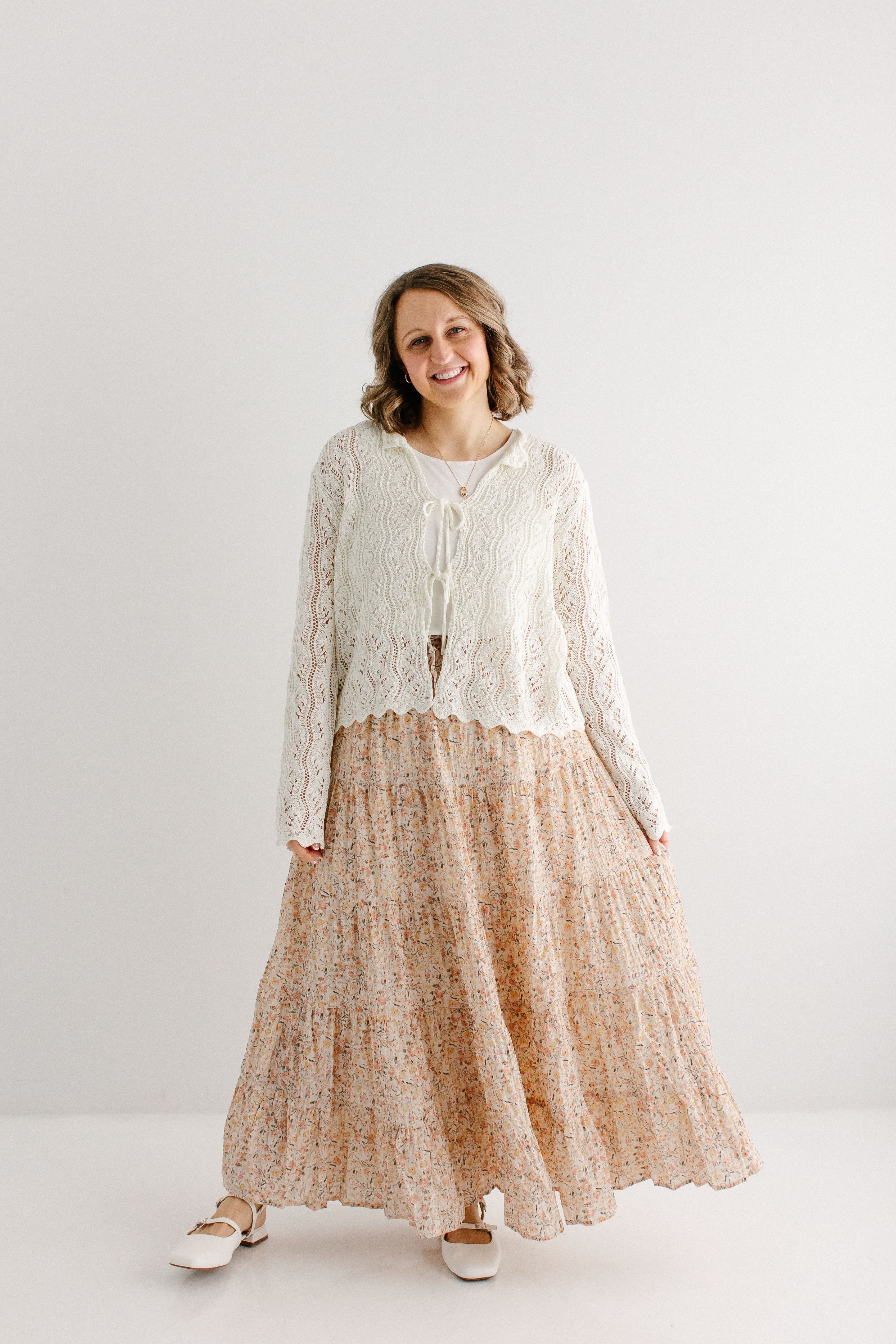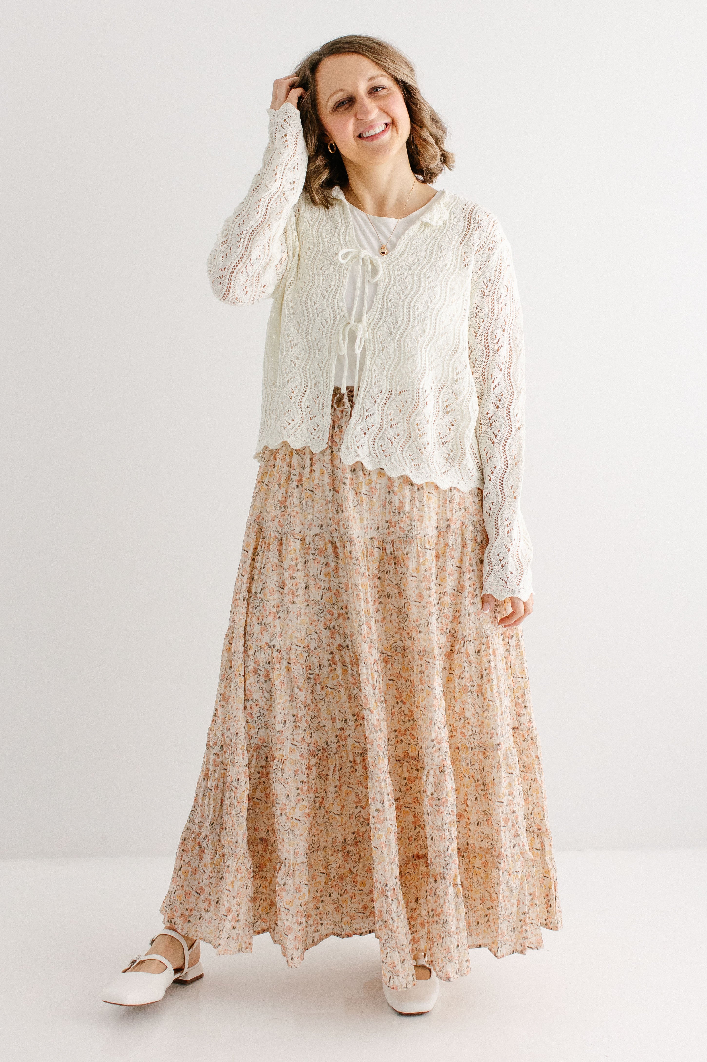 Model wearing the 'Deidra' Tie Front Crochet Cardigan with the 'Paloma' Ditsy Floral Tiered Maxi Skirt
