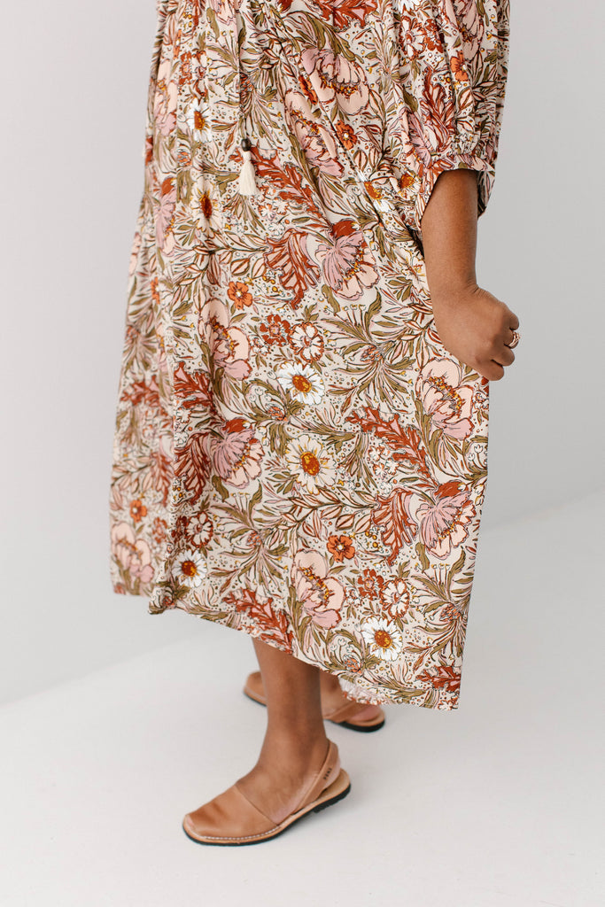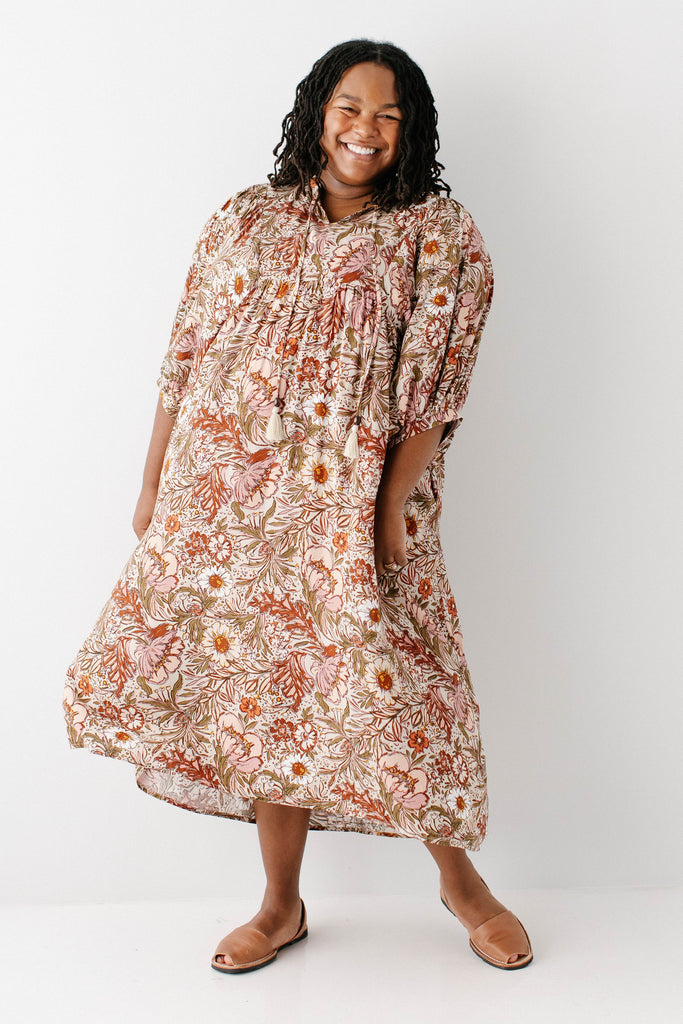 So many things to love about the 'Cianna' Bohemian Floral Midi Dress: the prettiest bohemian floral print, gathered sleeve, and designed in a loose fit. This dress can be worn as is or cinched with a belt! Pair the ‘Cianna’ with boots for the winter or sandals for a spring or summer event.