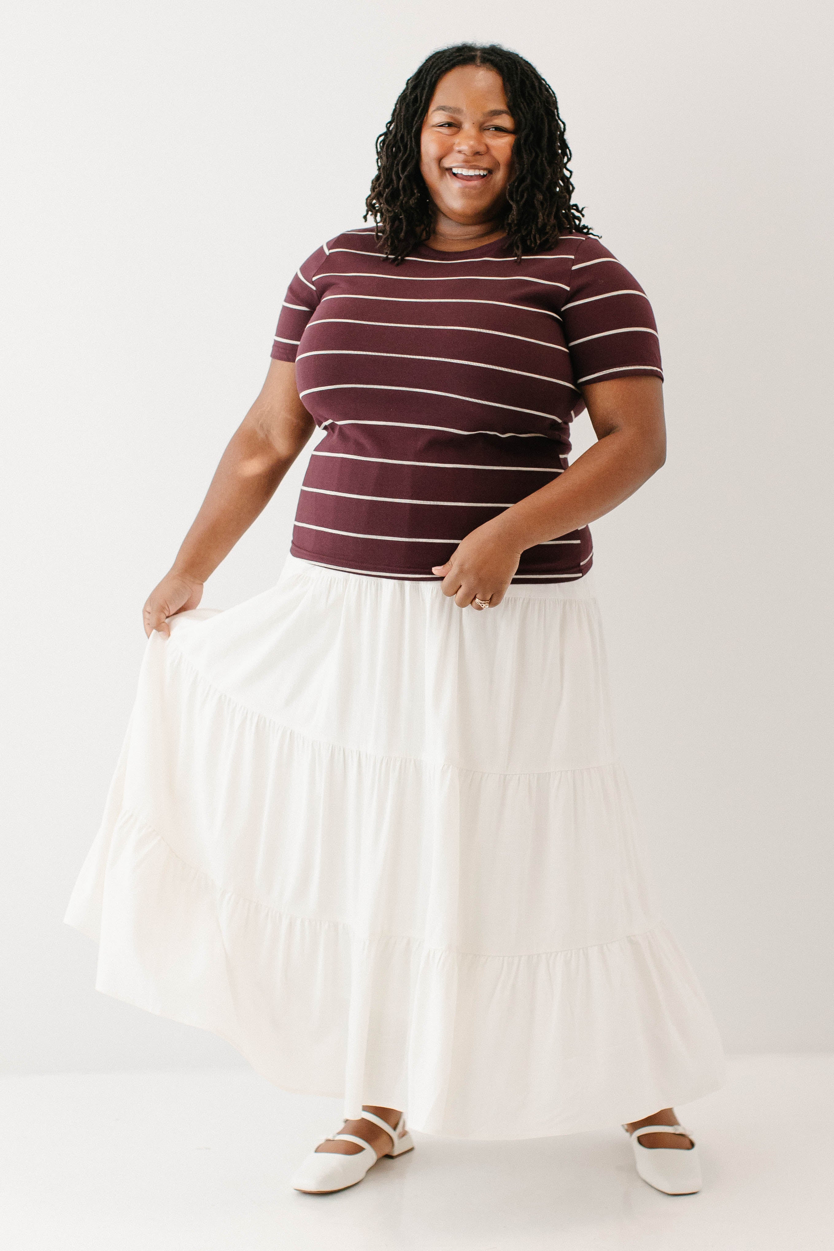 Model wearing the Plus 'Conor' Classic Striped Top with the 'Addison' Tiered Maxi Skirt in White