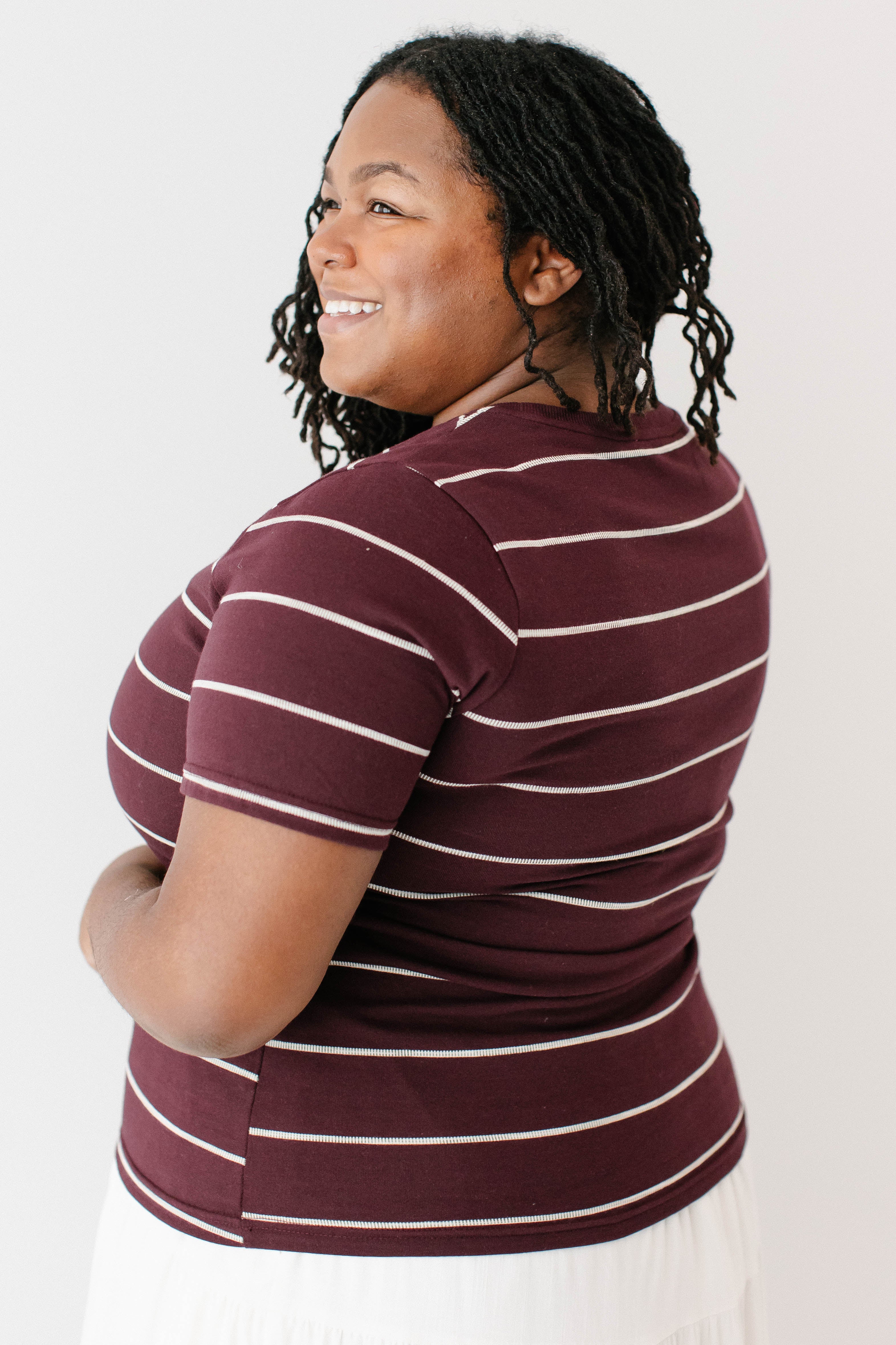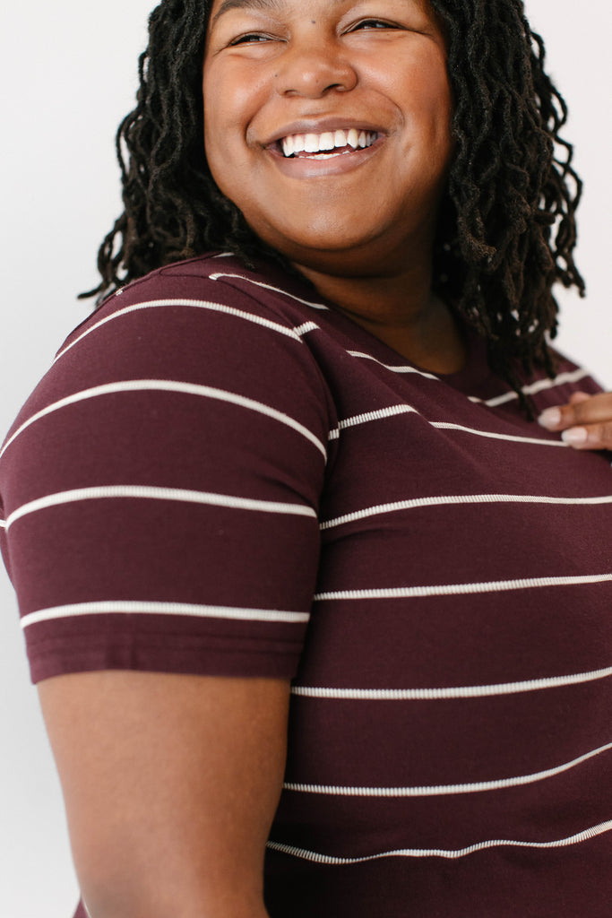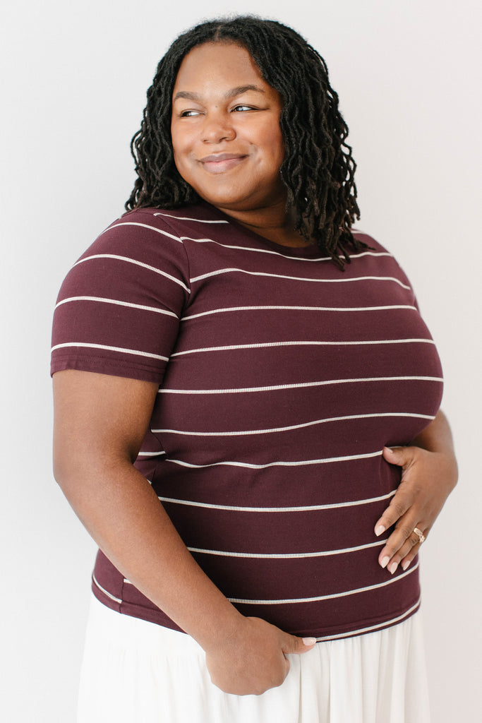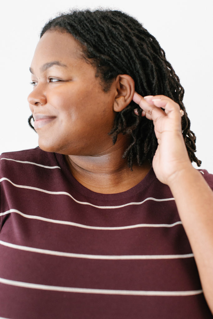 An elevated tee is always a necessity for your wardrobe! The 'Conor' Classic Striped Top is made out of a cotton blend with a scallop stripe detail on a pretty plum background. This is an everyday classic and is perfect for layering or wearing by itself! Pair with your favorite neutral or denim skirt for an easy outfit that will leave you feeling confident for last-minute holiday shopping!