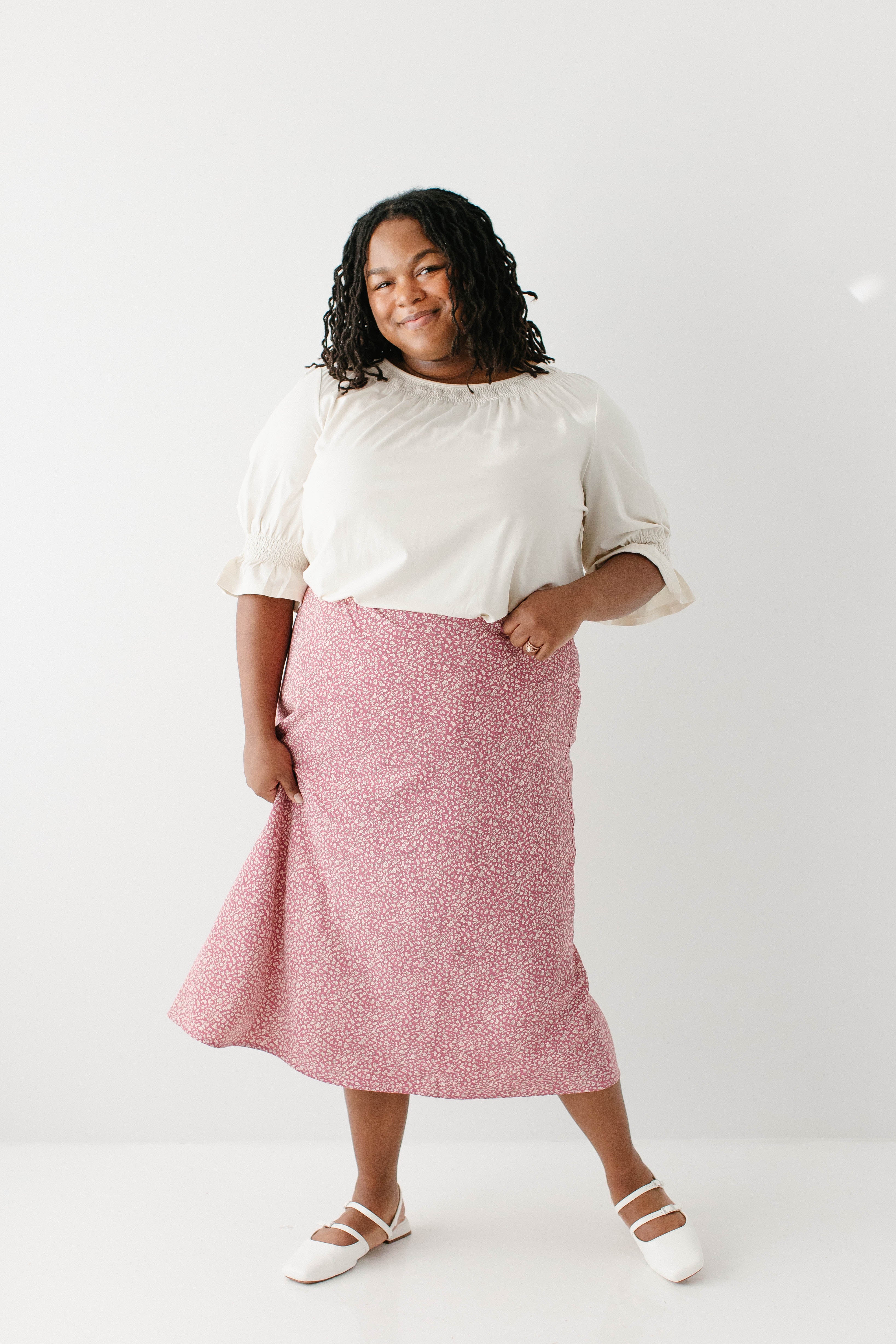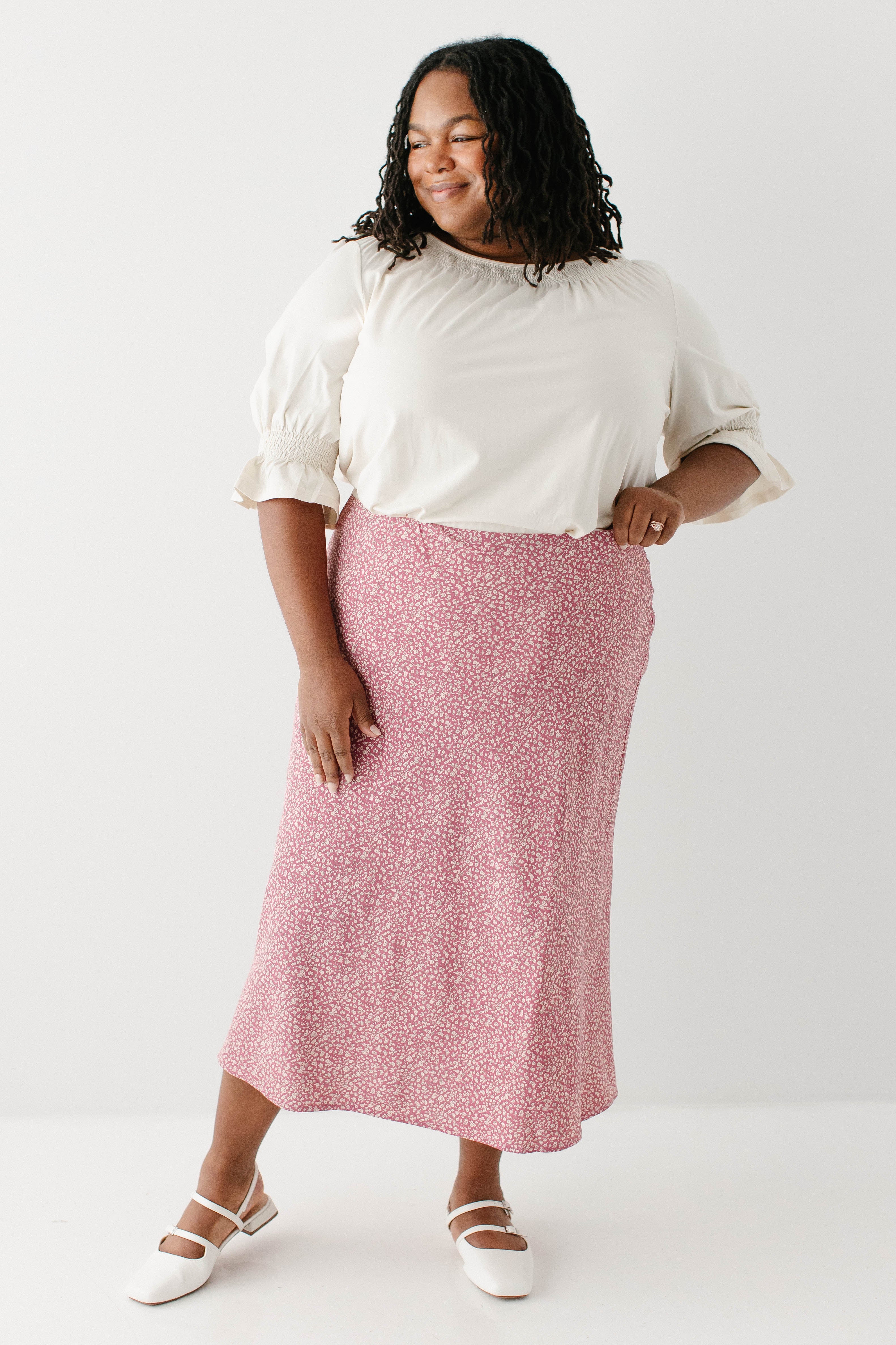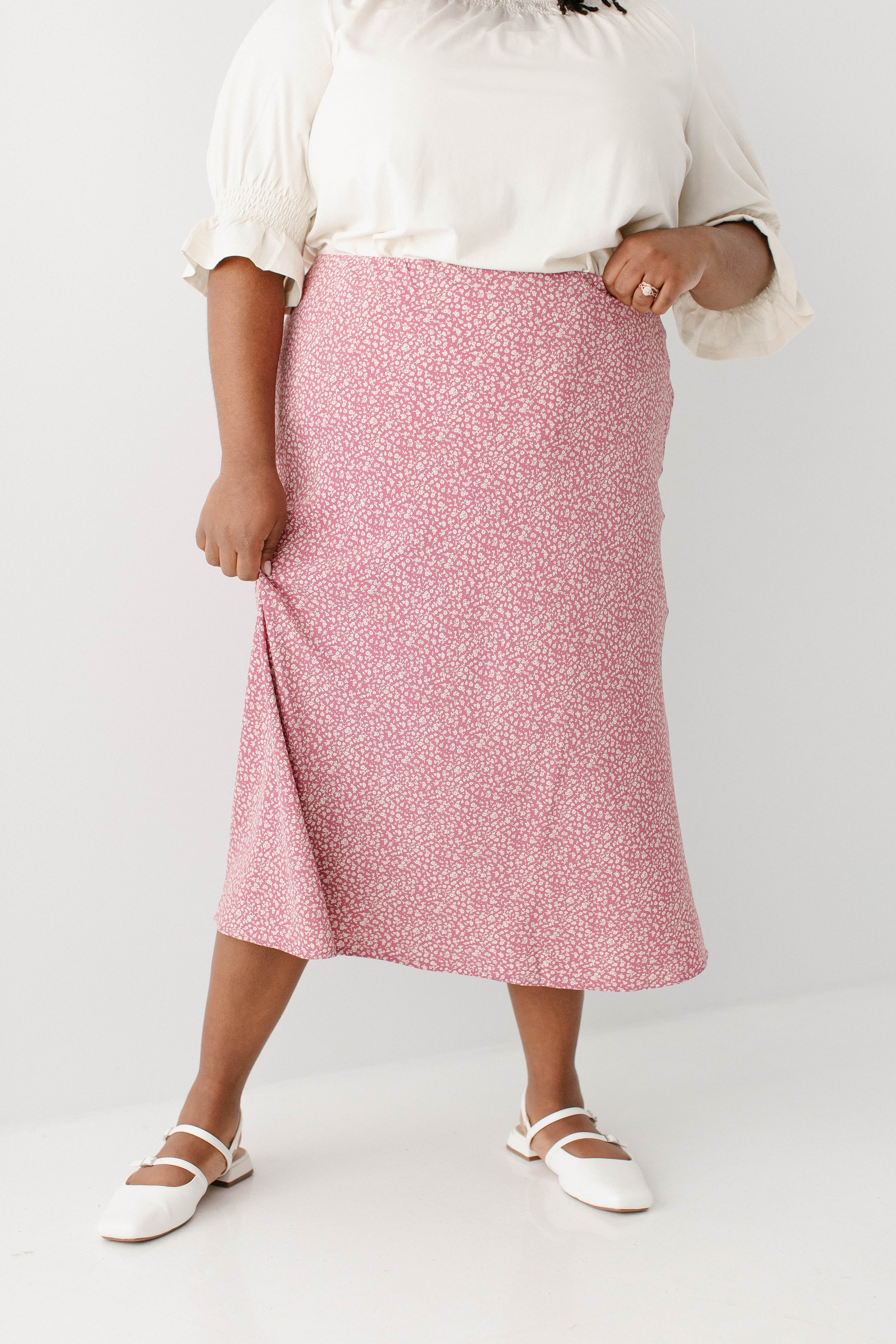 Model in pink wearing the 'Bethany' Luxe Cotton Blend Smocked Detail Top in Cream with the Plus 'Jacinta' Ditsy Floral Slip Skirt in pink