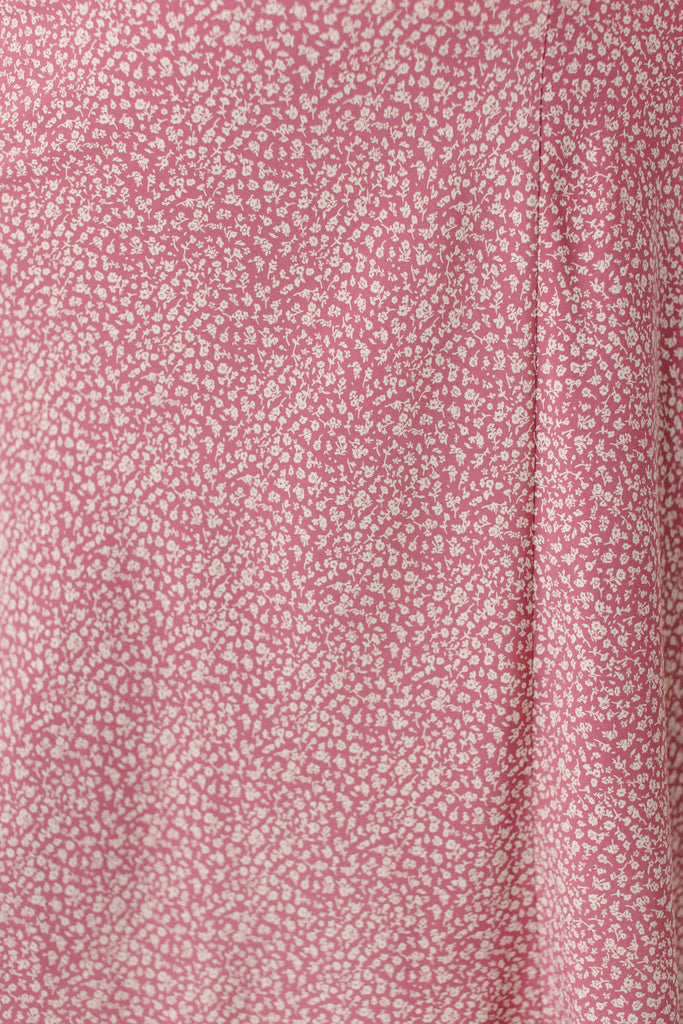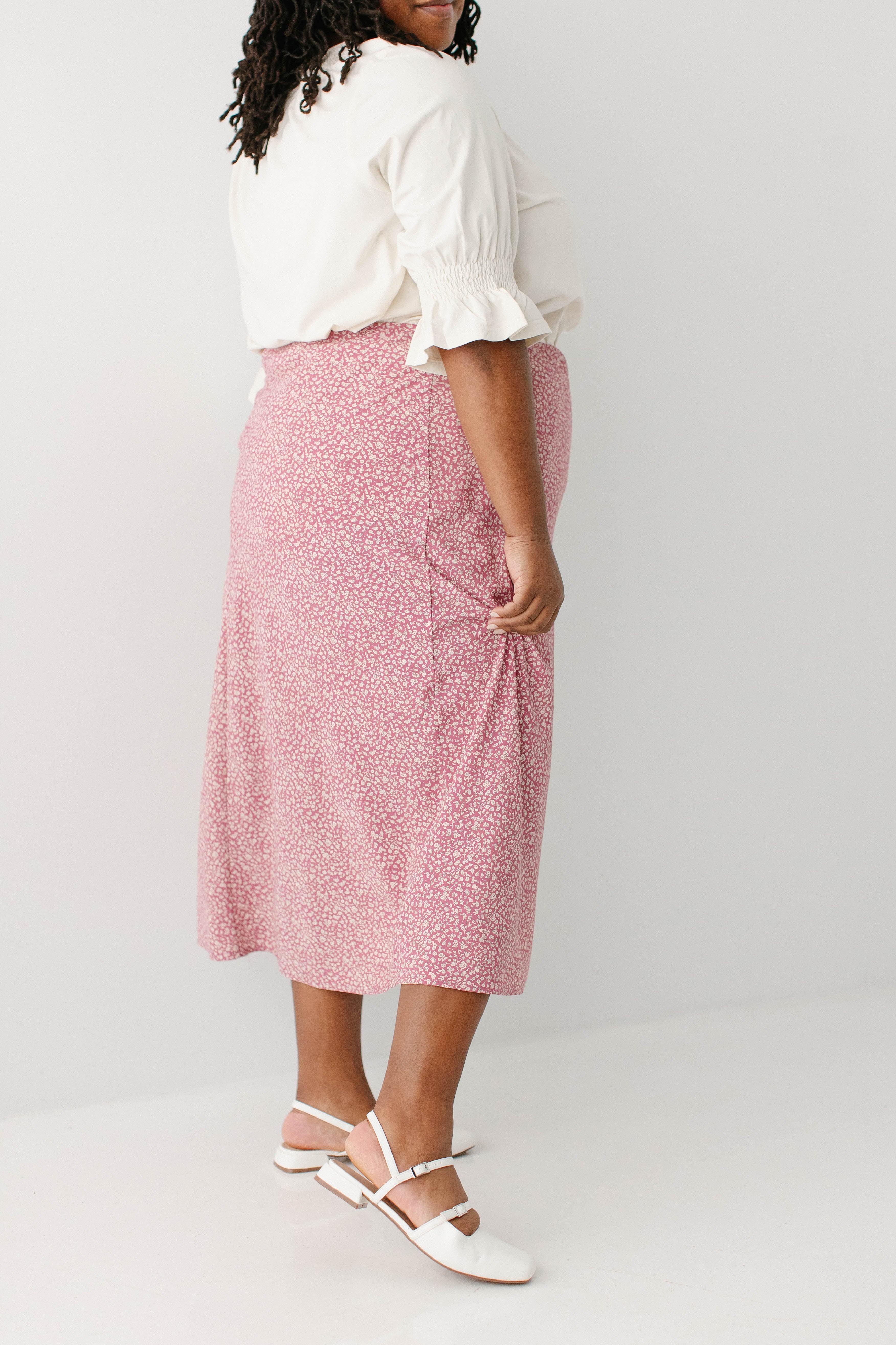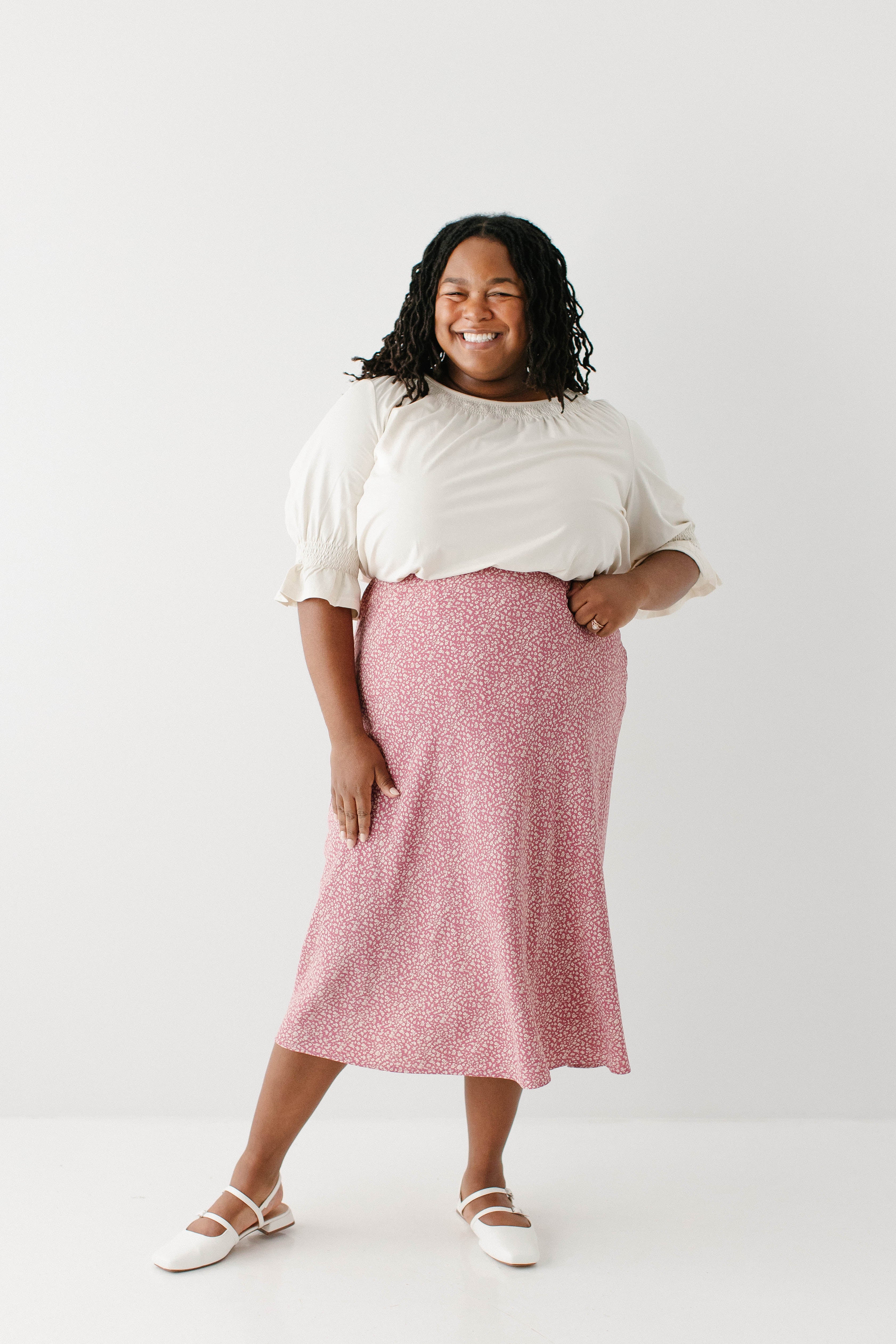 Model in pink wearing the 'Bethany' Luxe Cotton Blend Smocked Detail Top in Cream with the Plus 'Jacinta' Ditsy Floral Slip Skirt in pink