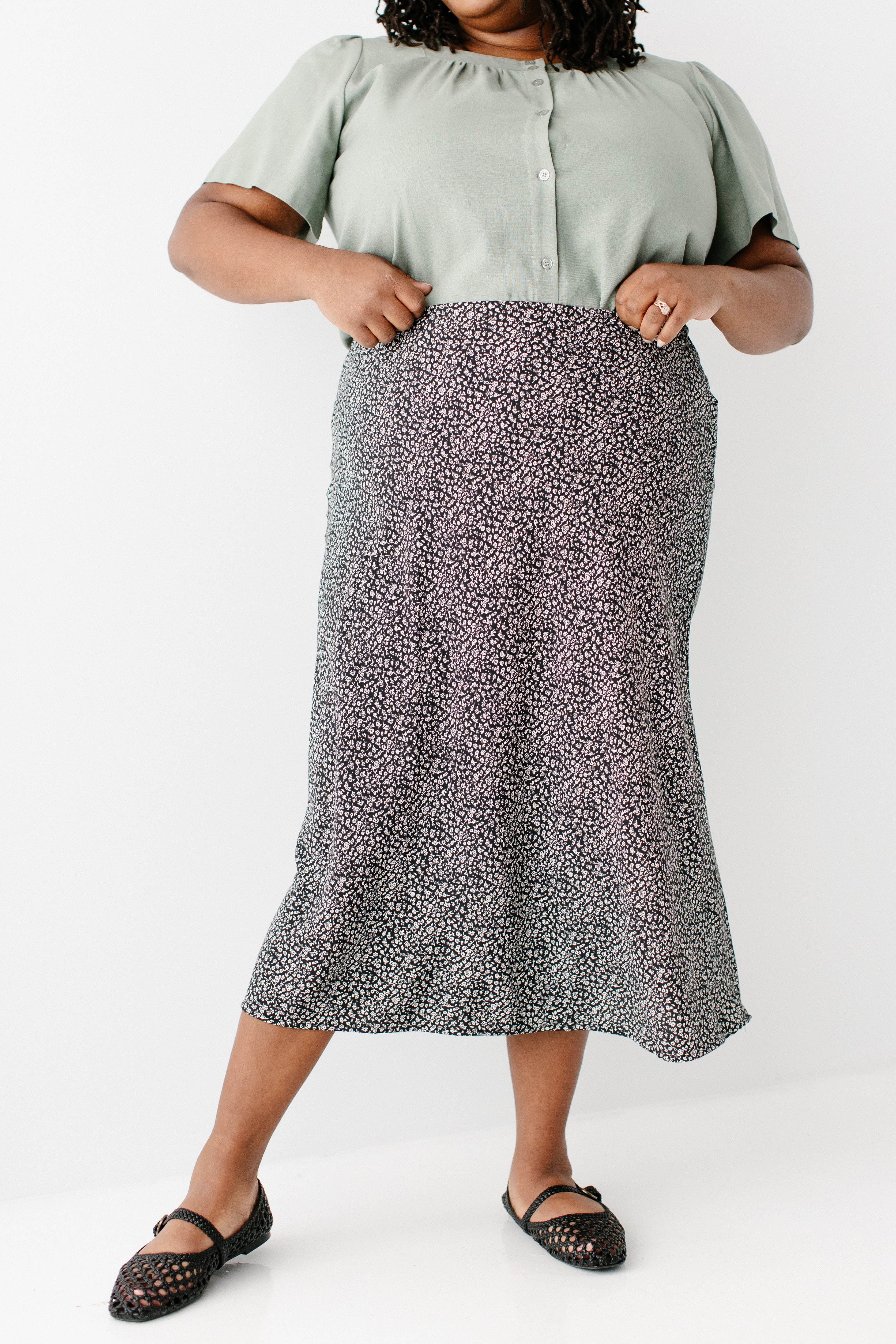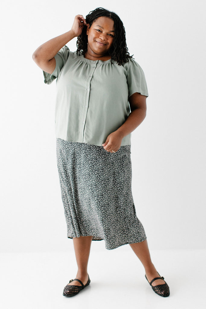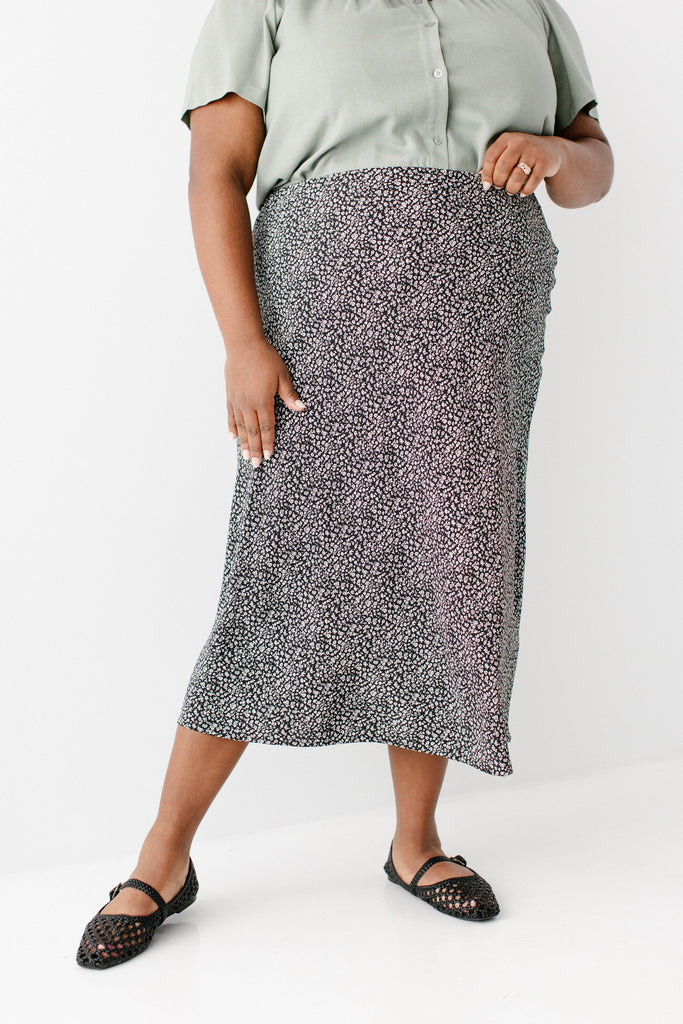 Model in black wearing the 'Sadie' Square Neck Button Down Top (coming soon!) with the Plus 'Jacinta' Ditsy Floral Slip Skirt in black