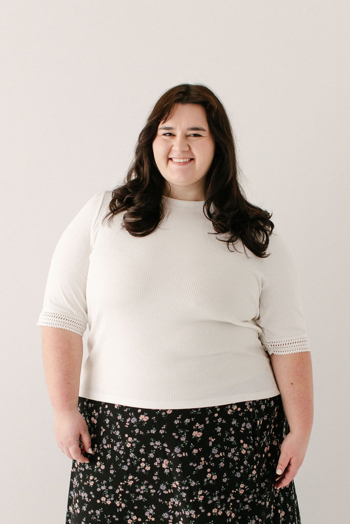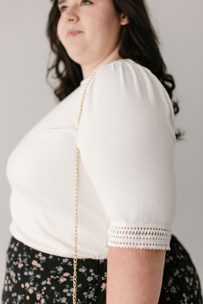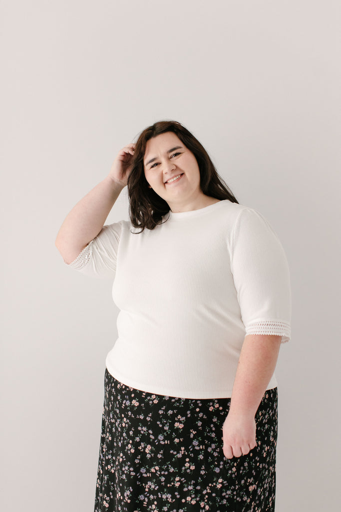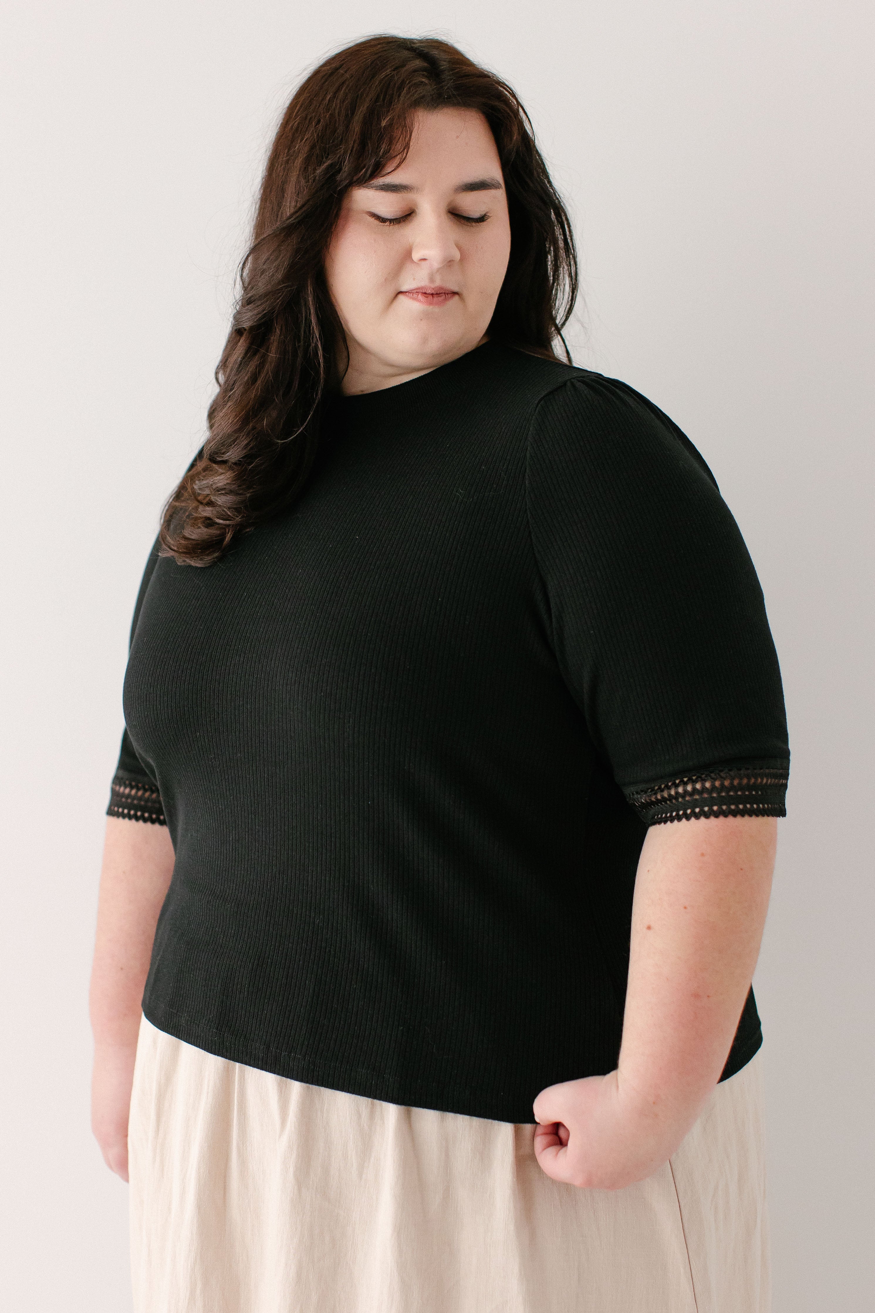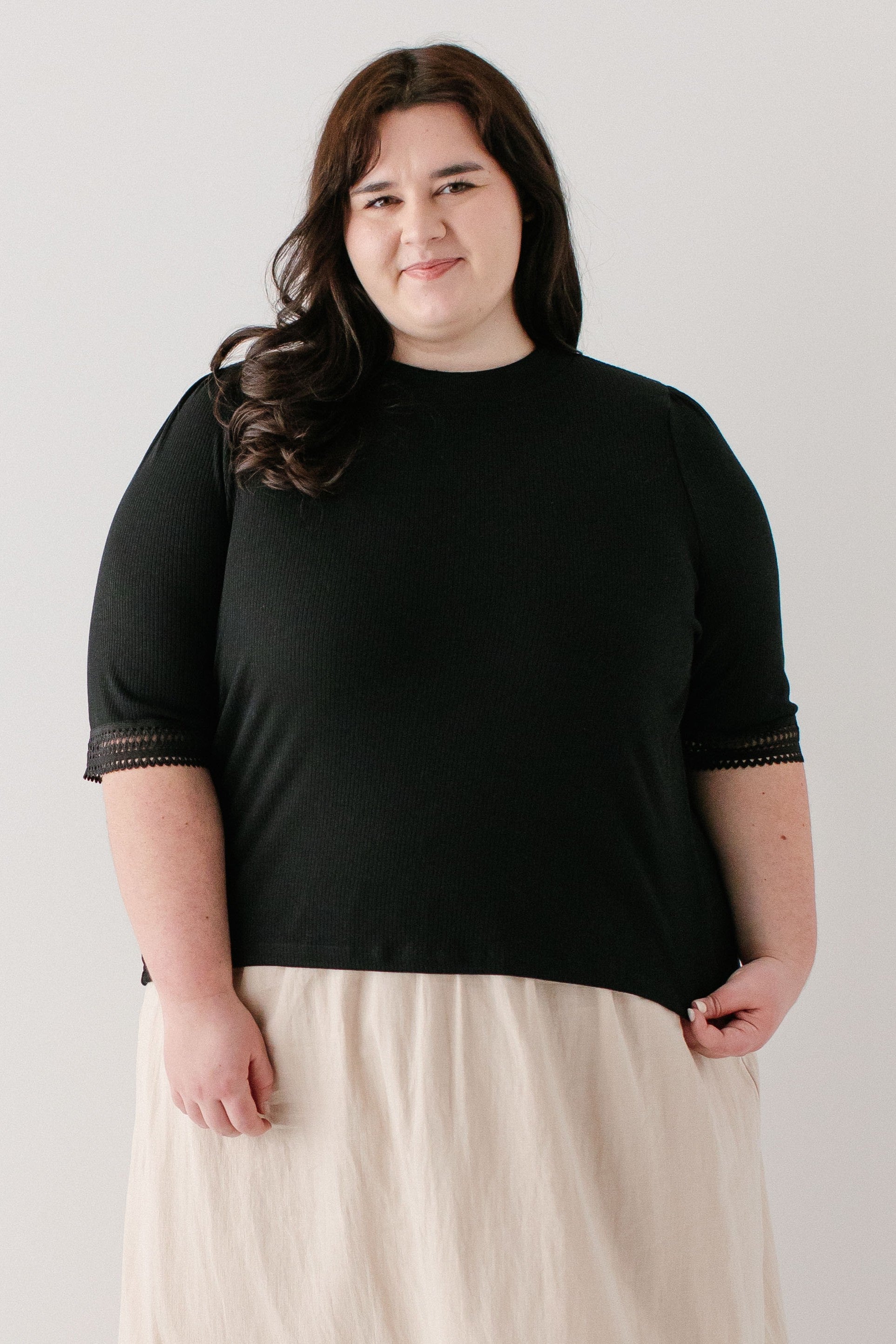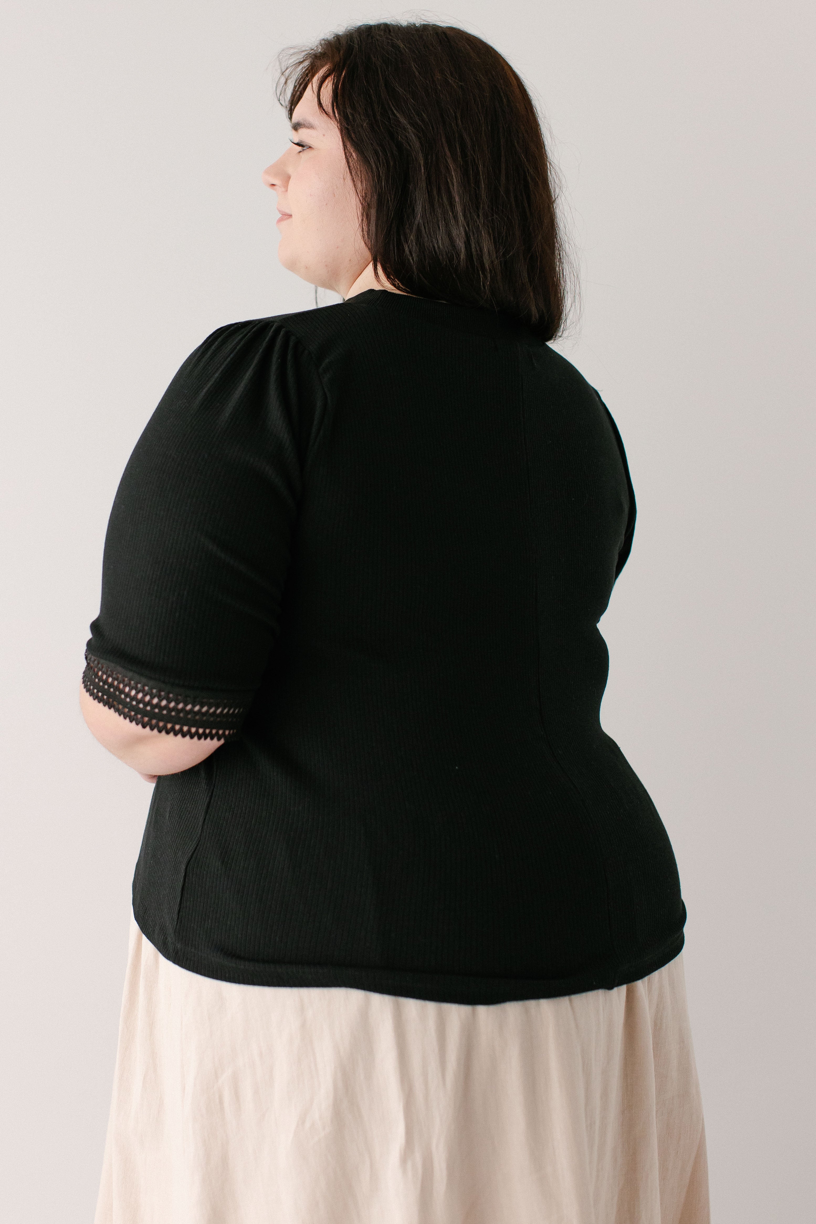 A perfect elevated top is a necessity for every woman’s wardrobe. The Plus 'Onyx' Lace Detail Ribbed Top is made with soft ribbed fabric, a half sleeve with an elegant lace detailing along the edges, and comes in two classic colors: black and white. This is the perfect piece to elevate any everyday look for a day at the office!
