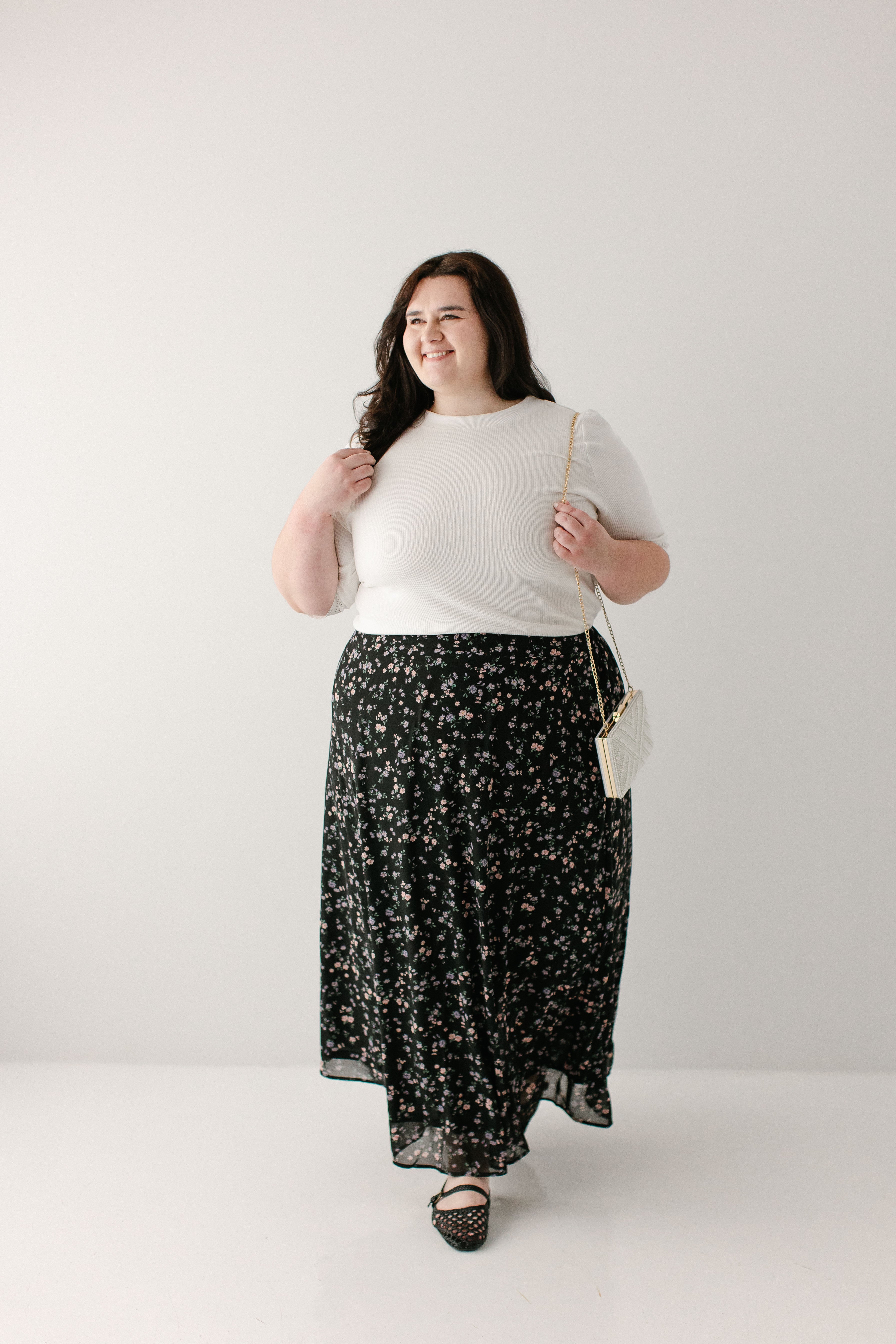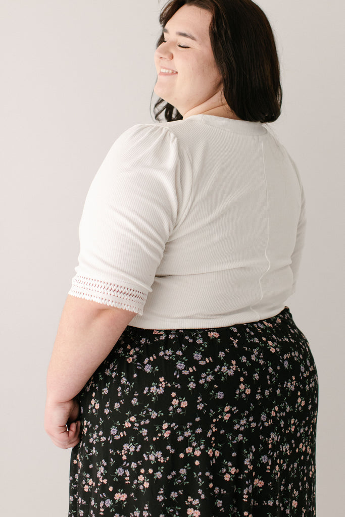 Model wearing the Plus 'Onyx' Lace Detail Ribbed Top in White with the 'Melissa' Floral Maxi Skirt