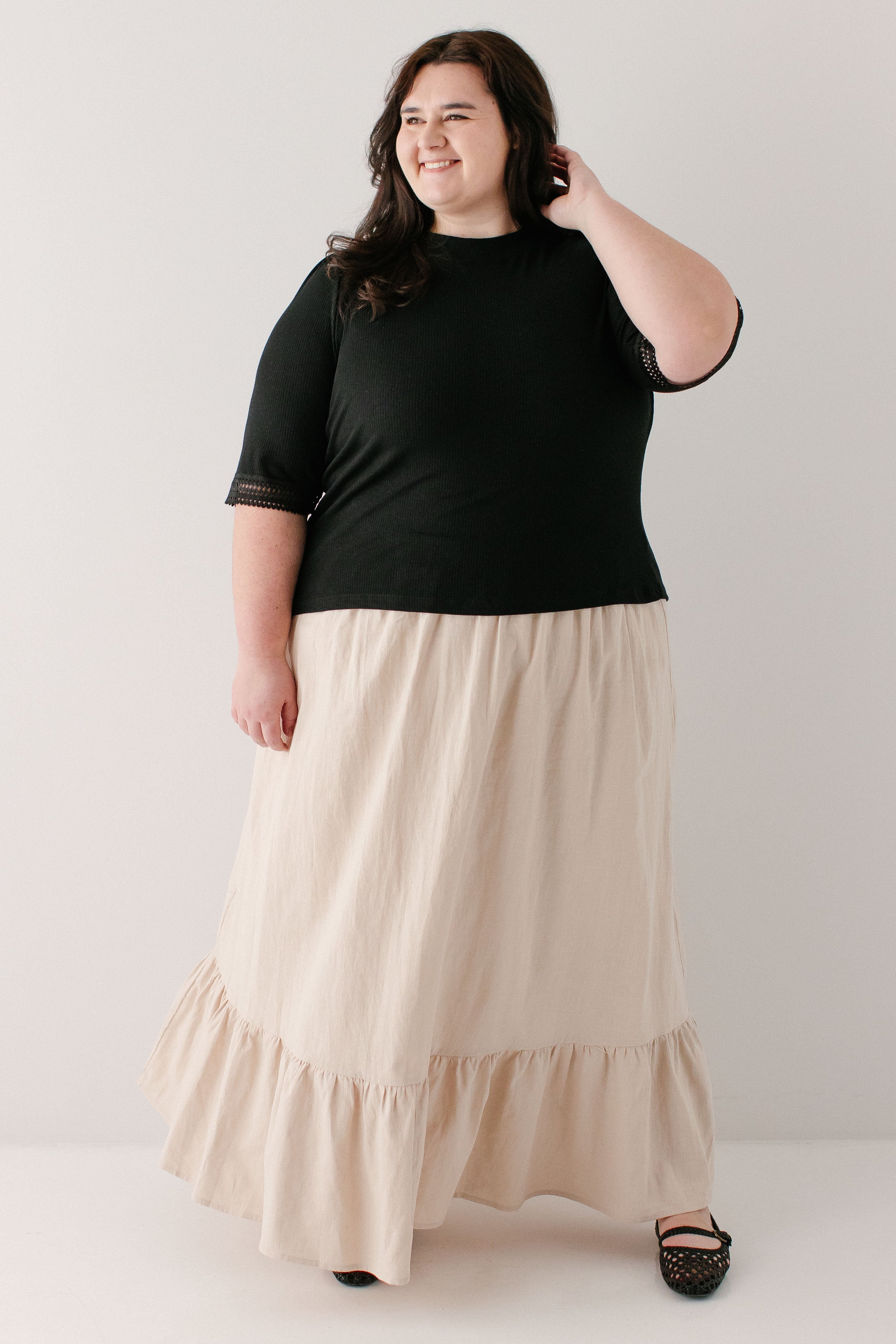 Model wearing the Plus 'Onyx' Lace Detail Ribbed Top in black with the 'Tessa' Ruffle Hem Maxi Skirt in Light Tan