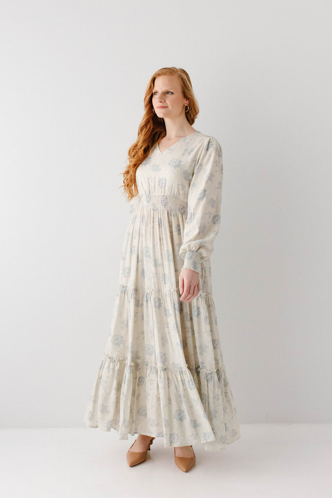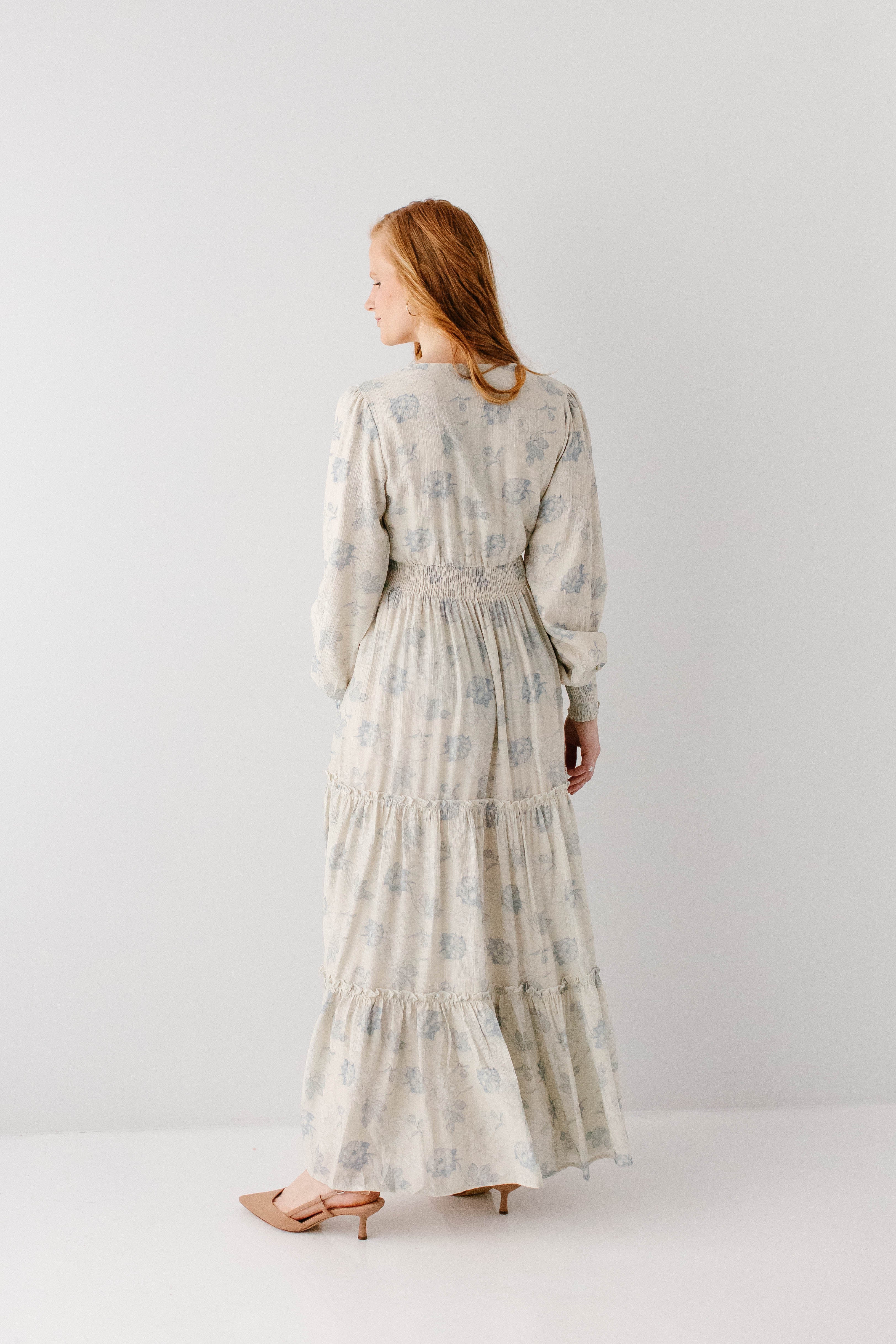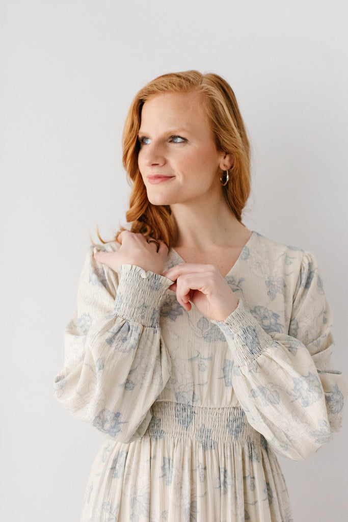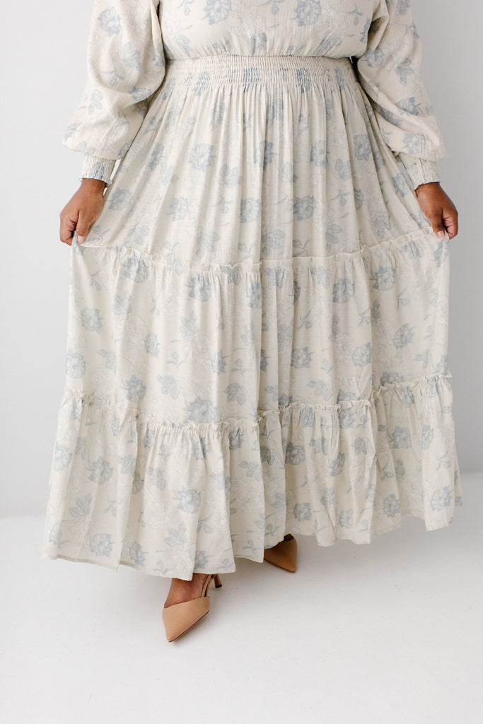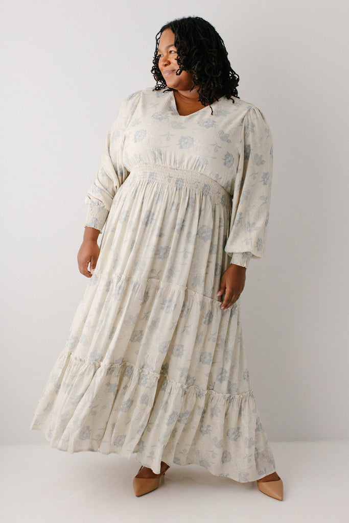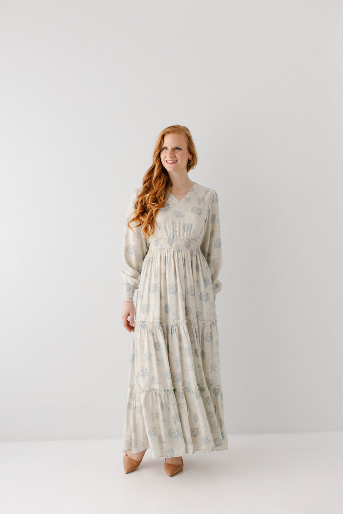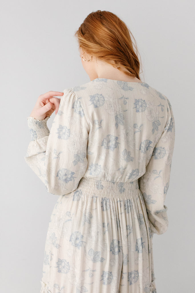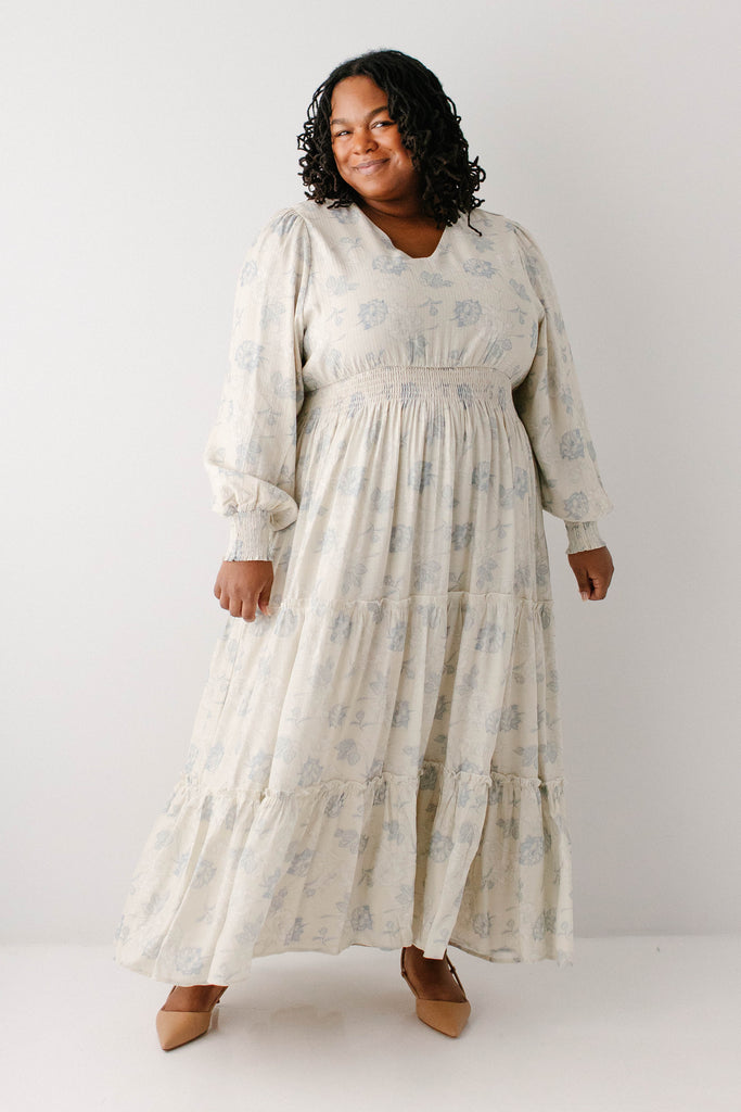 Elegant and elevated, that was the vision behind the 'Poetry' Dusty Floral Tiered Maxi Dress! Featuring dusty blue rose floral print, long sleeves with smocked wrist detail, tiered maxi skirt, wide elastic waistband, maternity/bump friendly, and full lining, this dress is a beautiful outfit in and of itself.