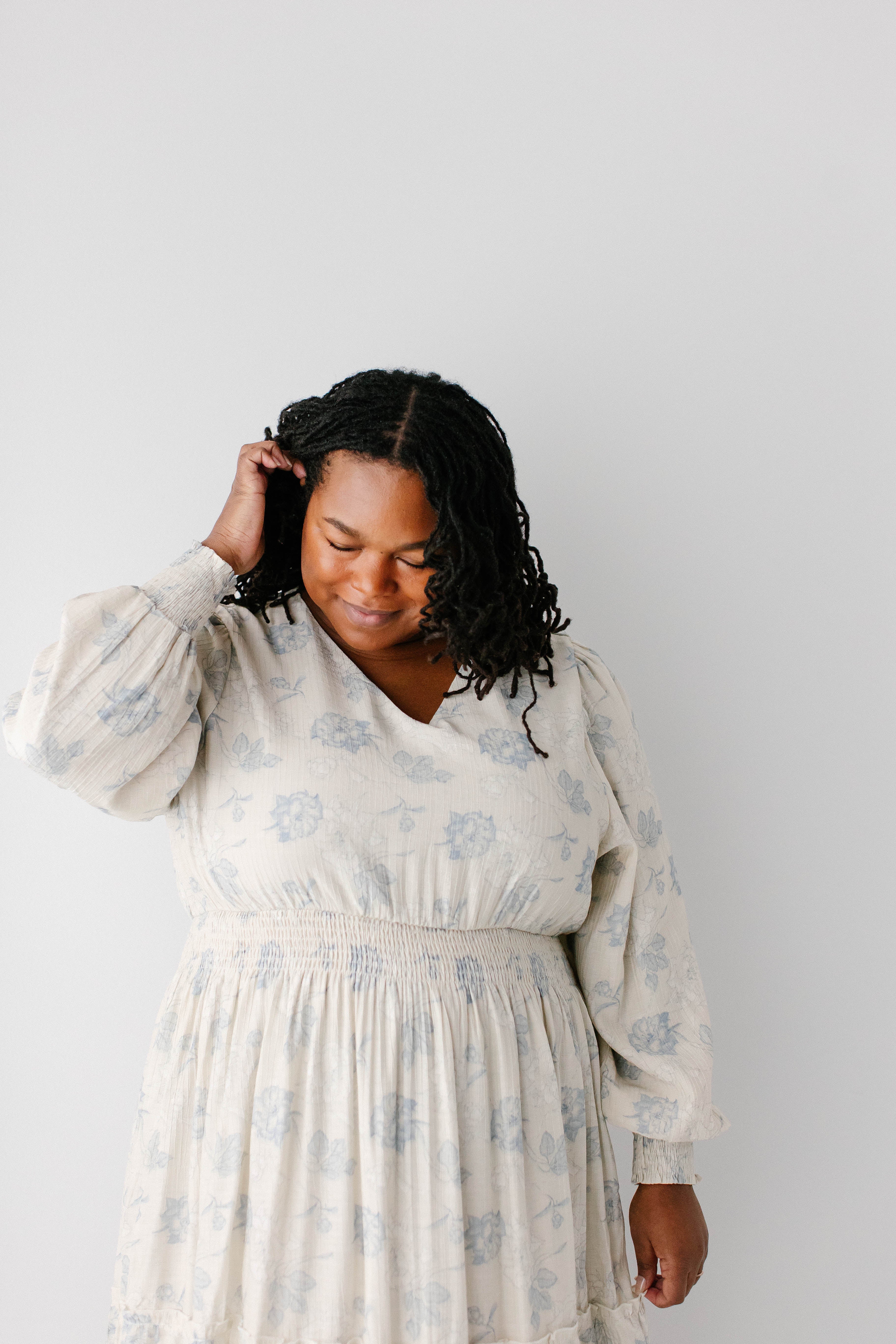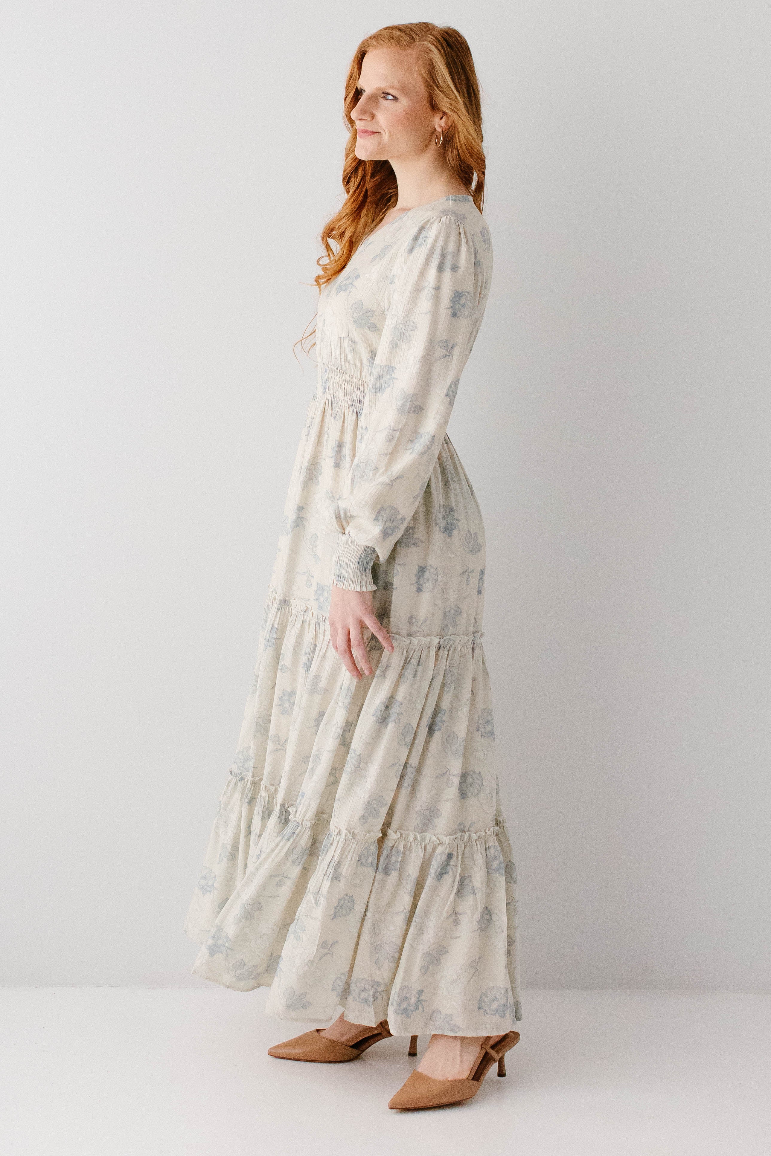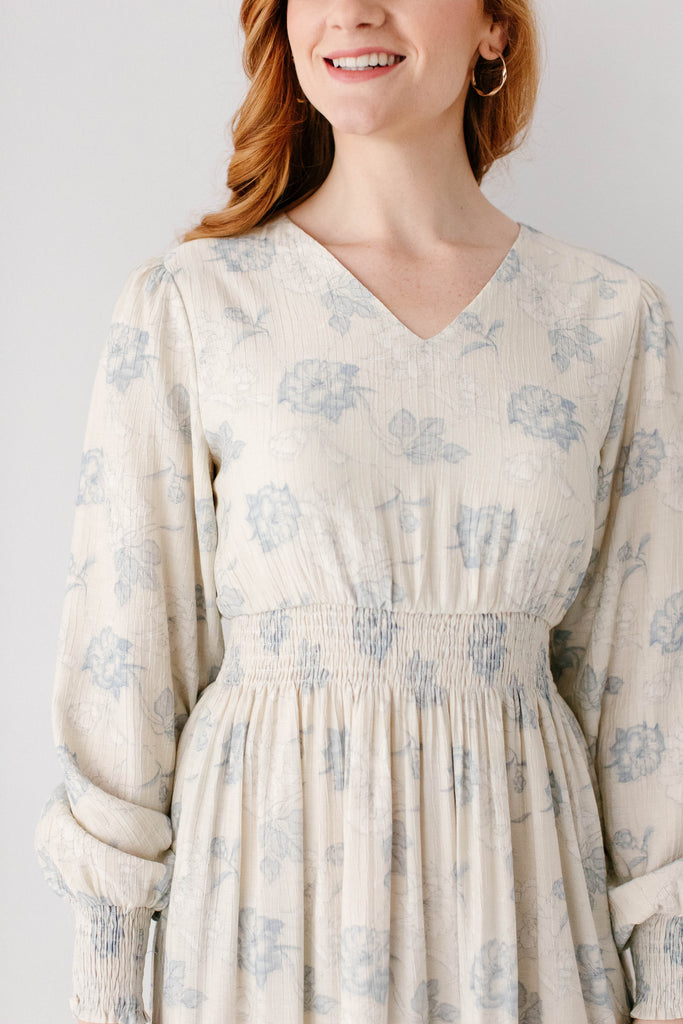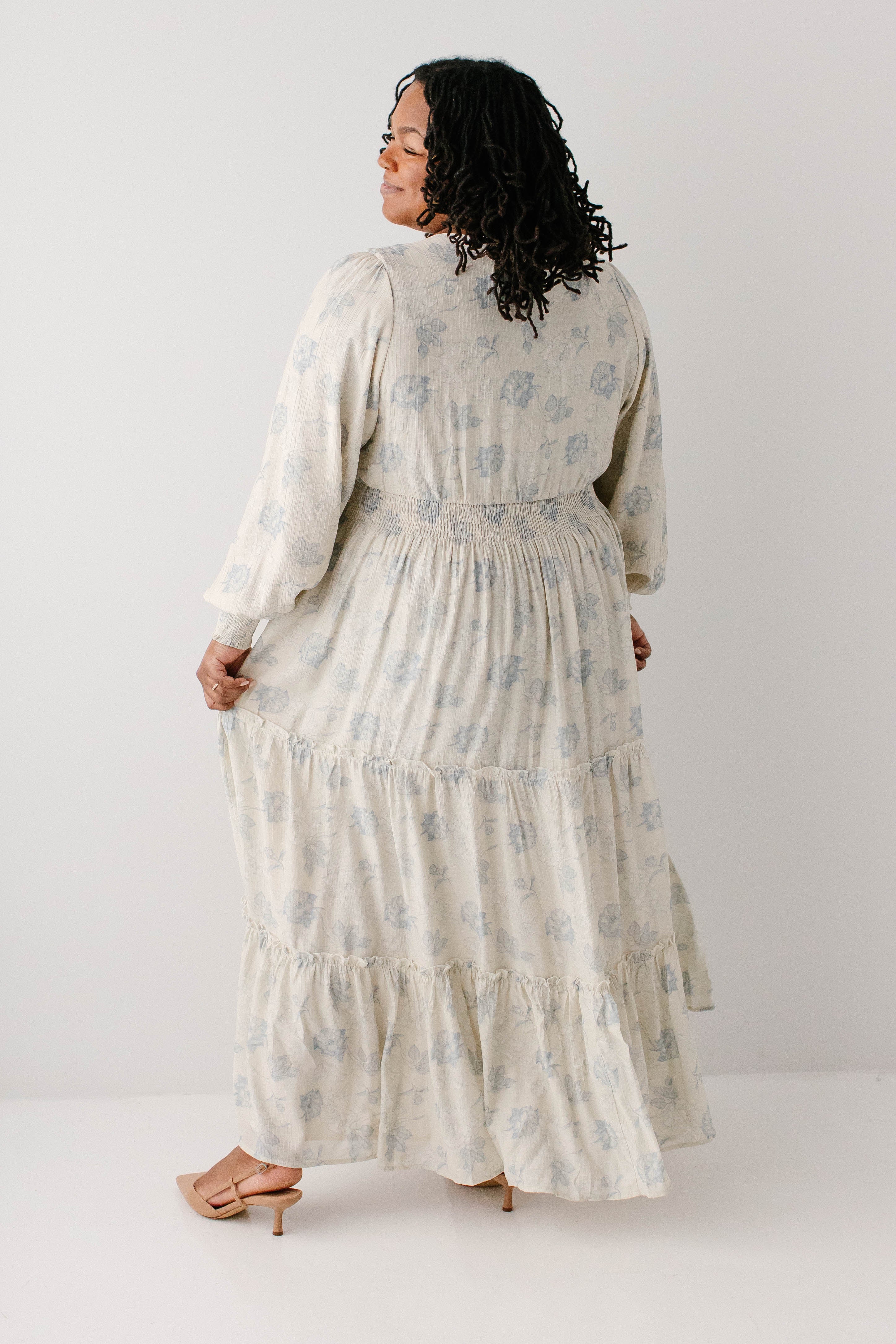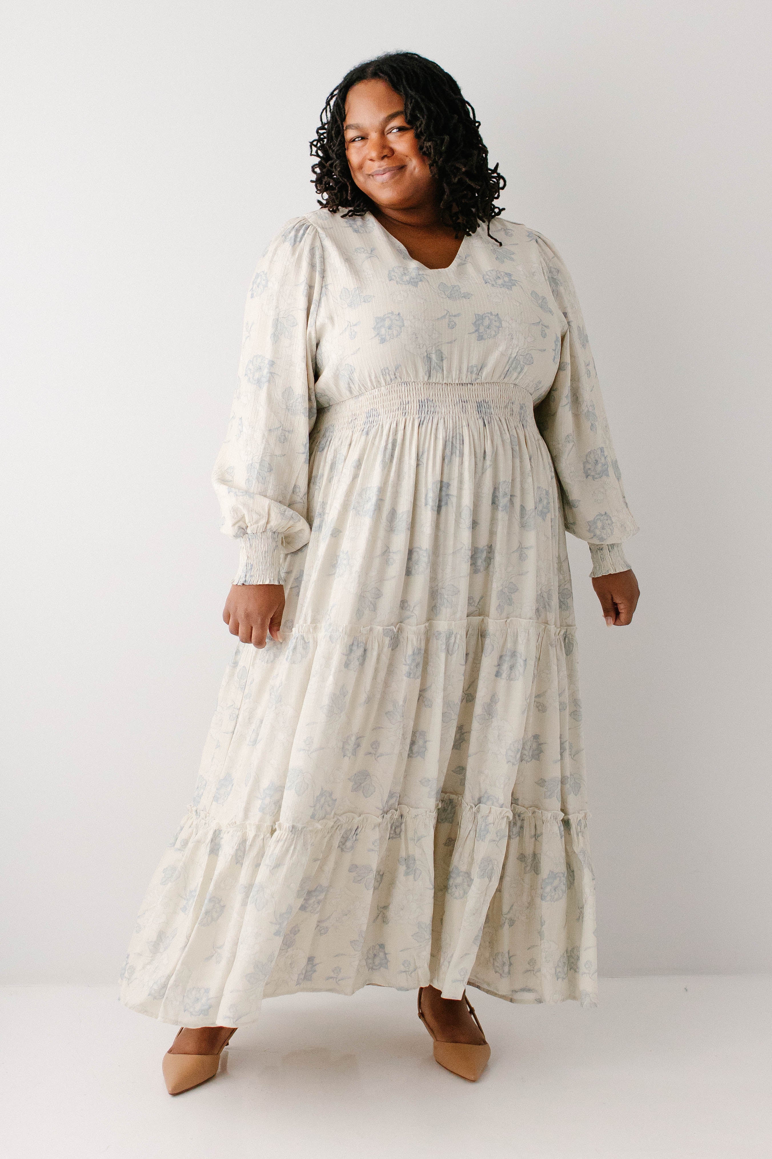 Elegant and elevated, that was the vision behind the 'Poetry' Dusty Floral Tiered Maxi Dress! Featuring dusty blue rose floral print, long sleeves with smocked wrist detail, tiered maxi skirt, wide elastic waistband, maternity/bump friendly, and full lining, this dress is a beautiful outfit in and of itself.