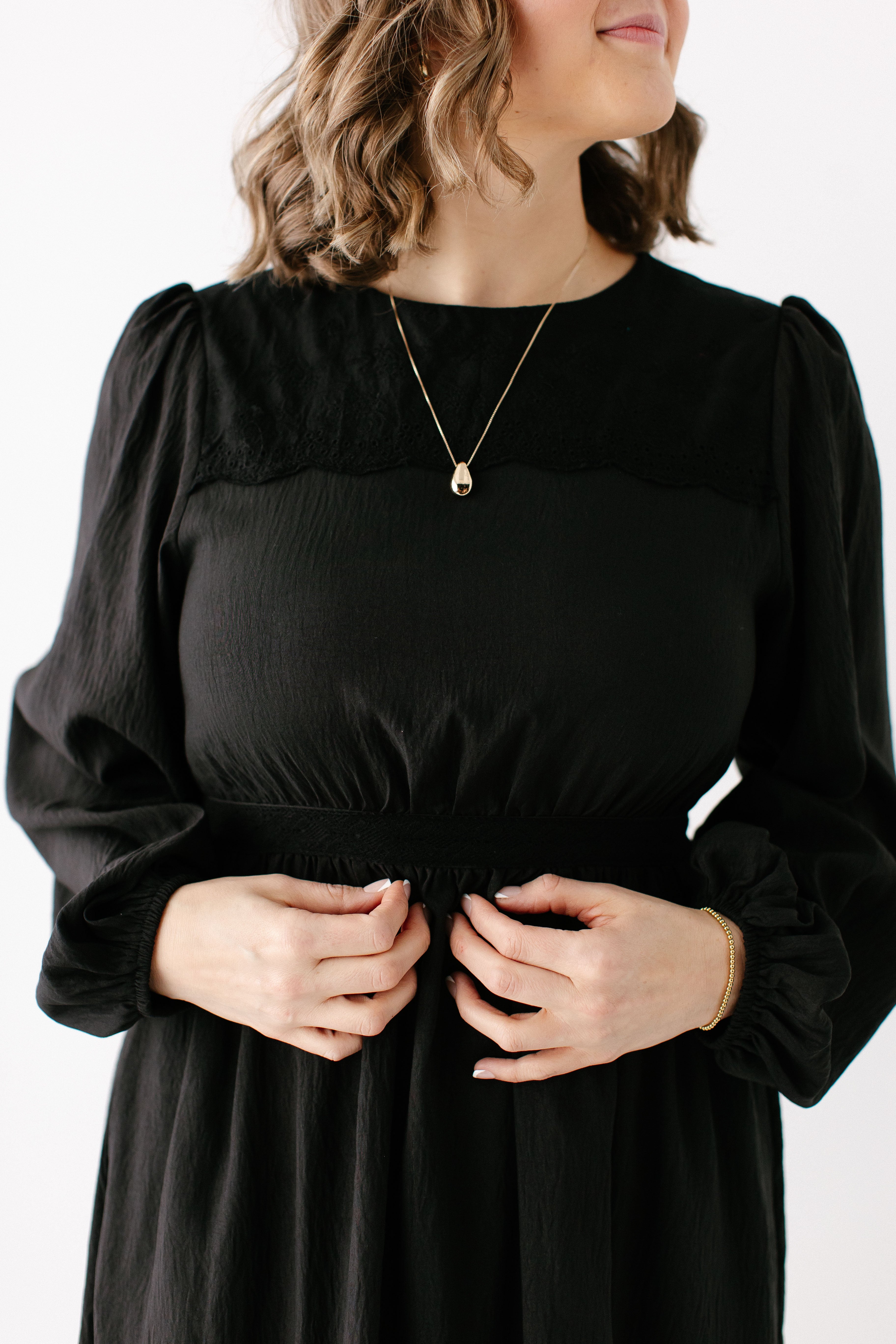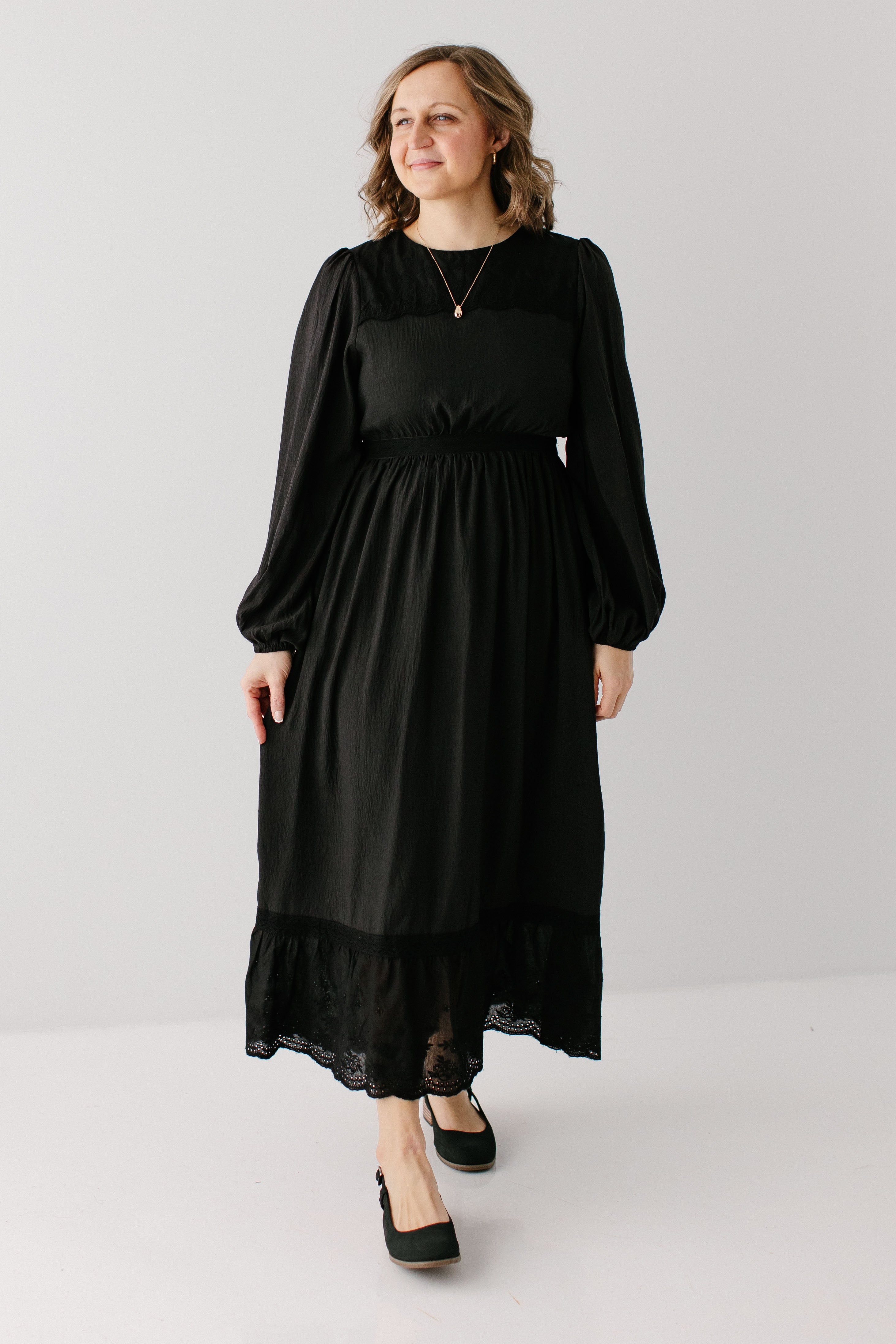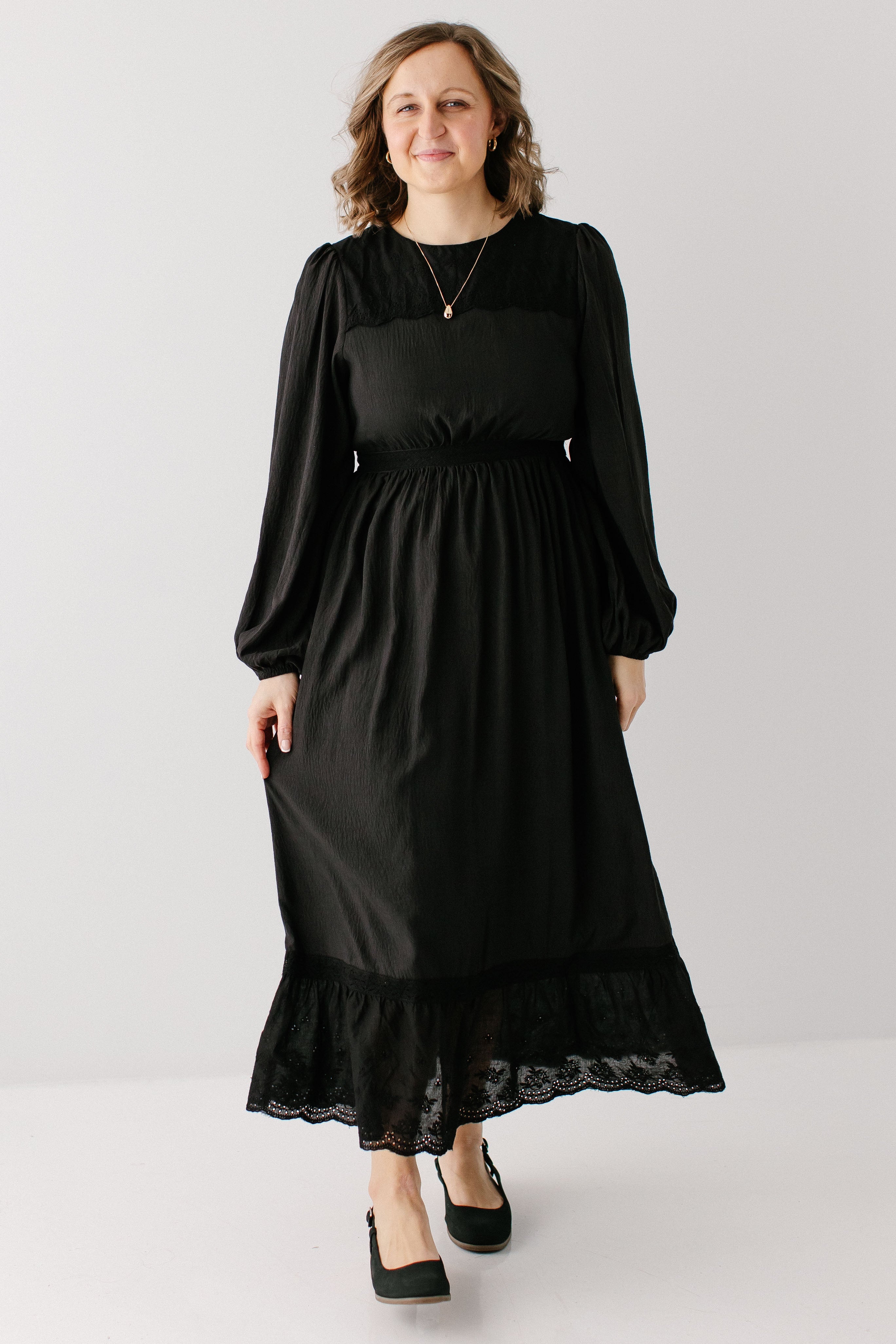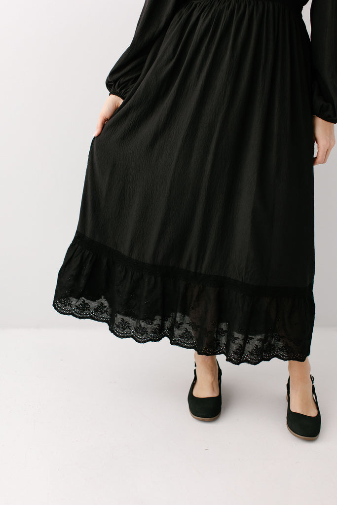 A classy black dress is guaranteed to be the most-loved item in your closet. The 'Prestyn' Eyelet Detail Maxi Dress has trending yet classic details, such as a modest neckline and long sleeves, eyelet detailing along the top of the bodice and skirt hem, and partial elastic waistband. Dress the ‘Prestyn’ up with some black kitten heels for an elevated date night look!