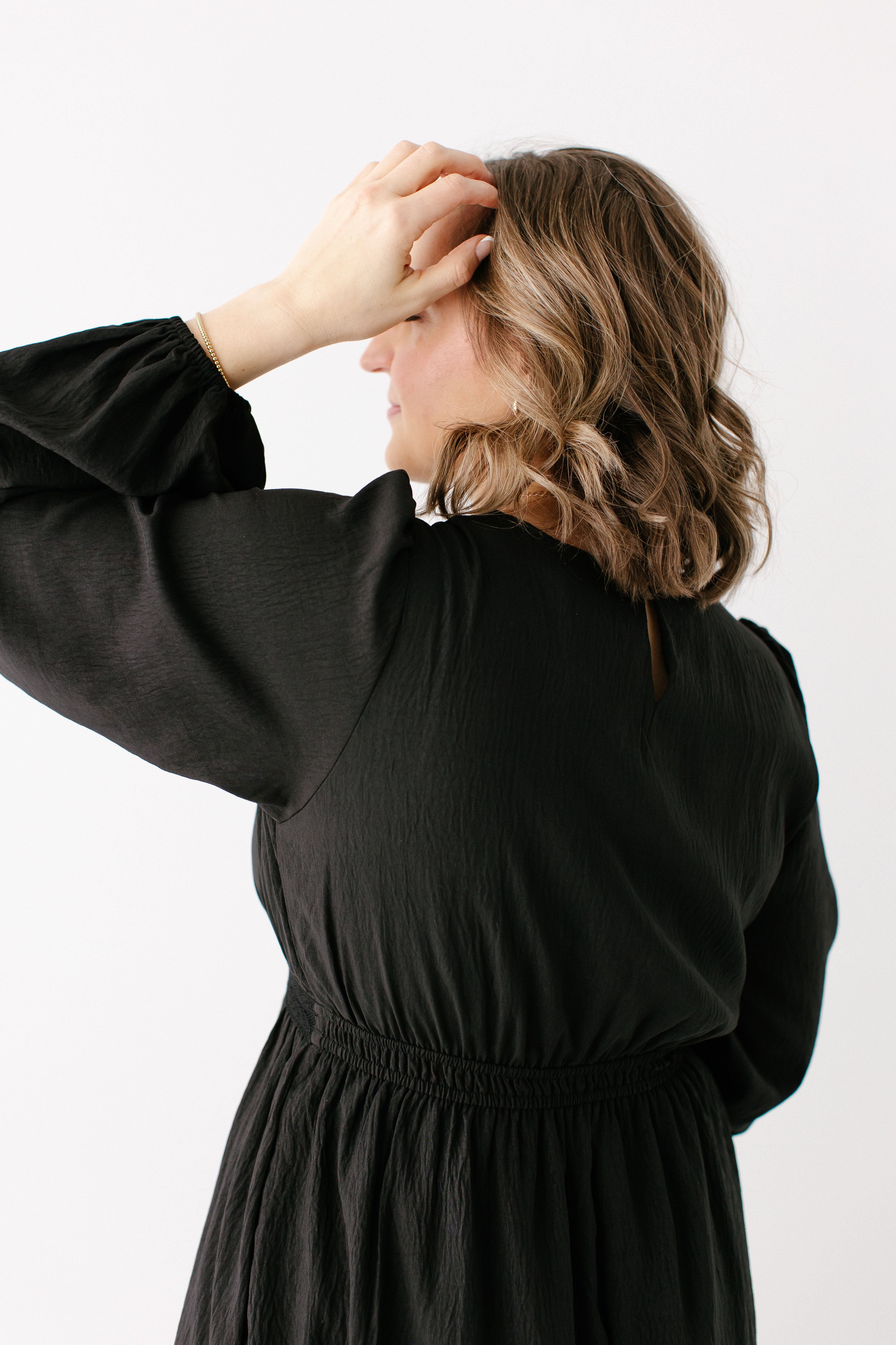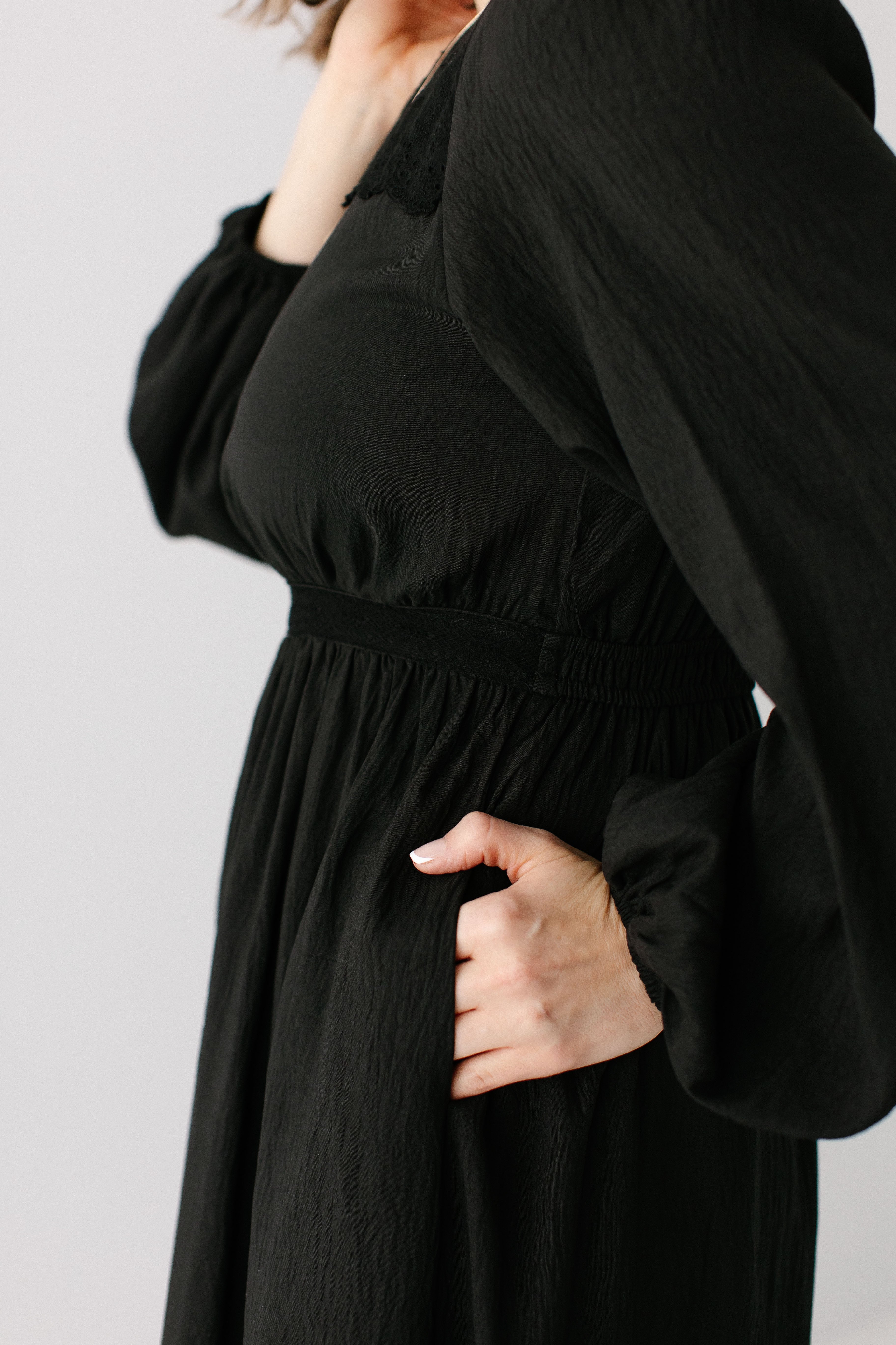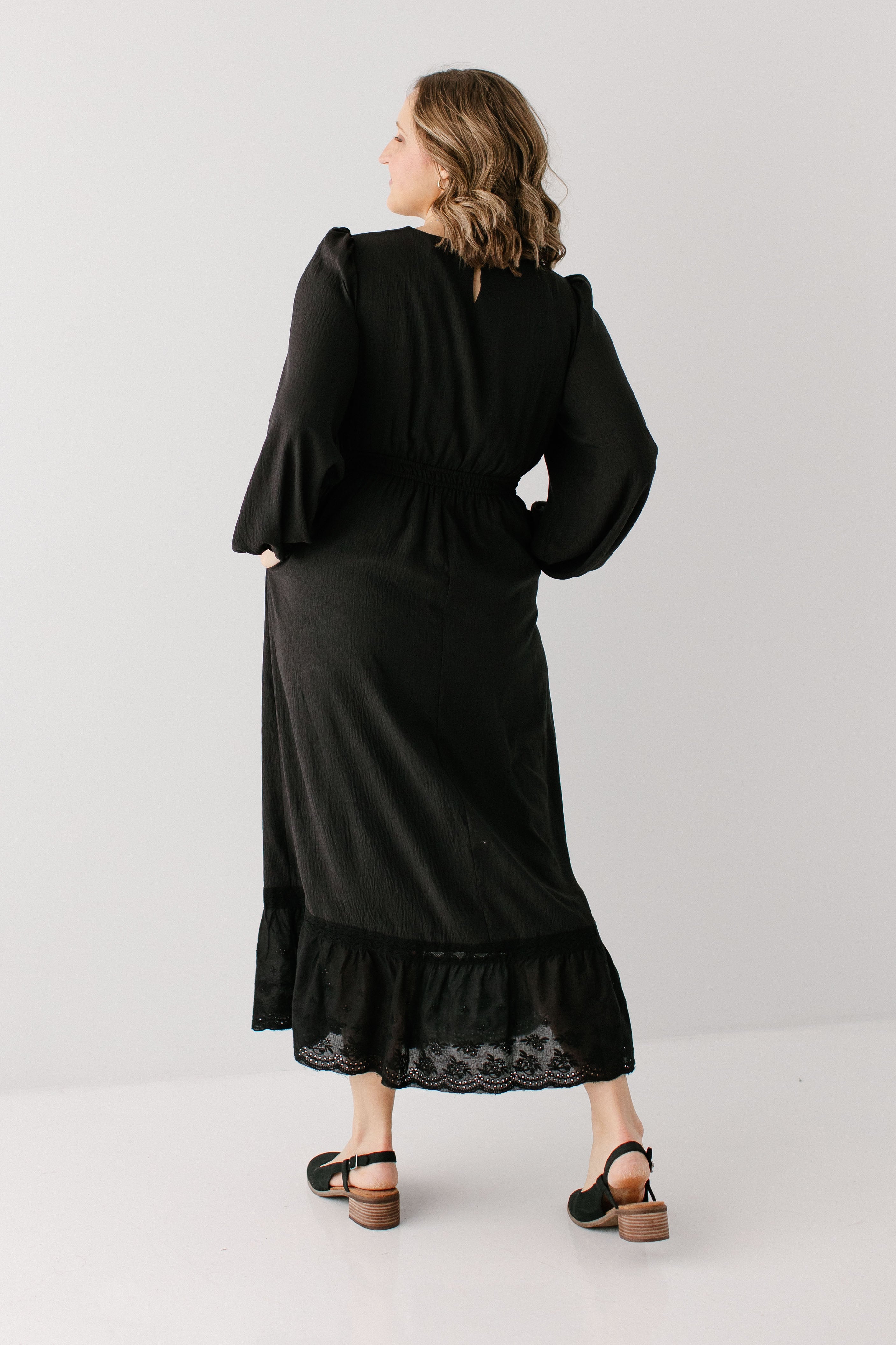 A classy black dress is guaranteed to be the most-loved item in your closet. The 'Prestyn' Eyelet Detail Maxi Dress has trending yet classic details, such as a modest neckline and long sleeves, eyelet detailing along the top of the bodice and skirt hem, and partial elastic waistband. Dress the ‘Prestyn’ up with some black kitten heels for an elevated date night look!