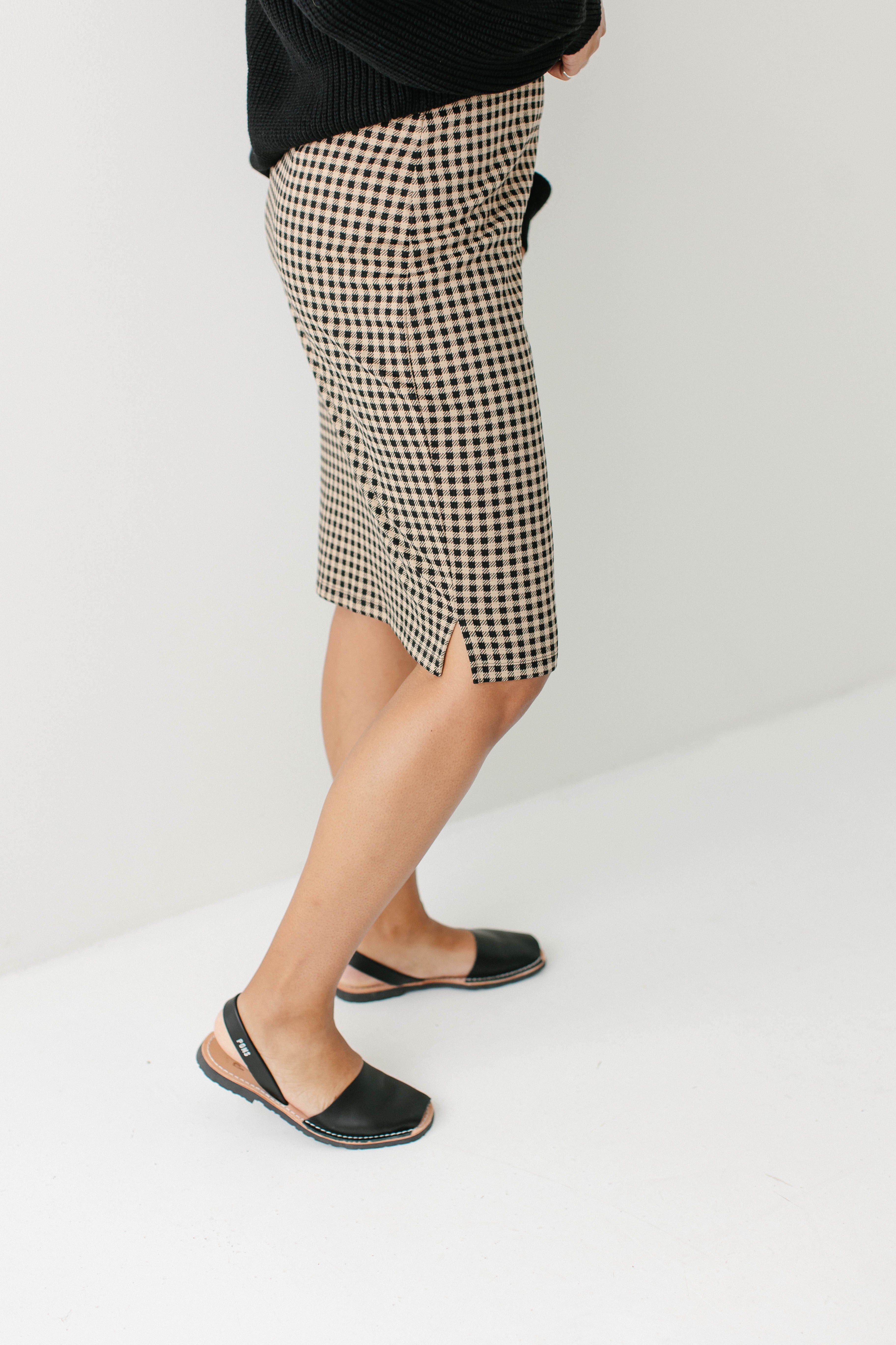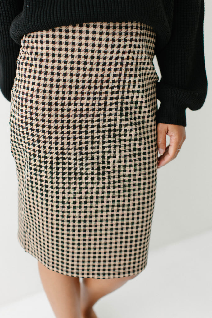 Introducing the 'Priscilla' Black Checkered Plaid Pencil Skirt - your next favorite pencil skirt! With delicate checkered print on a taupe background, black elastic waistband, and subtle side slits, this is the perfect skirt to pair with a neutral sweater and loafers for your next work meeting!