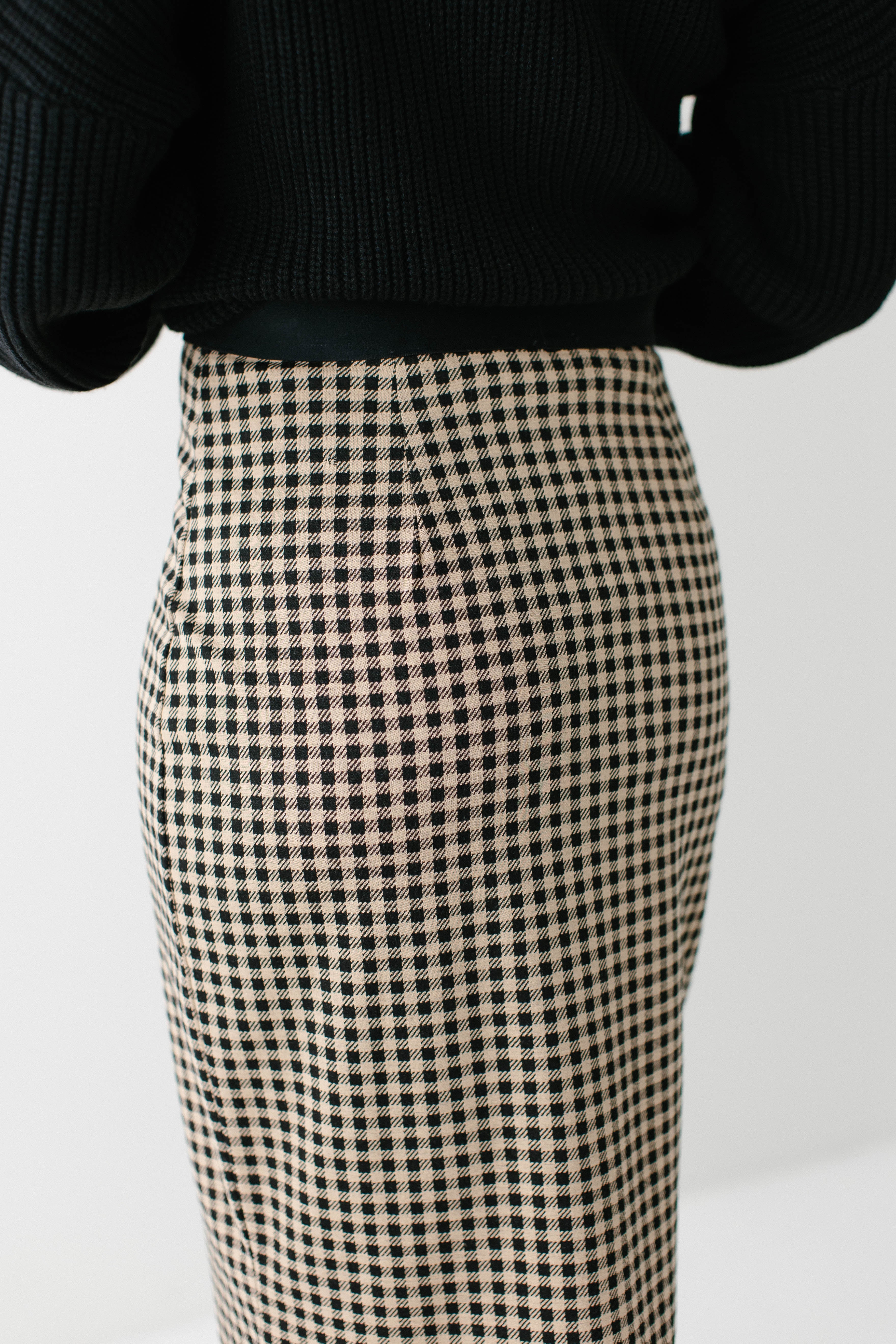 Model wearing the 'Jordyn' Drop Sleeve Sweater in Black with the 'Priscilla' Black Checkered Plaid Pencil Skirt