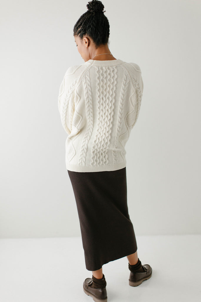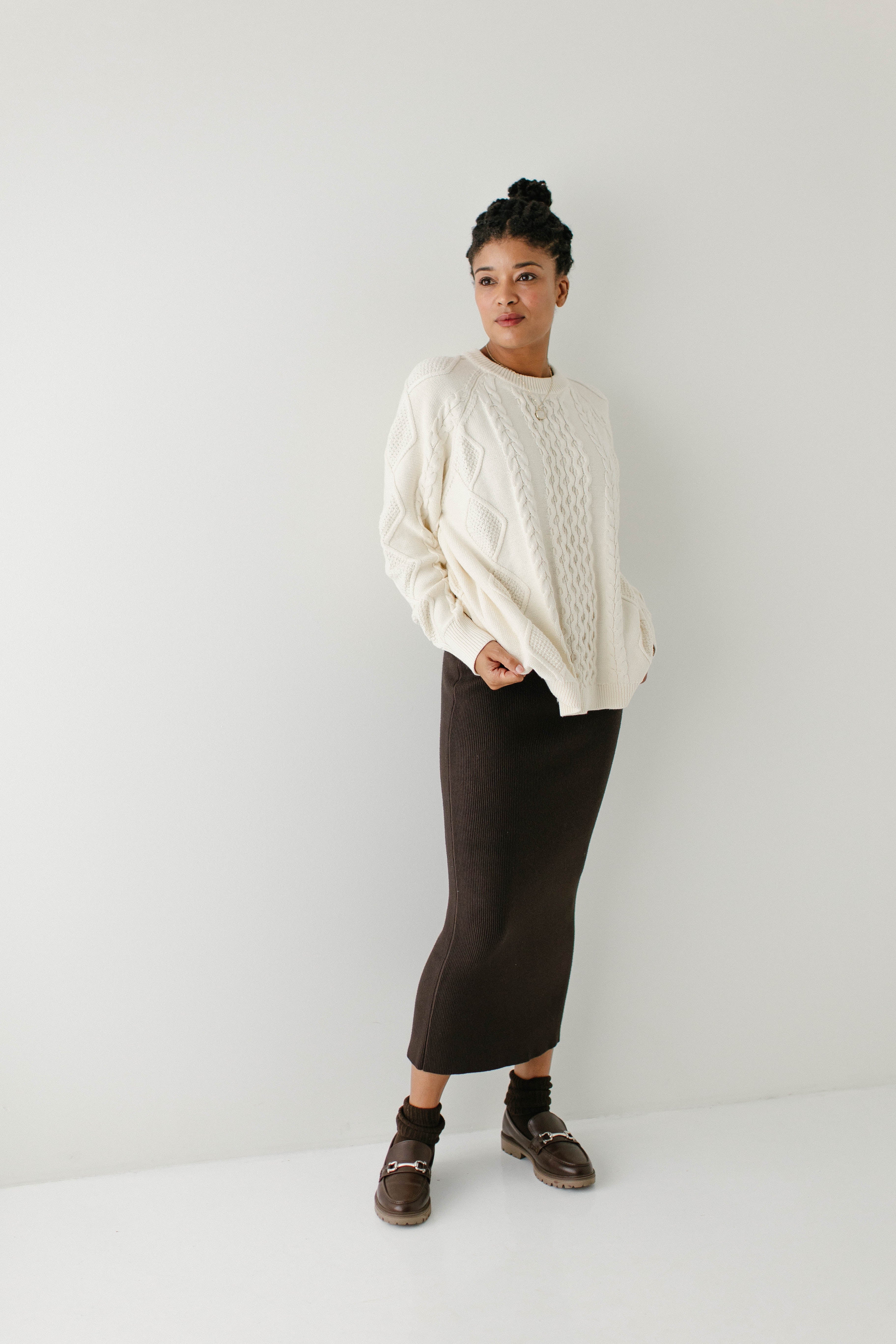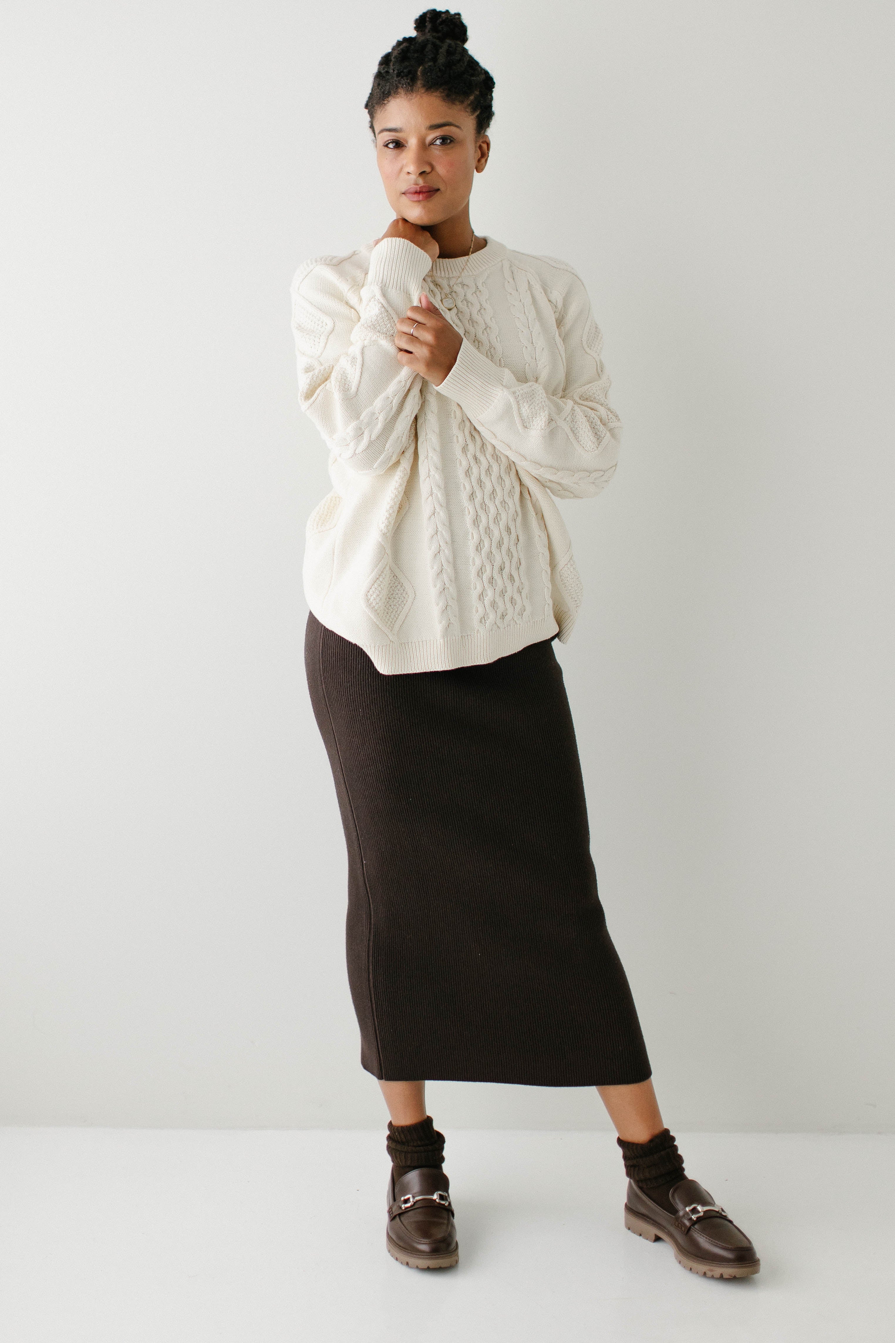 Model wearing the 'Rory' Cotton Cable Knit Sweater in Navy with the 'Parker' High Waist Raw Edge Denim Skirt in Alabaster