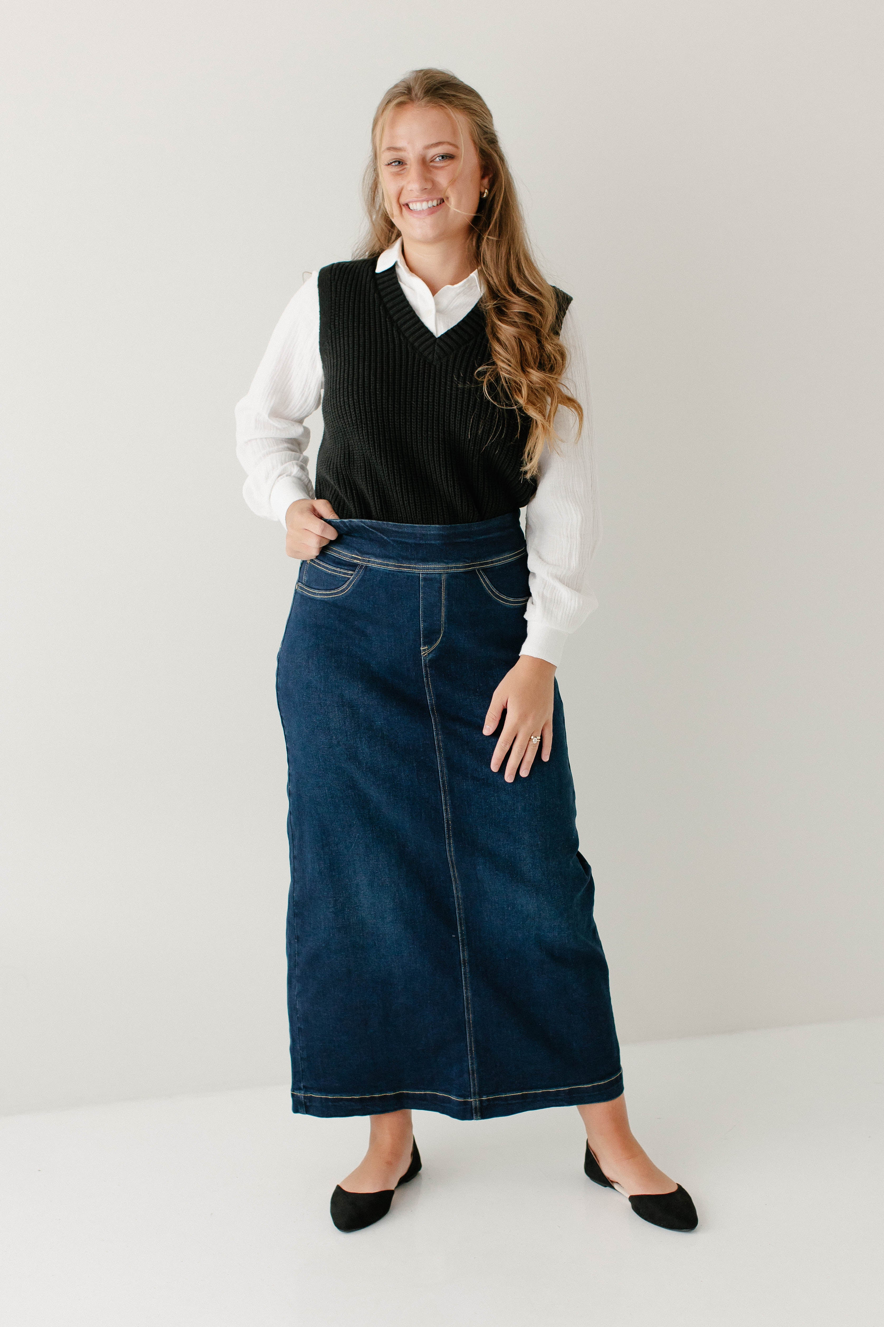 Model wearing the 'Morgan' Cotton Gauze Button Down Top with the 'Sara' Classic Long Denim and the 'Ryder' Cotton Blend Sweater Vest