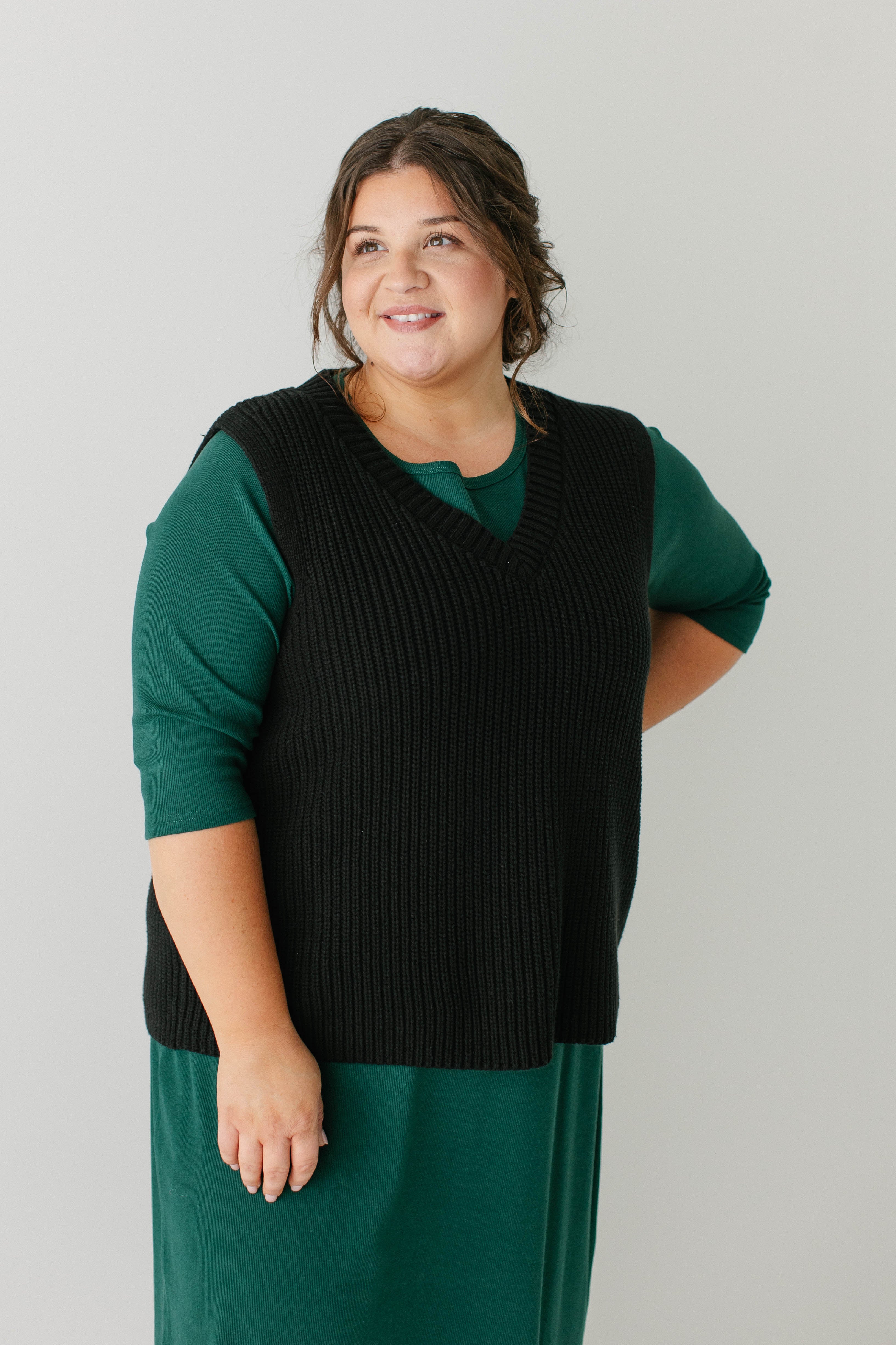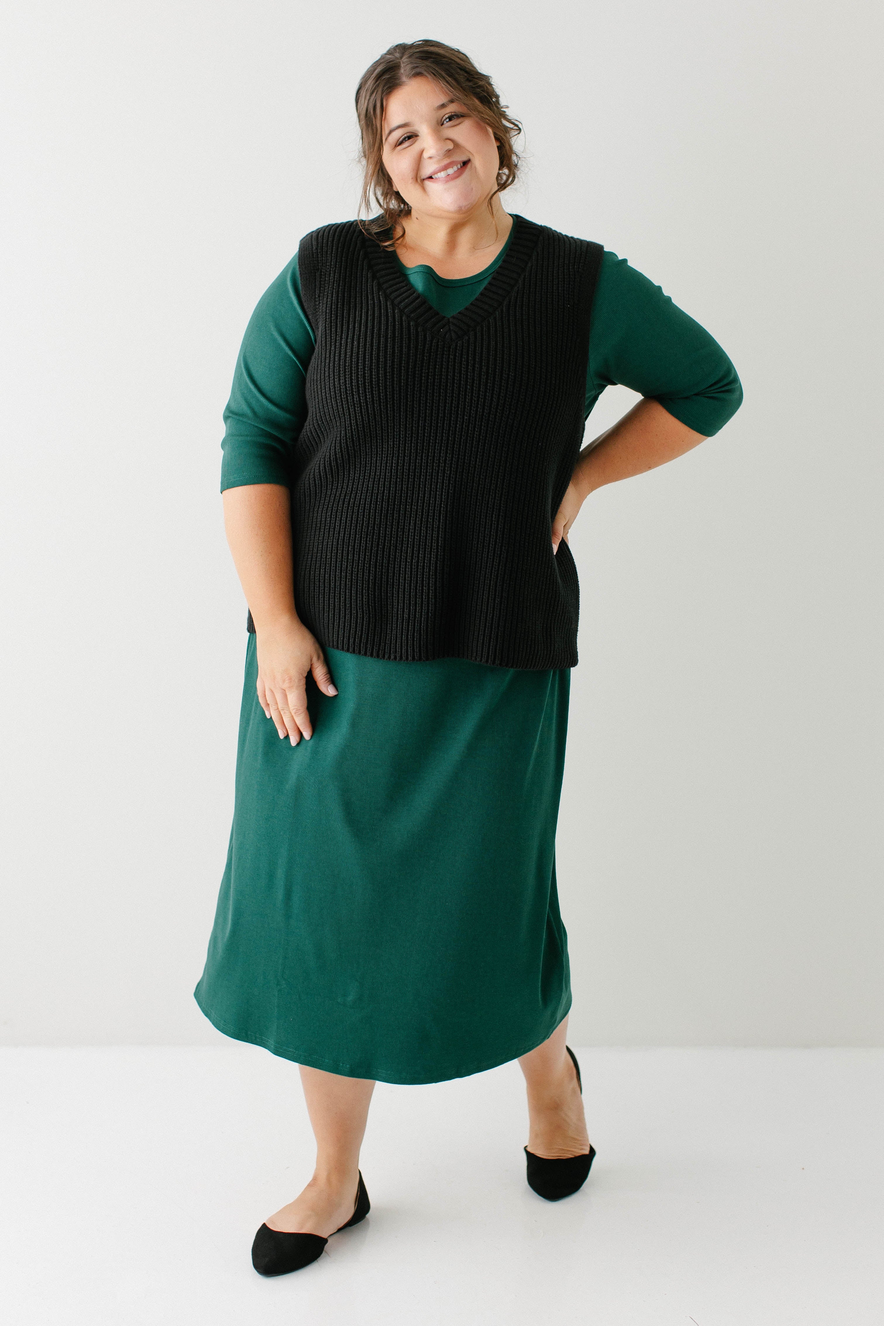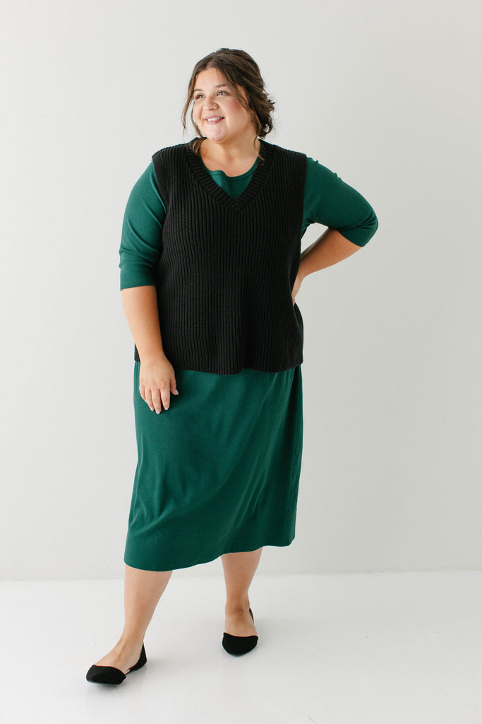 Model wearing the 'Constance' 3/4 Sleeve Ribbed Bamboo Blend Midi Dress in Emerald Green with the 'Ryder' Cotton Blend Sweater Vest