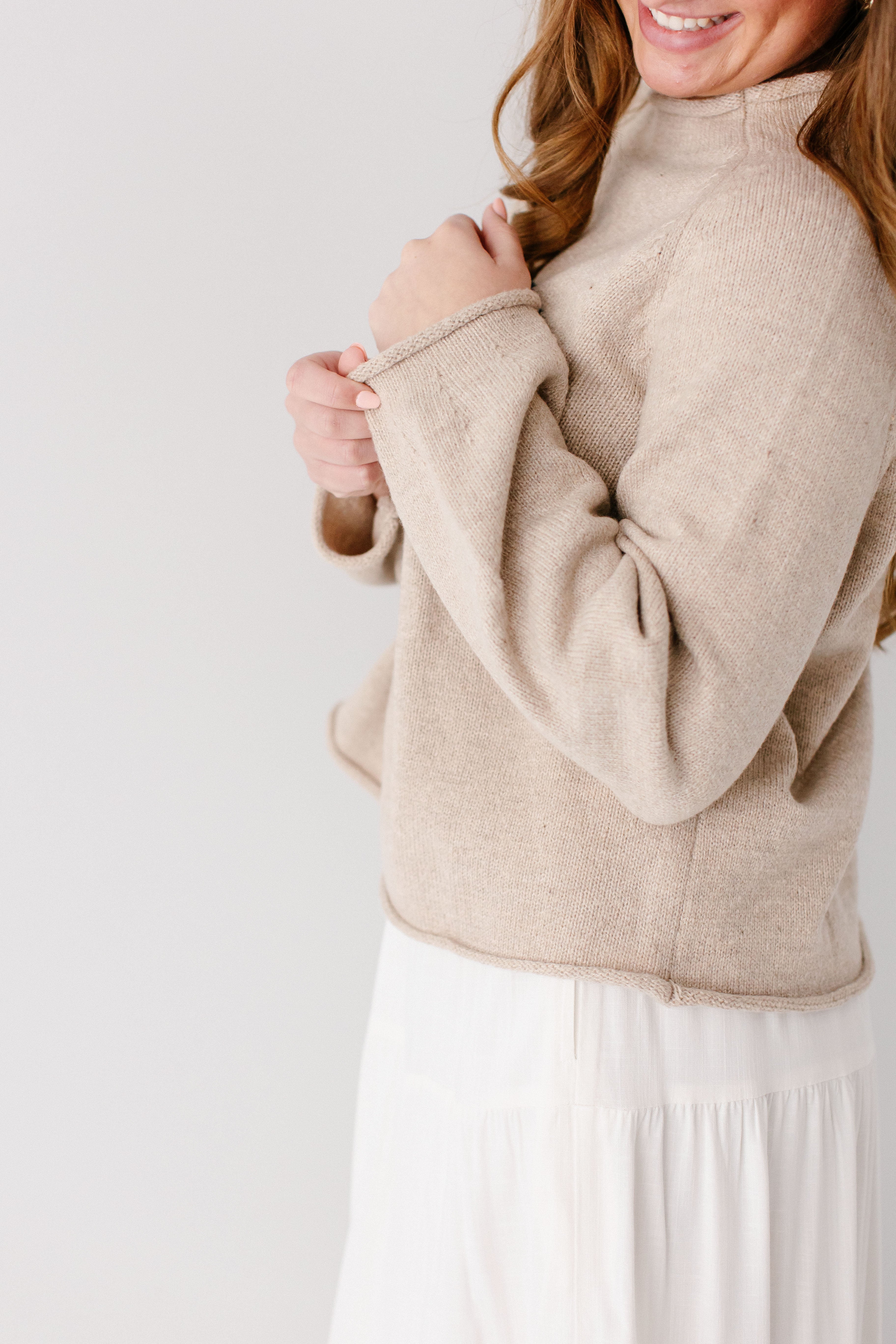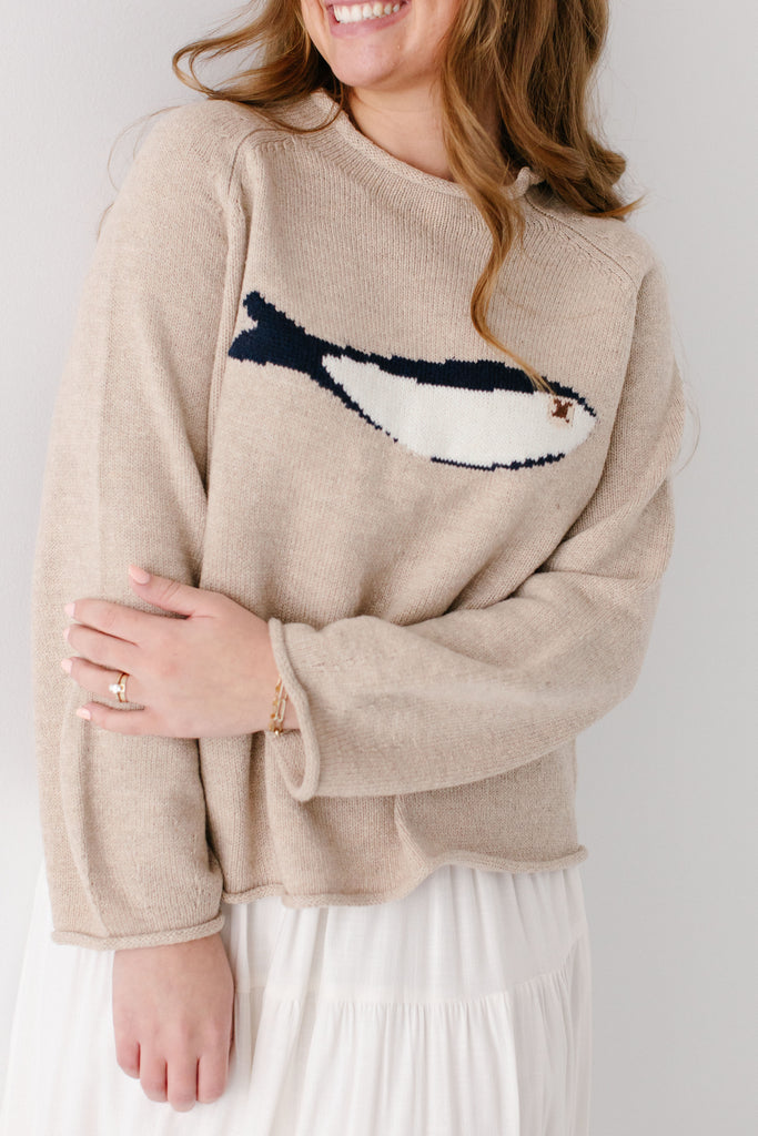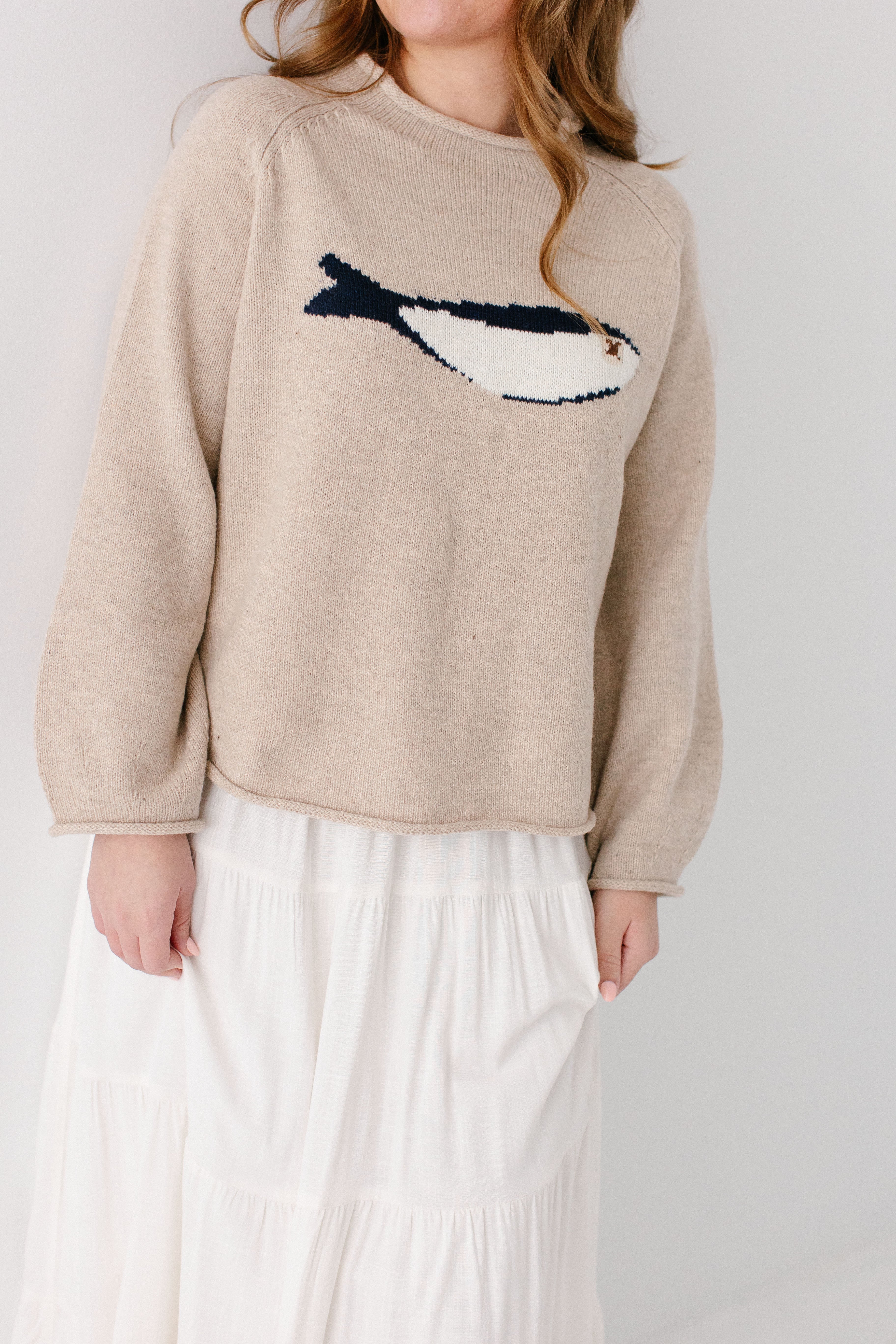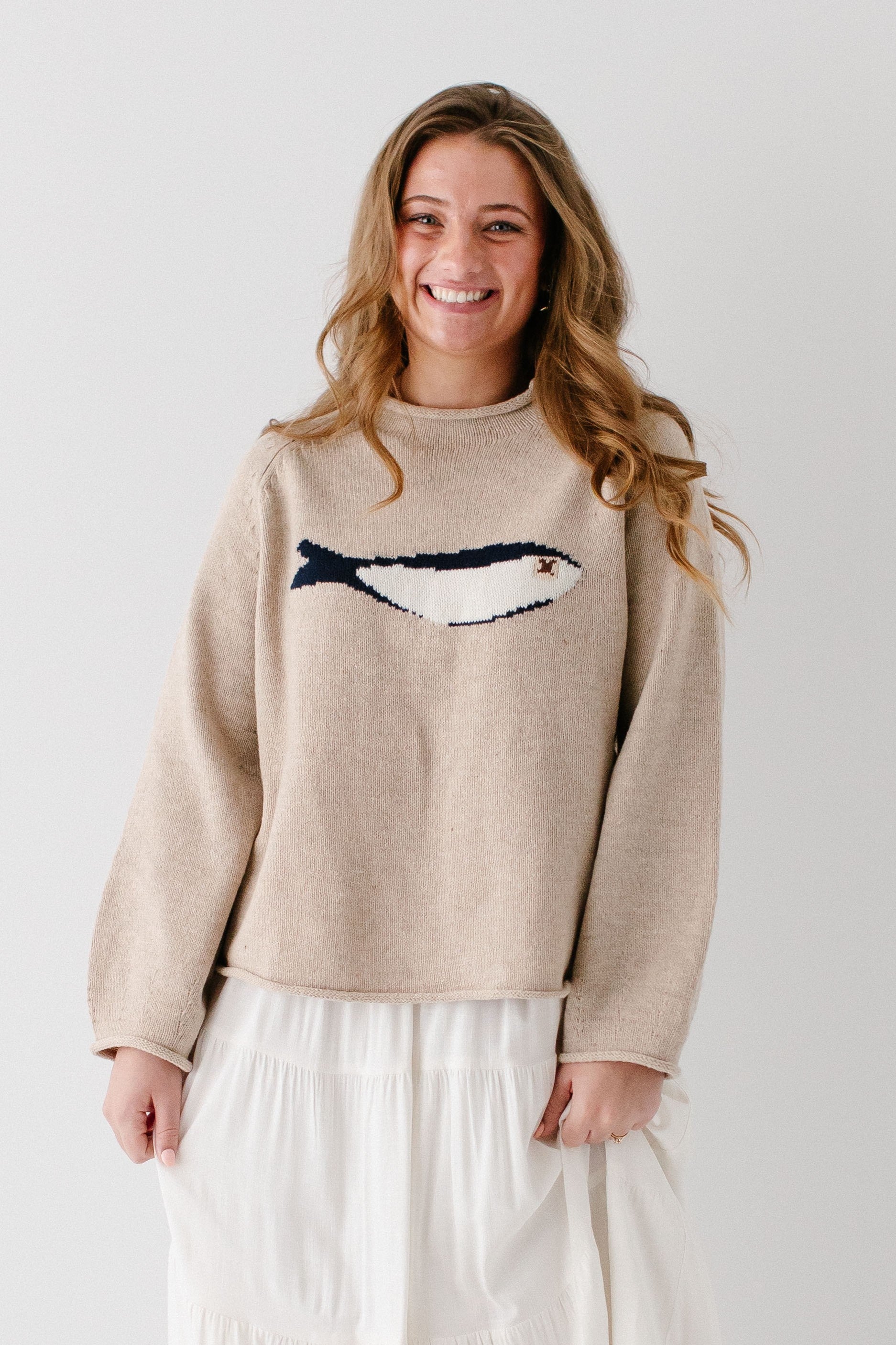 Fisherman-core is in and the 'Sardine' Raglan Sleeve Sweater is the perfect trendy piece! Featuring the cutest raglan sleeve, rolled detailing on the neck, hem, and sleeves, and a neutral sardine design on a beige background. Pair the ‘Sardine’ with your favorite neutral skirt for the perfect cold weather outfit to spend a day out with the girls.