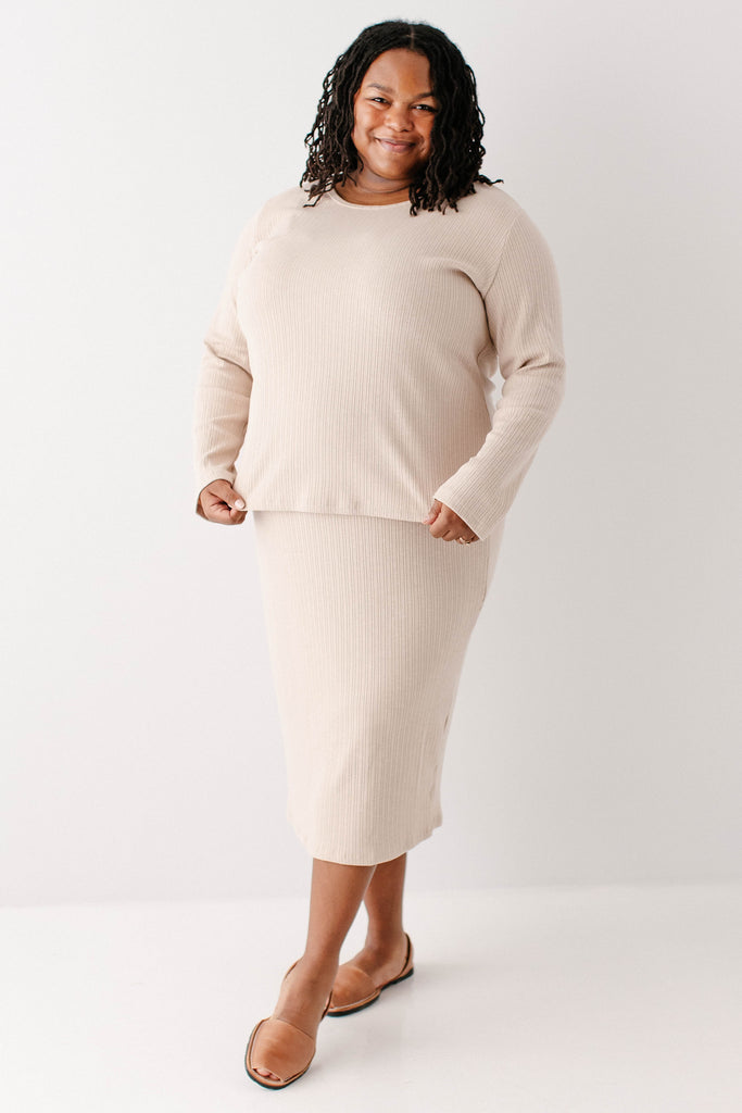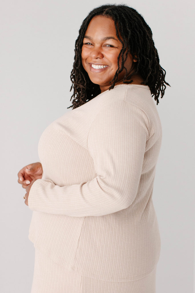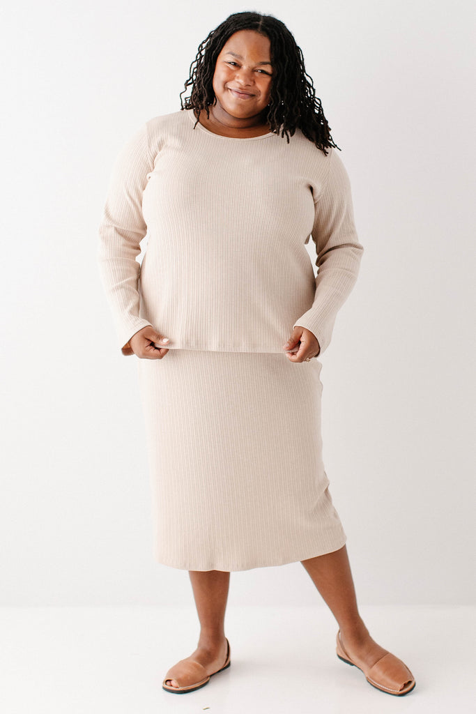 The popular 'Sasha' Long Sleeve Ribbed Top, now in a light beige color! Made with a soft, comfortable fabric in a flattering ribbed style, this top is easy to pair with your favorite denim or printed skirt. Wear the ‘Sasha’ on a crisp sunset picnic! Exclusively designed by us with you in mind.