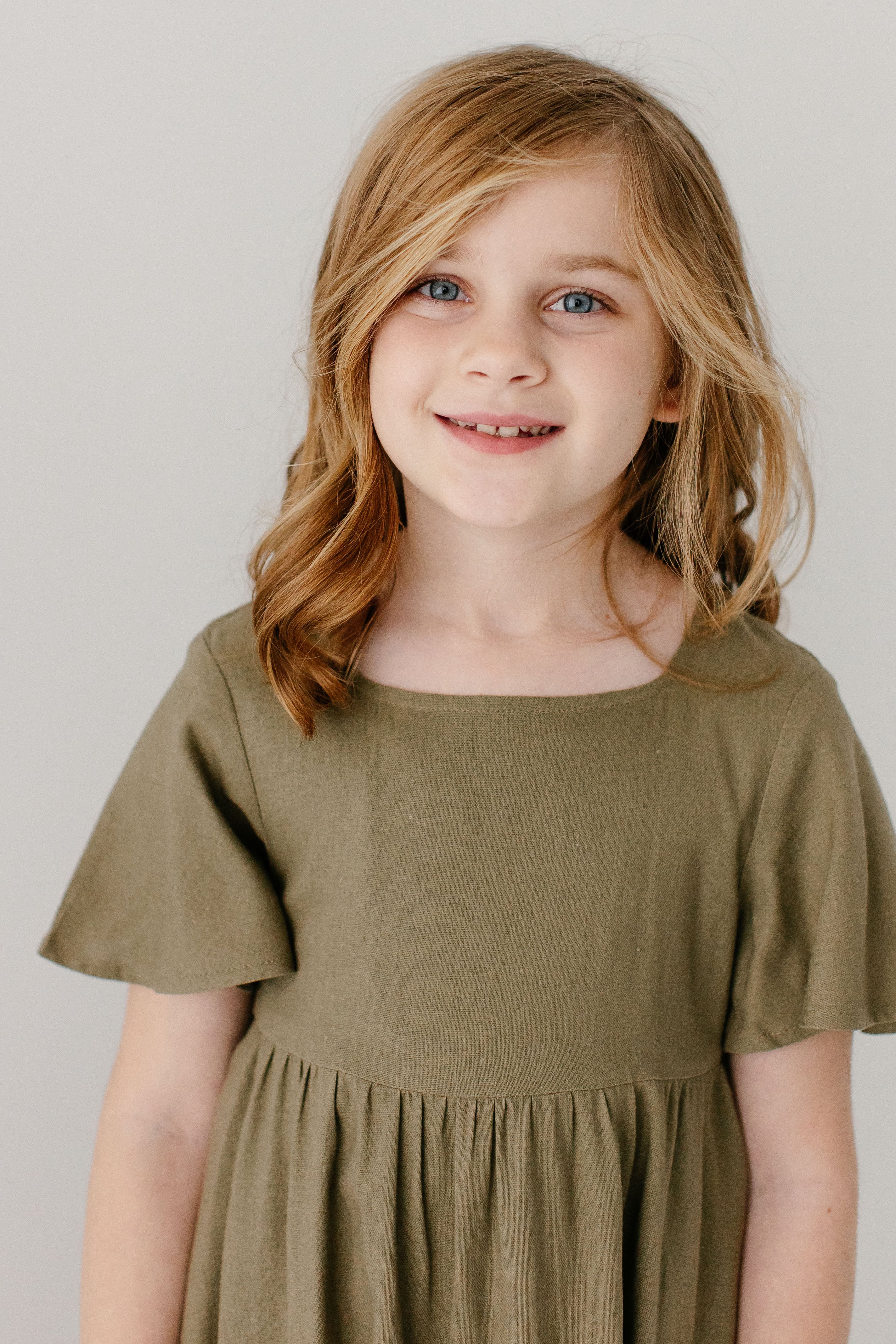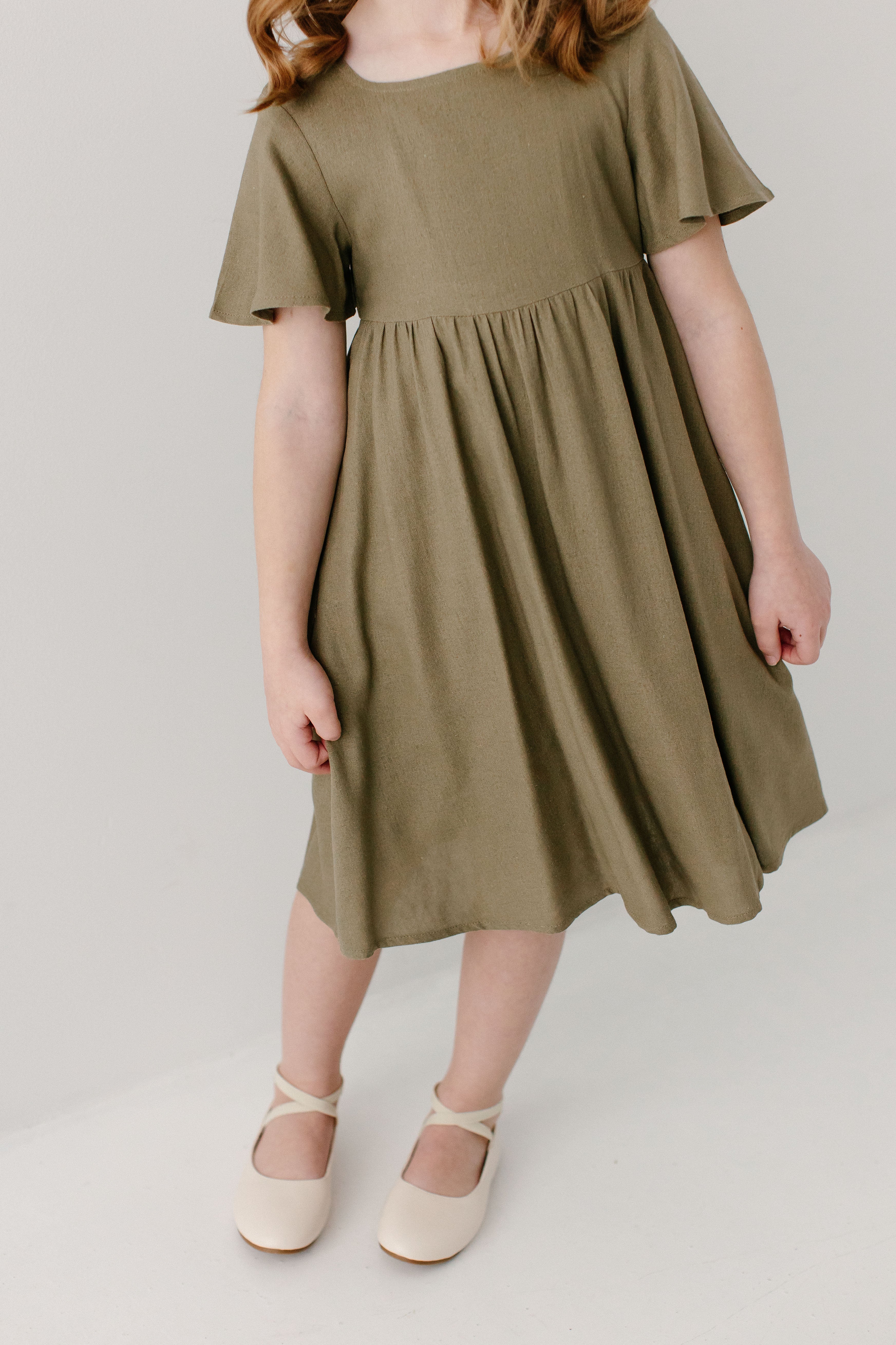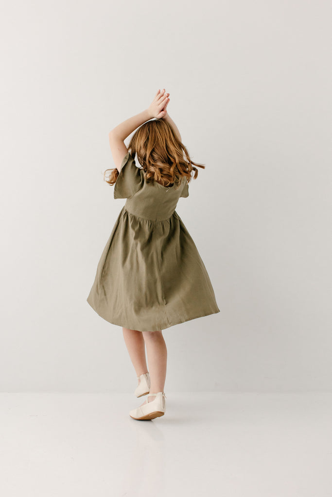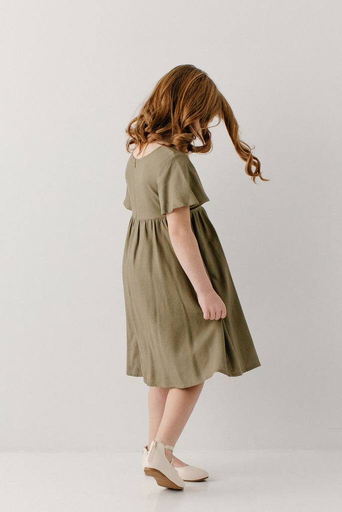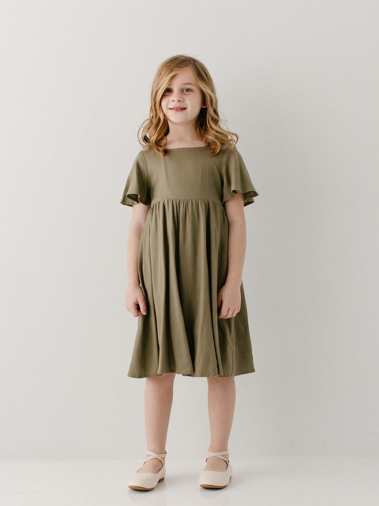 The popular ‘Savannah’ Square Neck Knee Length Dress, now available in girls’ sizes! Made from a natural cotton/linen blend fabric with flutter sleeves, a modest square neck, and in a fun mediterranean olive shade, this is a piece that will compliment her busy lifestyle! Exclusively designed by us with you in mind.