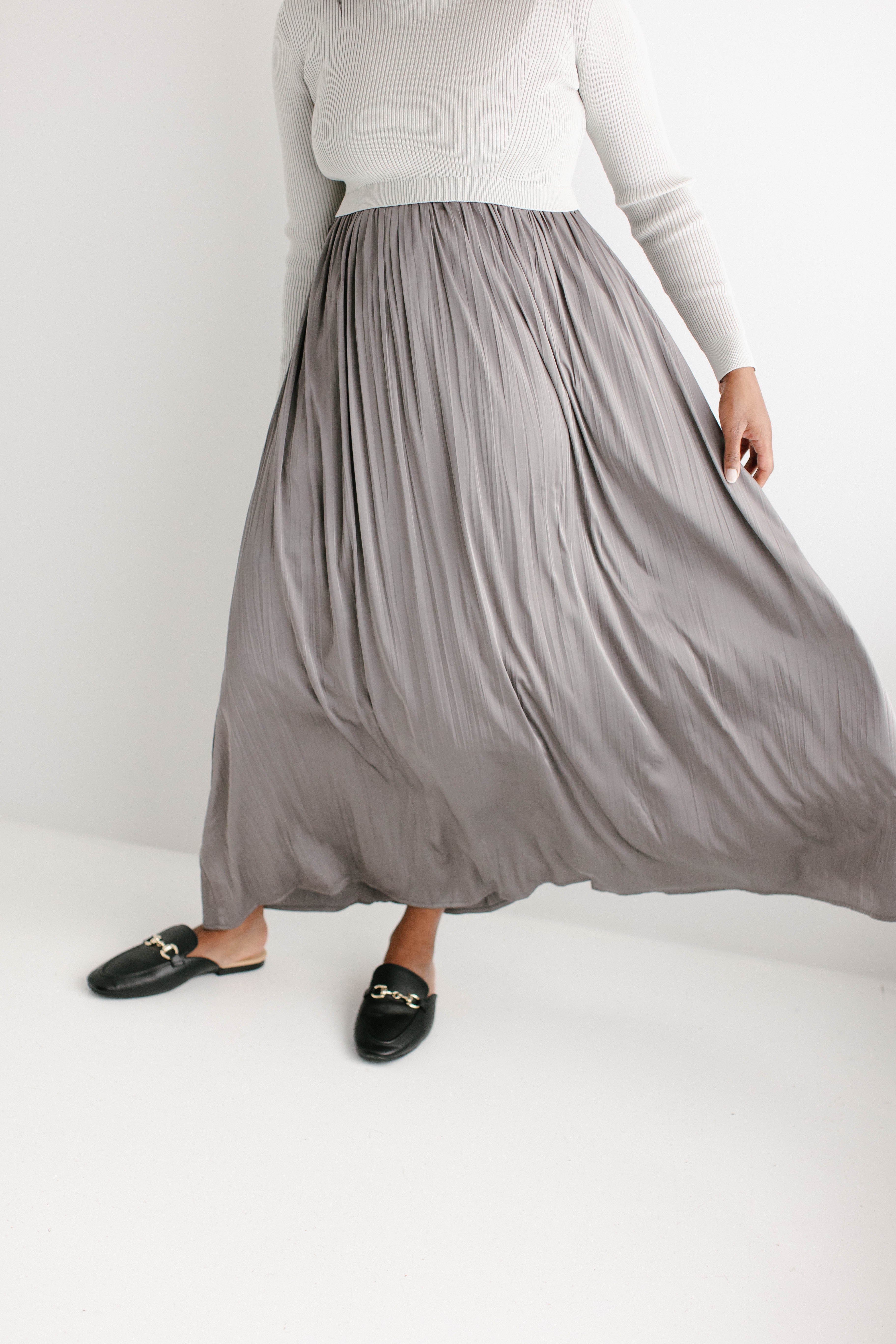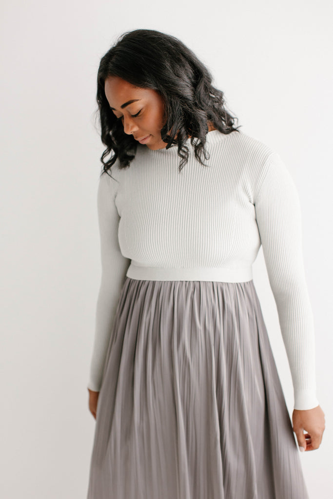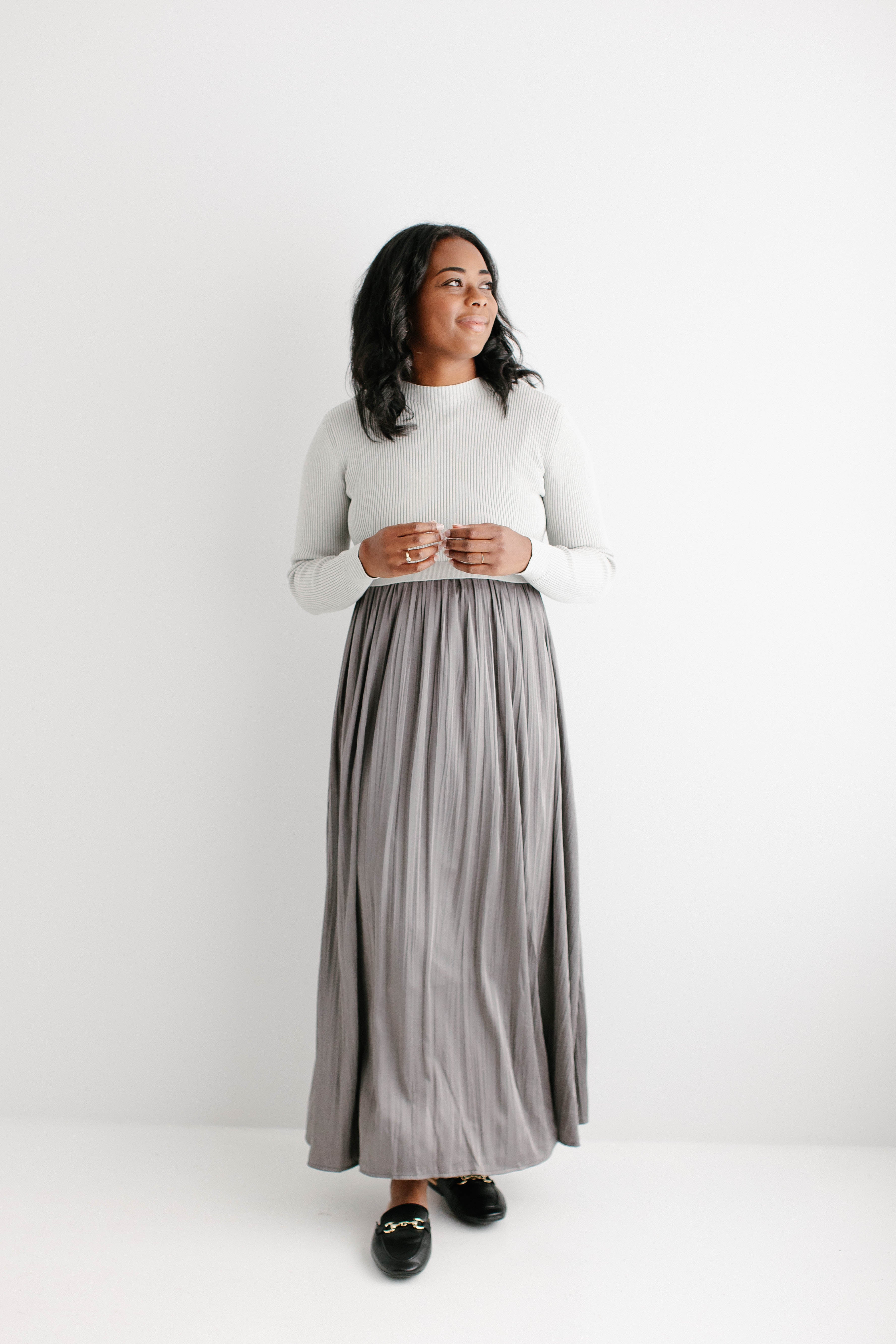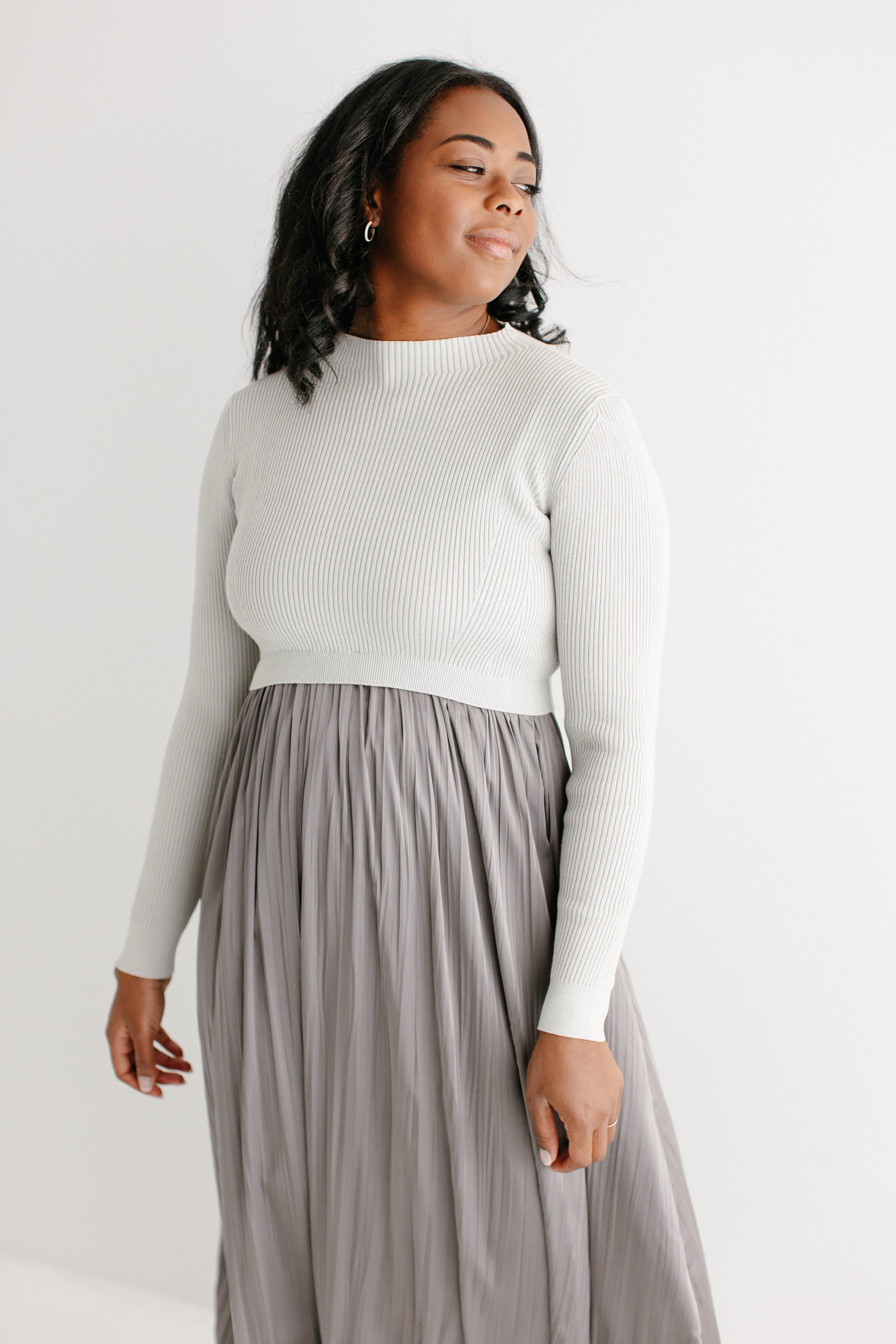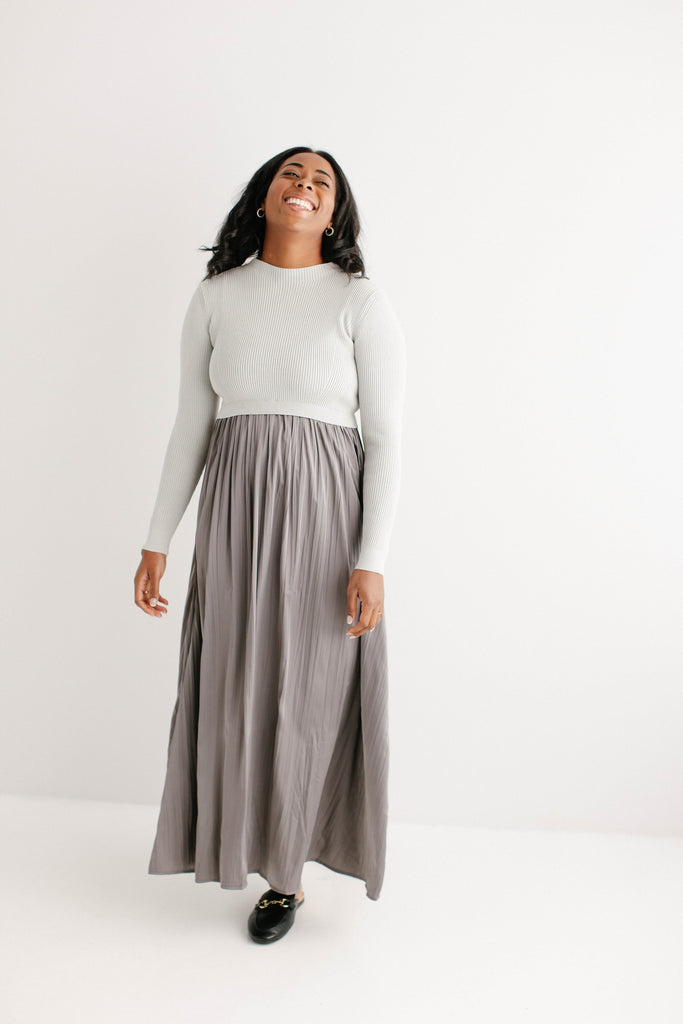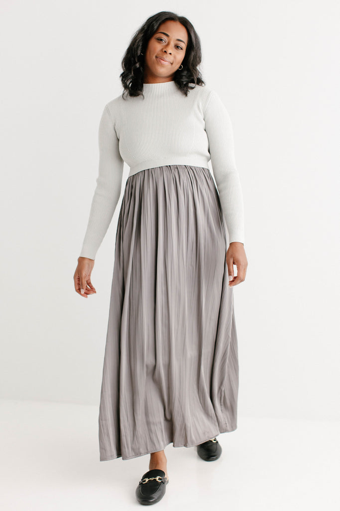 Introducing the 'Seraphina' Satin Sweater Mixed Maxi Dress, the perfect holiday piece! A classy take on a fun, monochromatic look: effortless, beautiful, and feminine. Featuring a cozy sweater bodice with modest mock neckline and pleated satin slip skirt, this dress is perfect for the upcoming season. Pair with your favorite heels for your next work party!