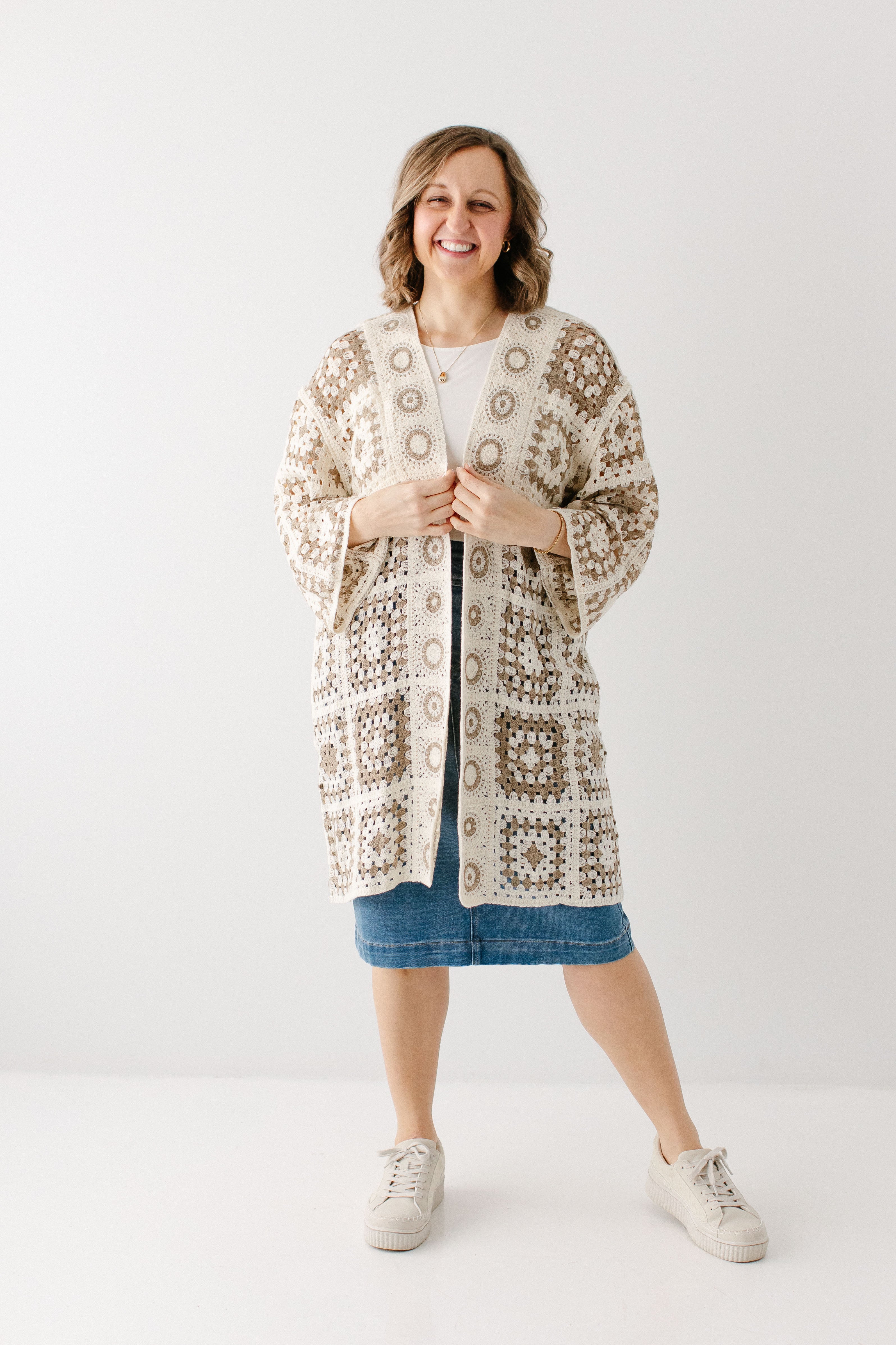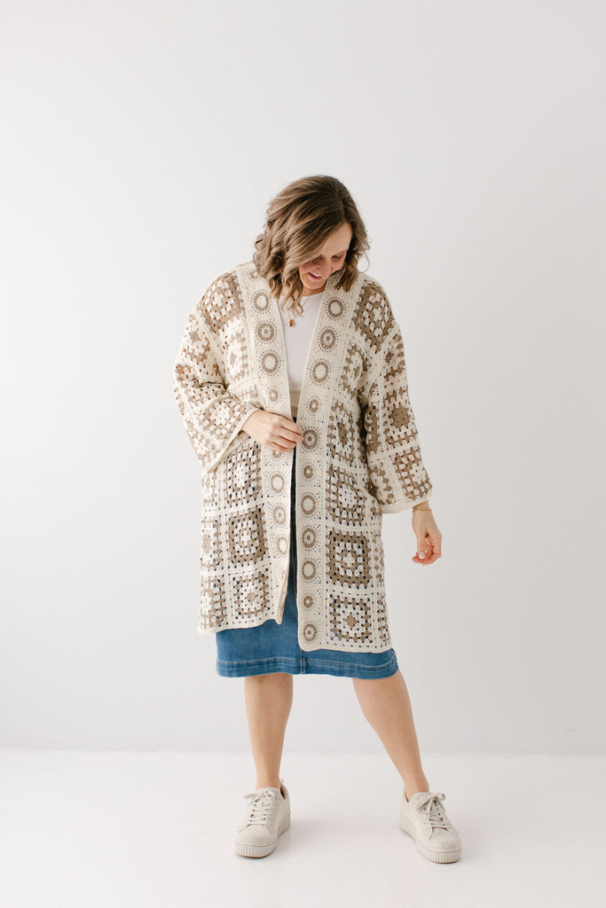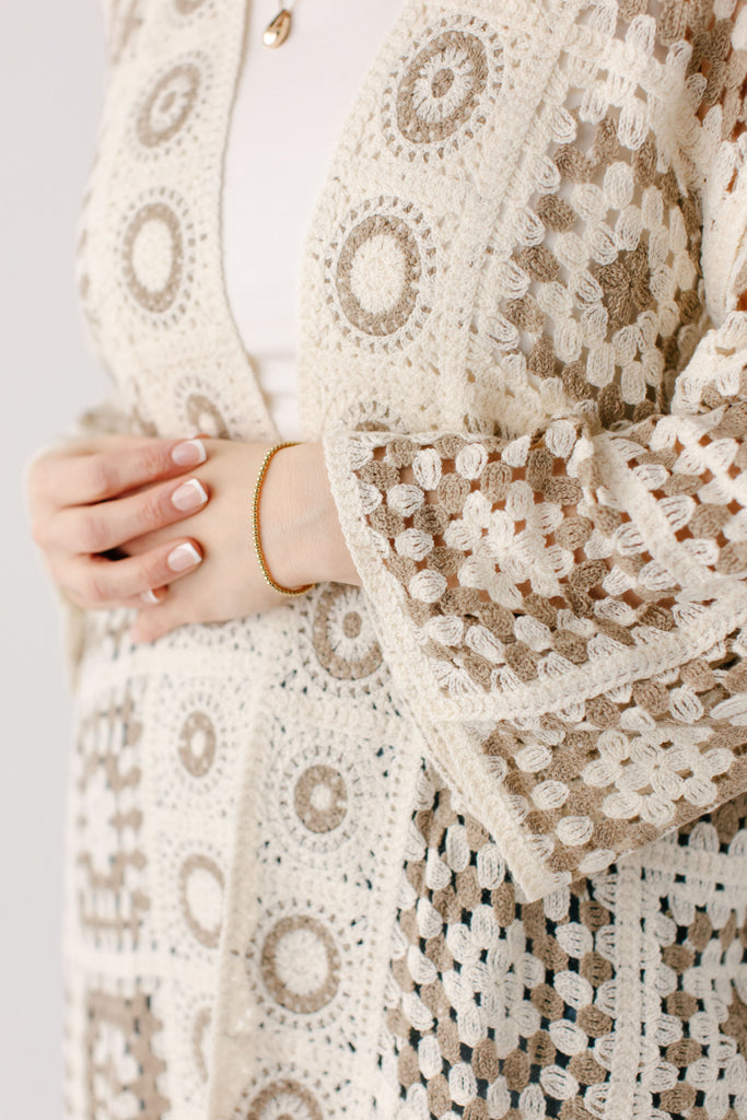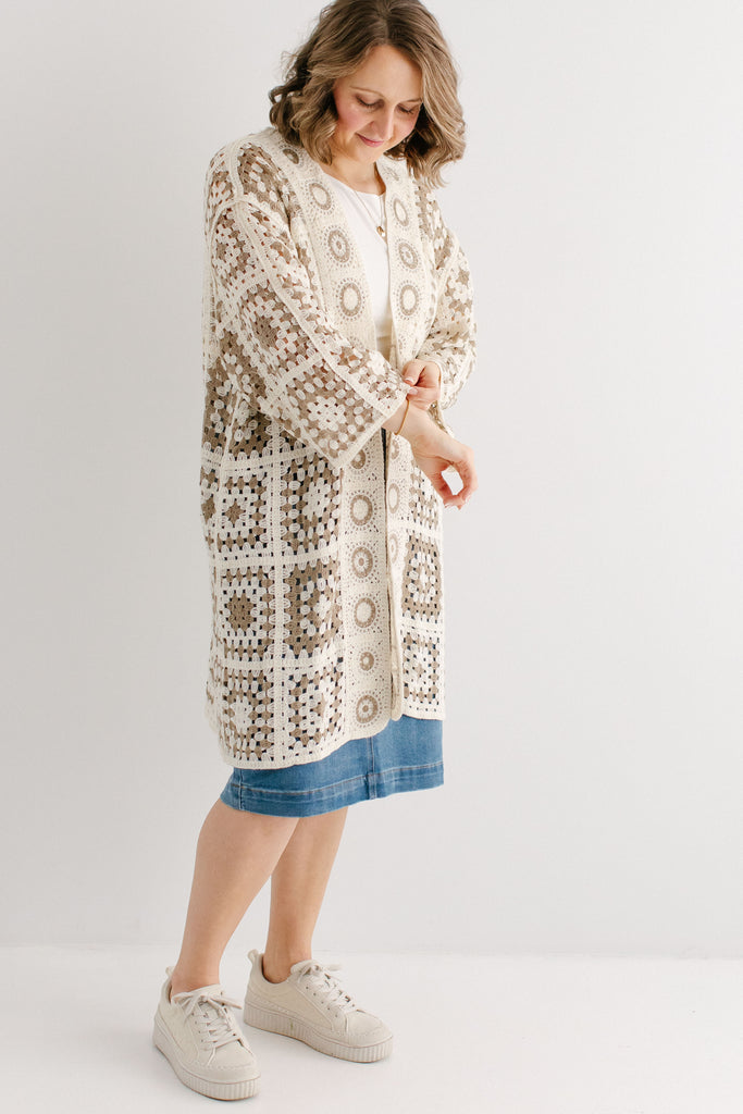 A fun cardigan is the perfect addition to your outfits! The 'Shantae' Open Knit Crochet Cardigan is designed in the most perfect neutral shades, allowing it to be paired with nearly anything. This cardigan features a fun square motif crochet style with flowy long sleeves and long length. Pair the ‘Shantae’ with your favorite outfits for a little extra flair.