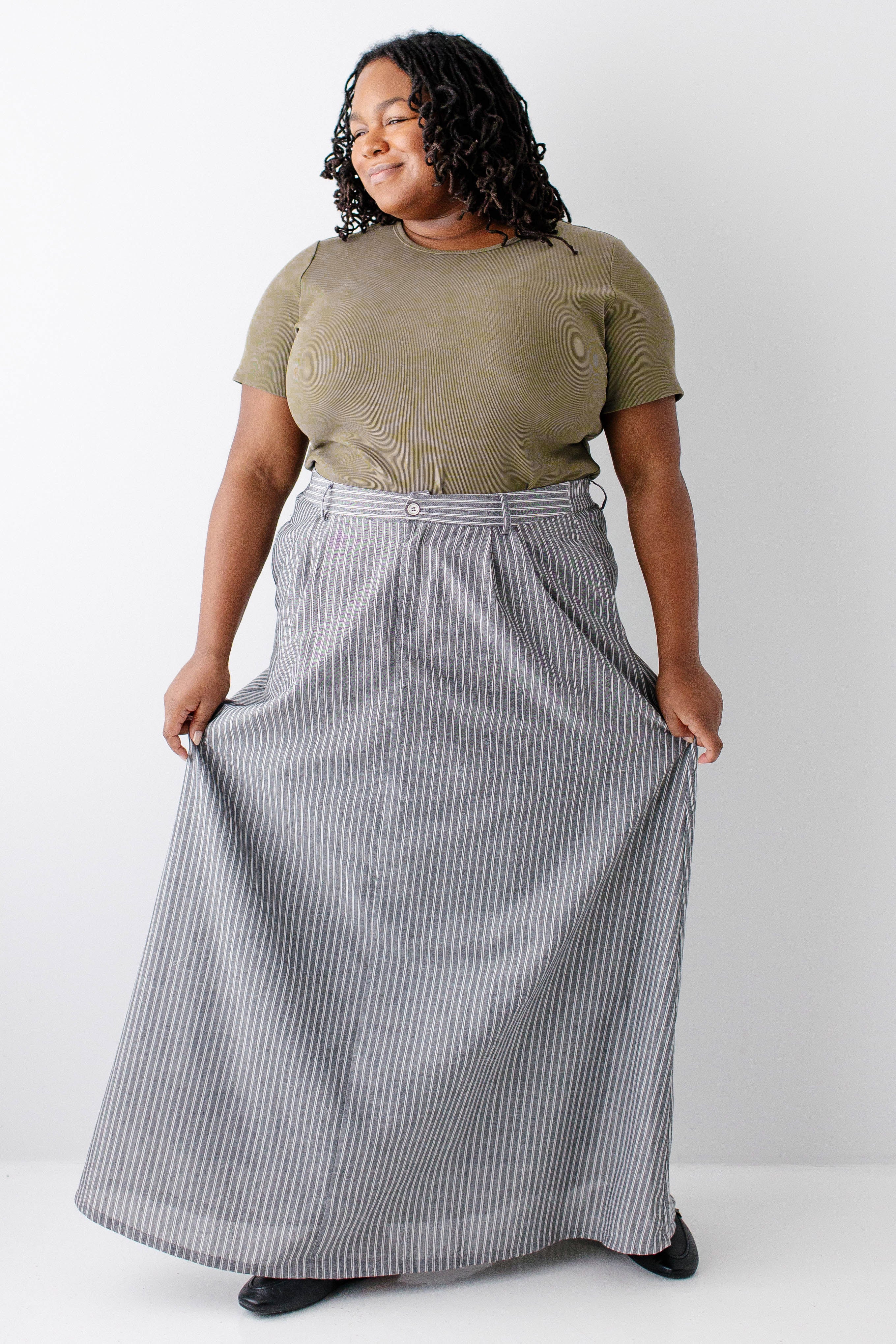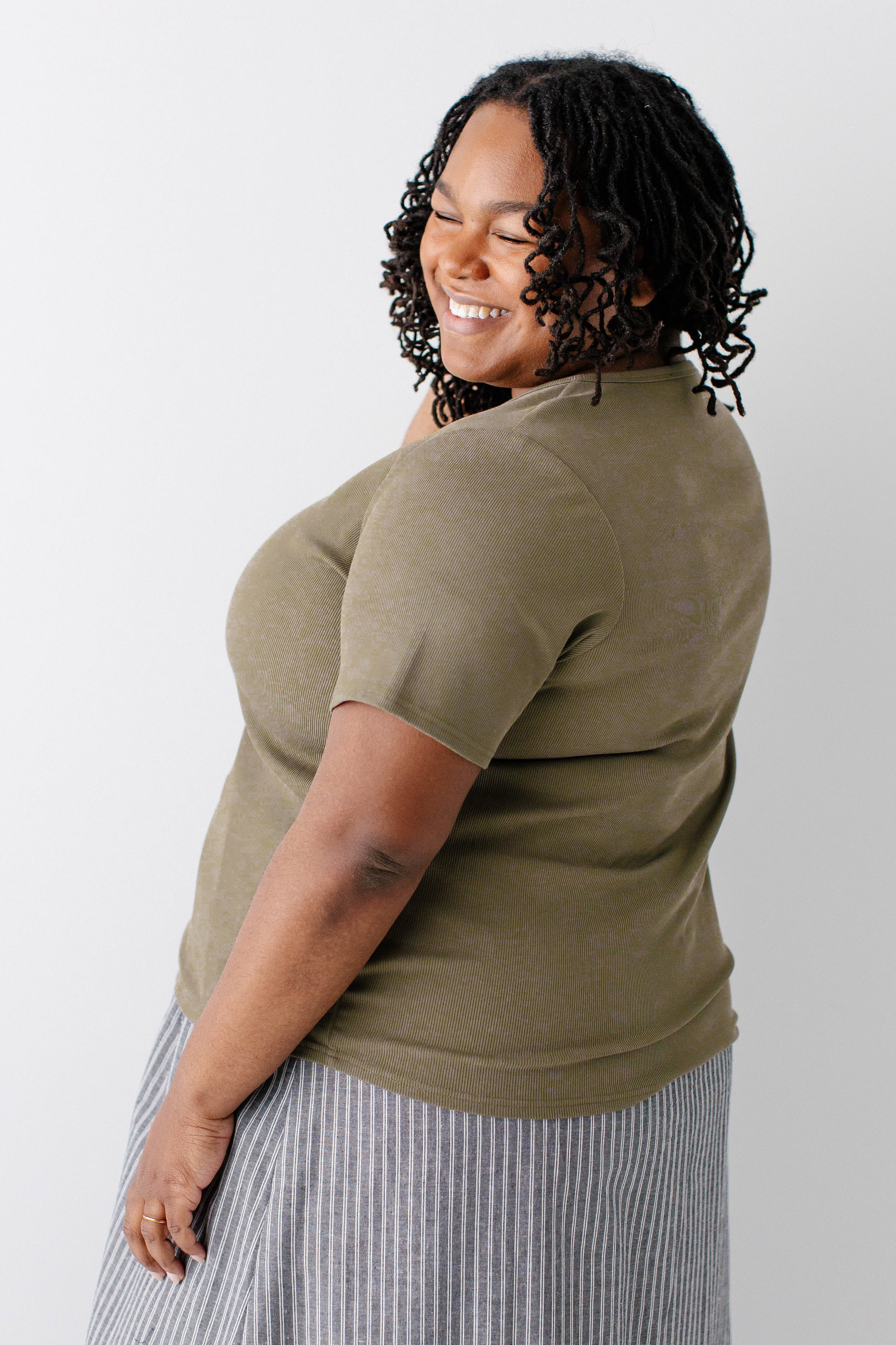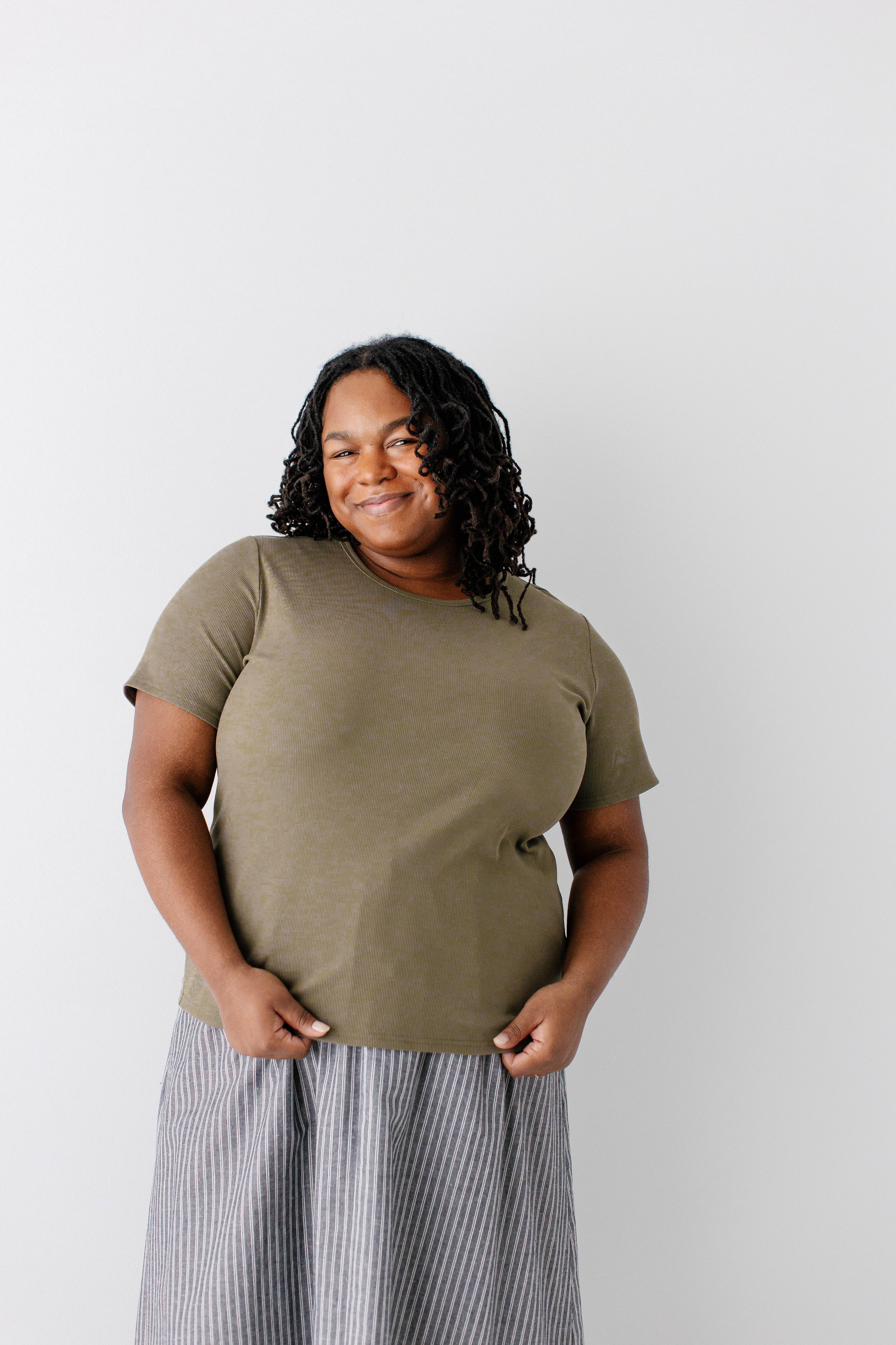 Model wearing the 'Shelly' Short Sleeve Ribbed Top in Olive with the 'Beckett' Pinstripe Maxi Skirt