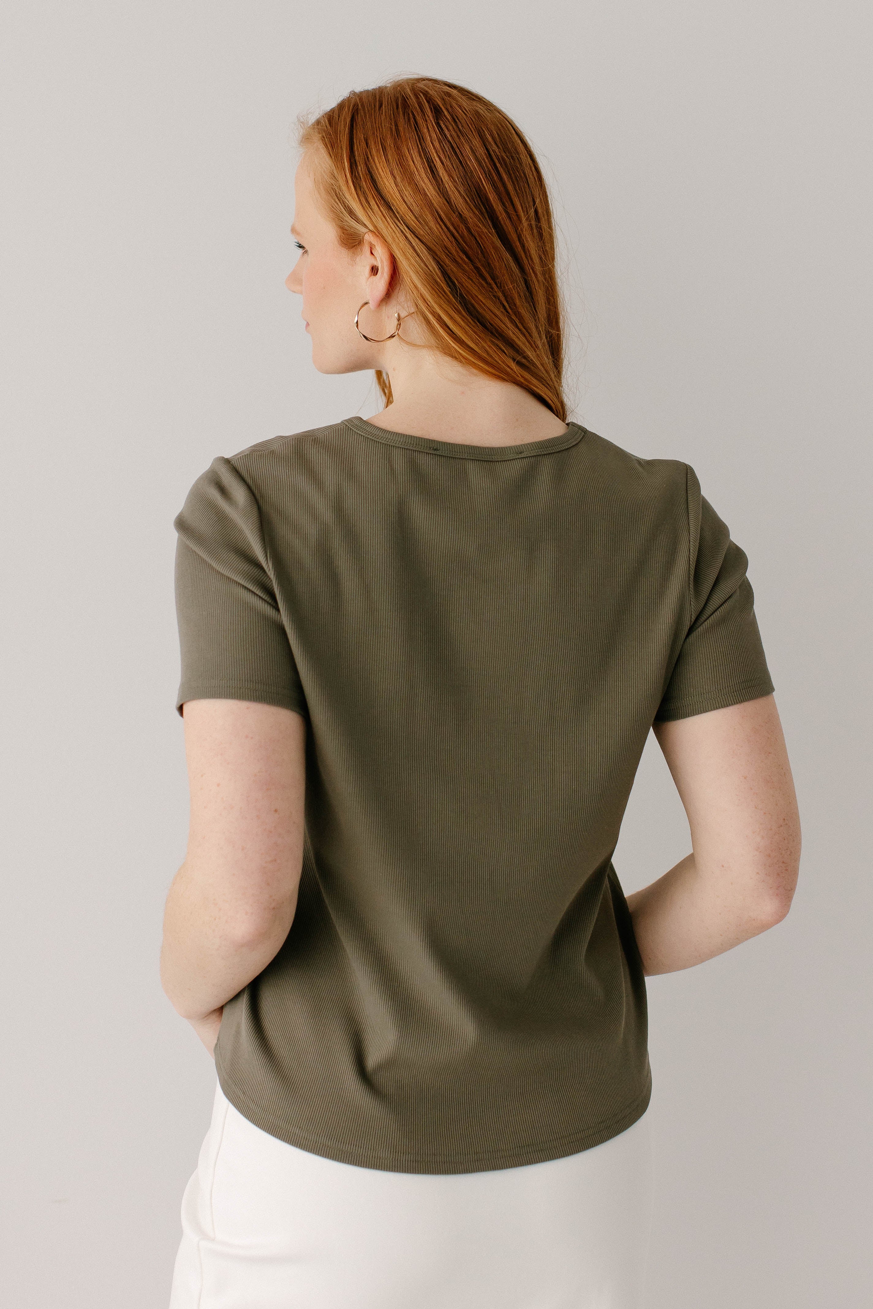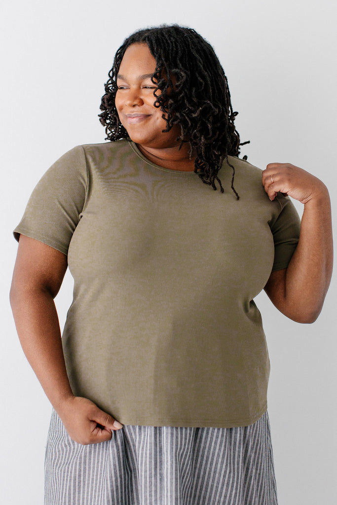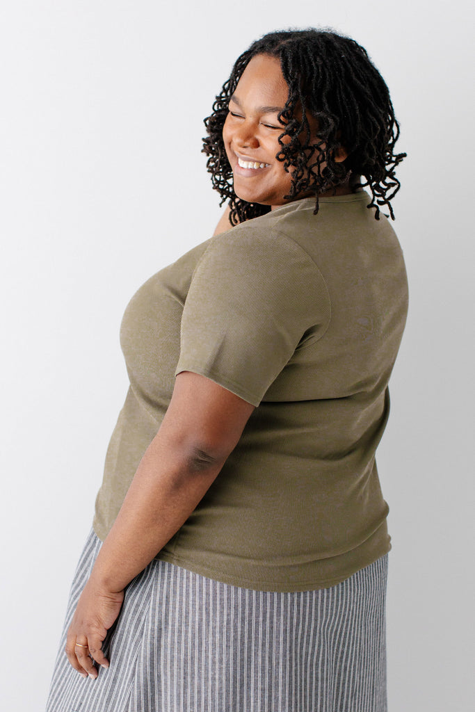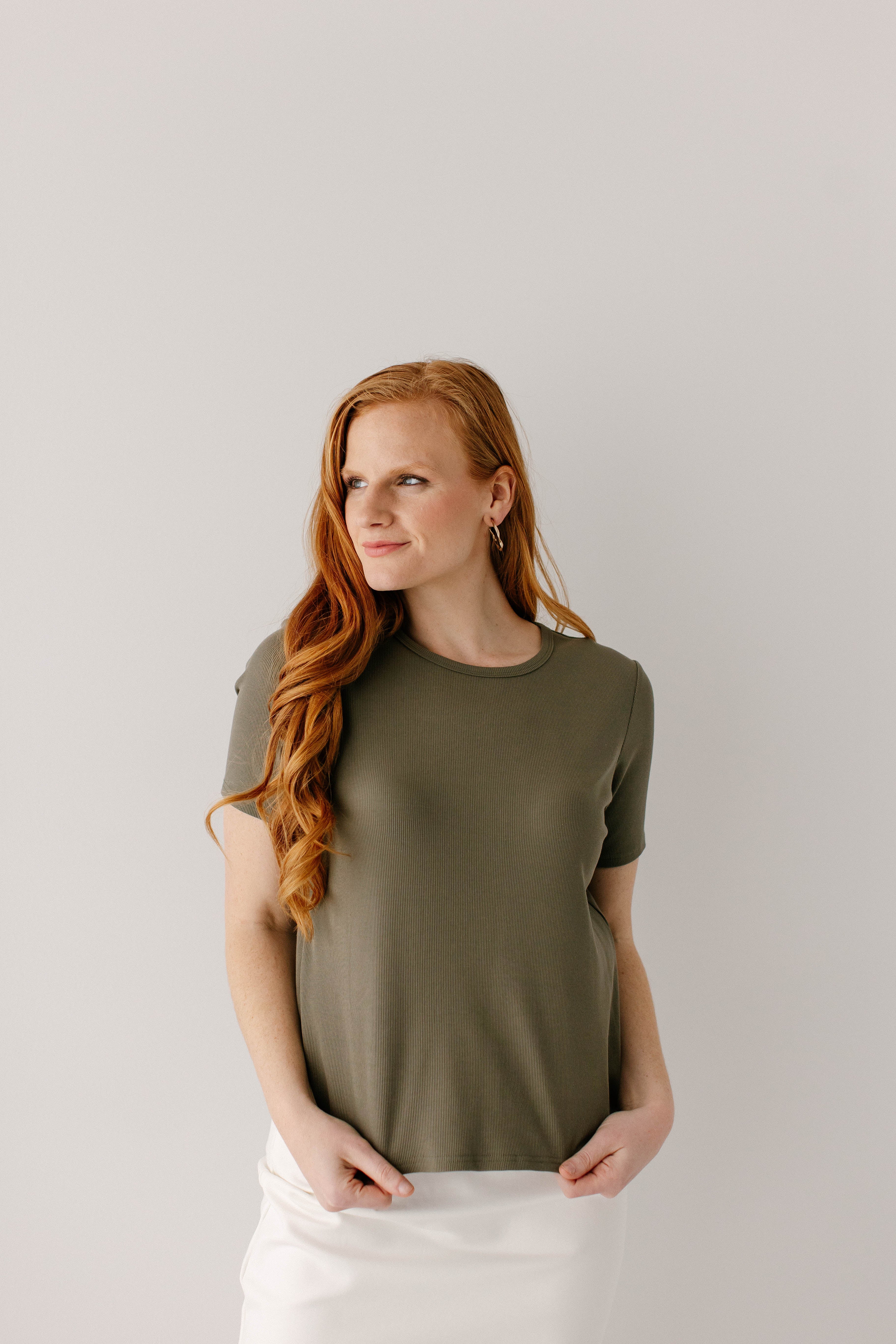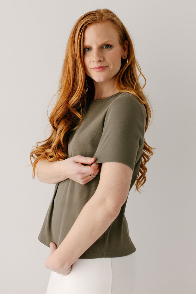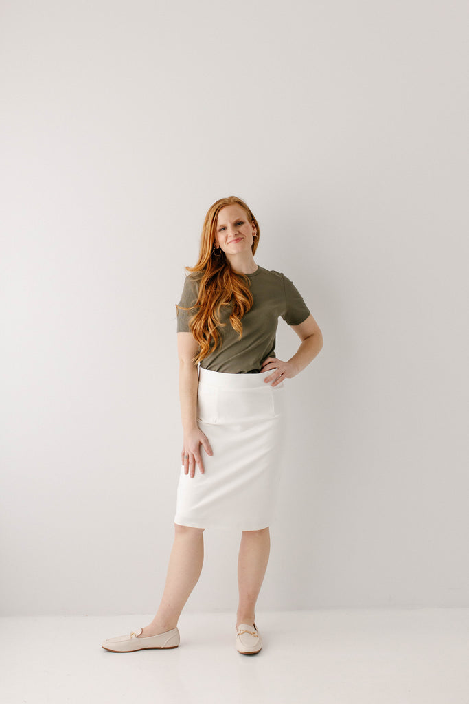 Model wearing the 'Shelly' Short Sleeve Ribbed Top in Olive with the 'Anna' Pencil Skirt in Ivory in 24" Length