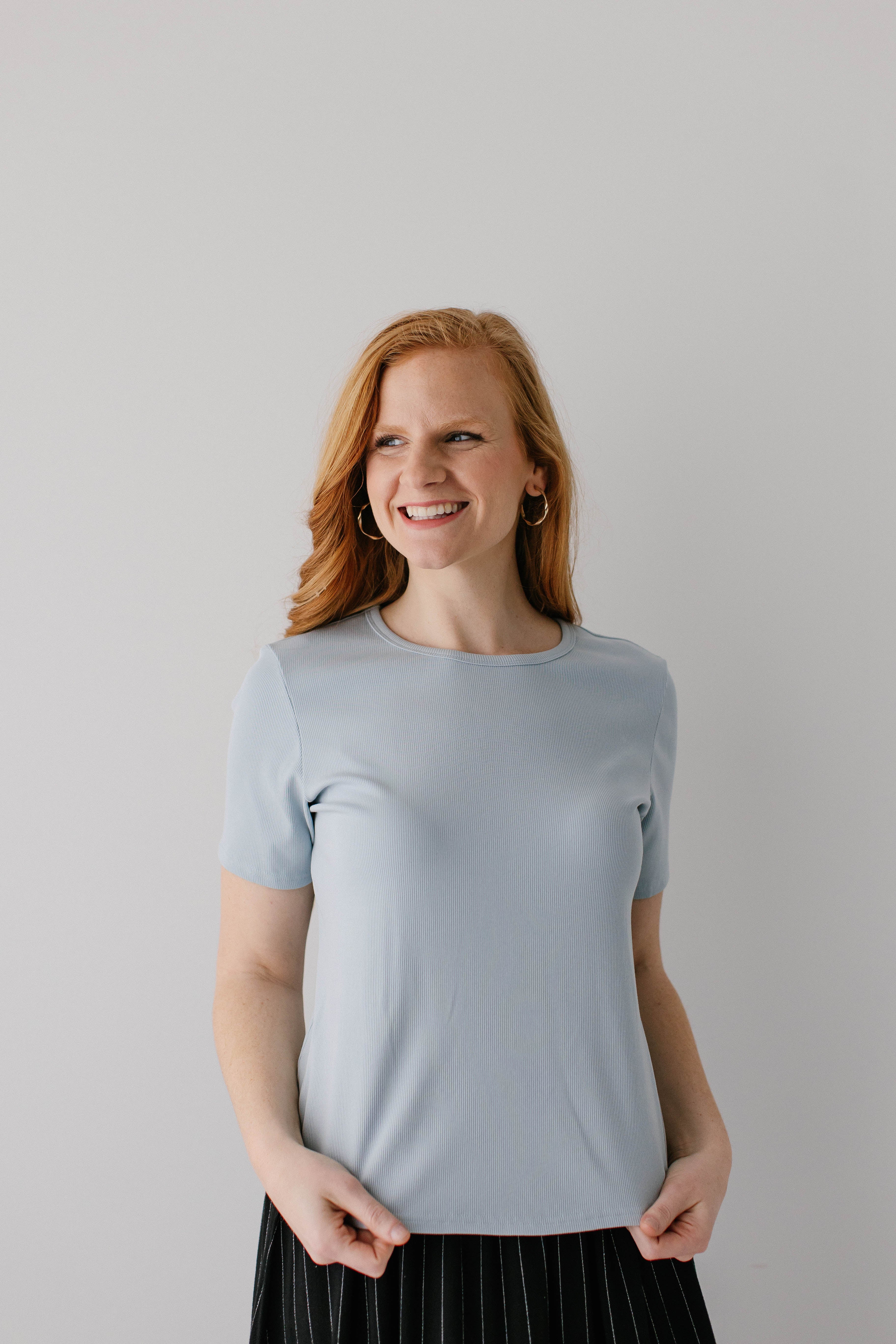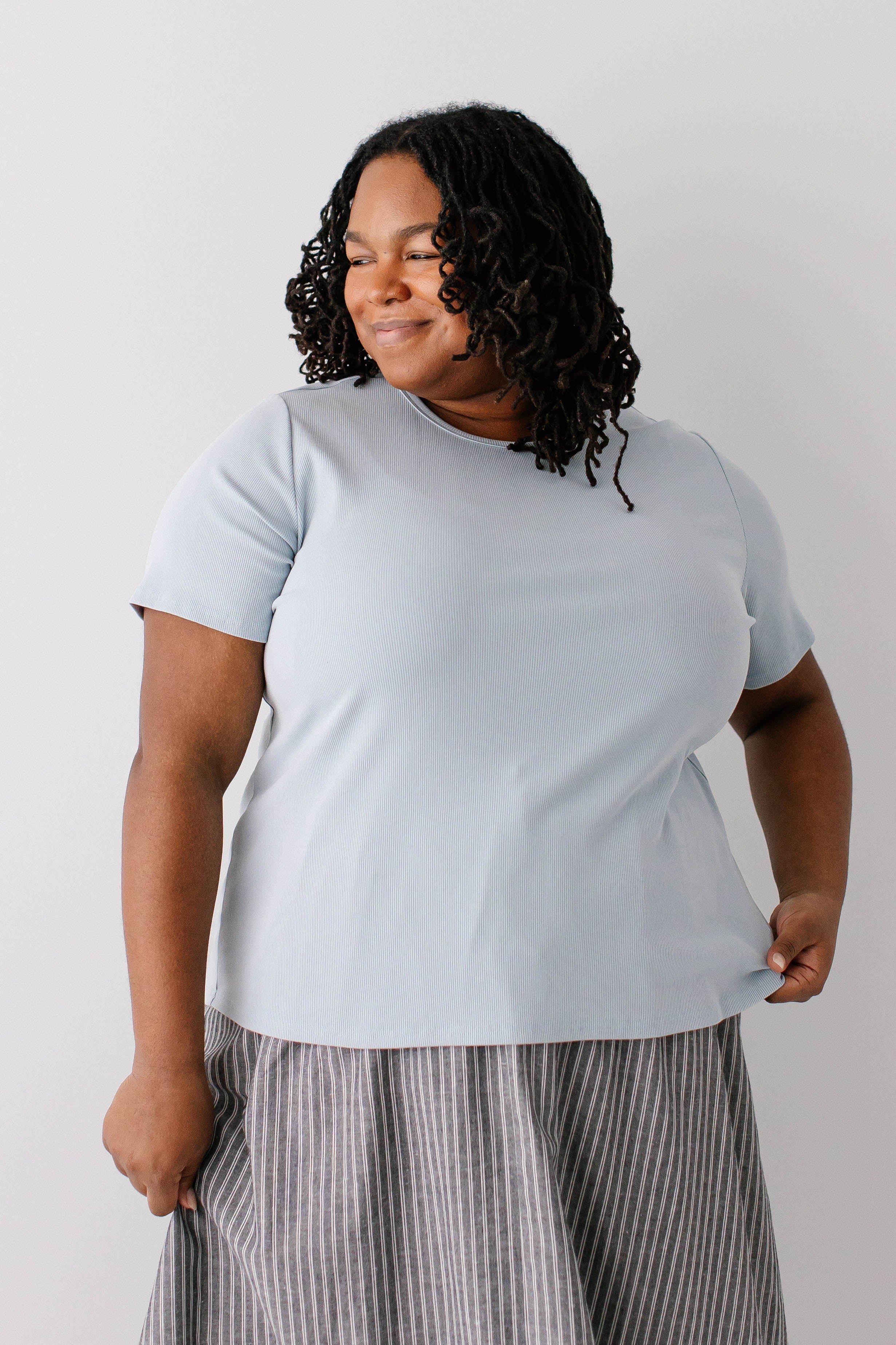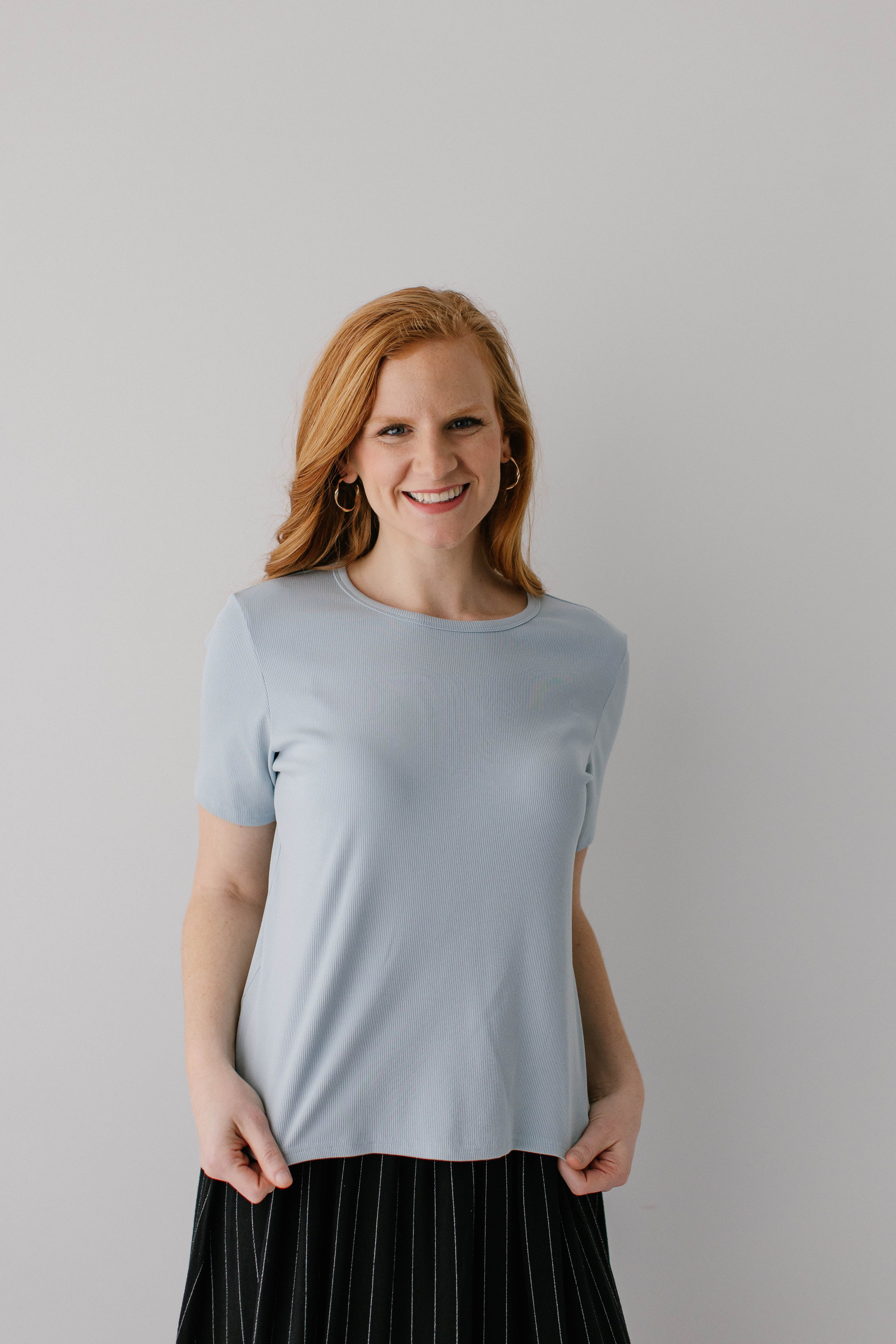 Model wearing the 'Shelly' Short Sleeve Ribbed Top in Powder Blue with the 'Dion' Pinstripe A-Line Midi Skirt