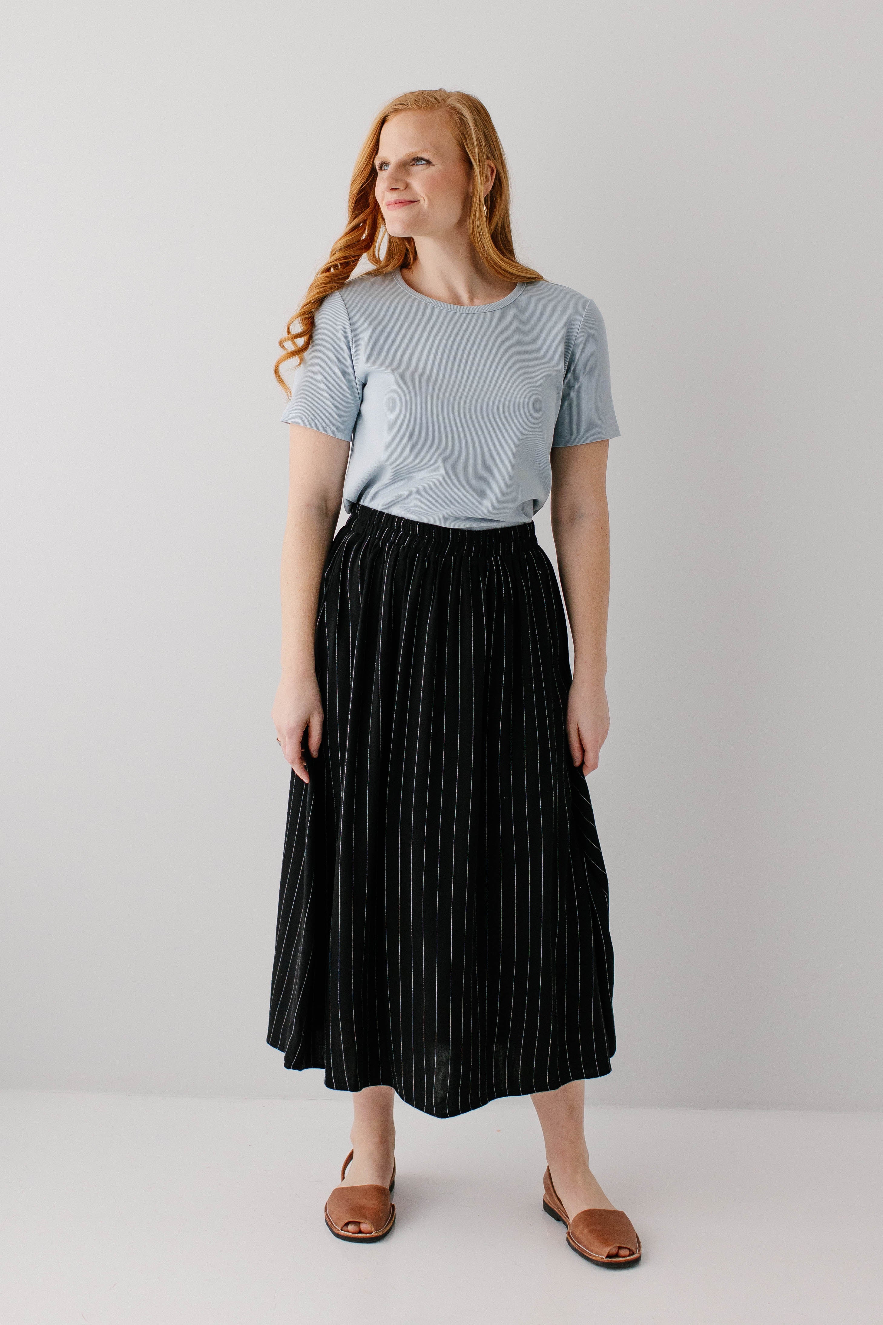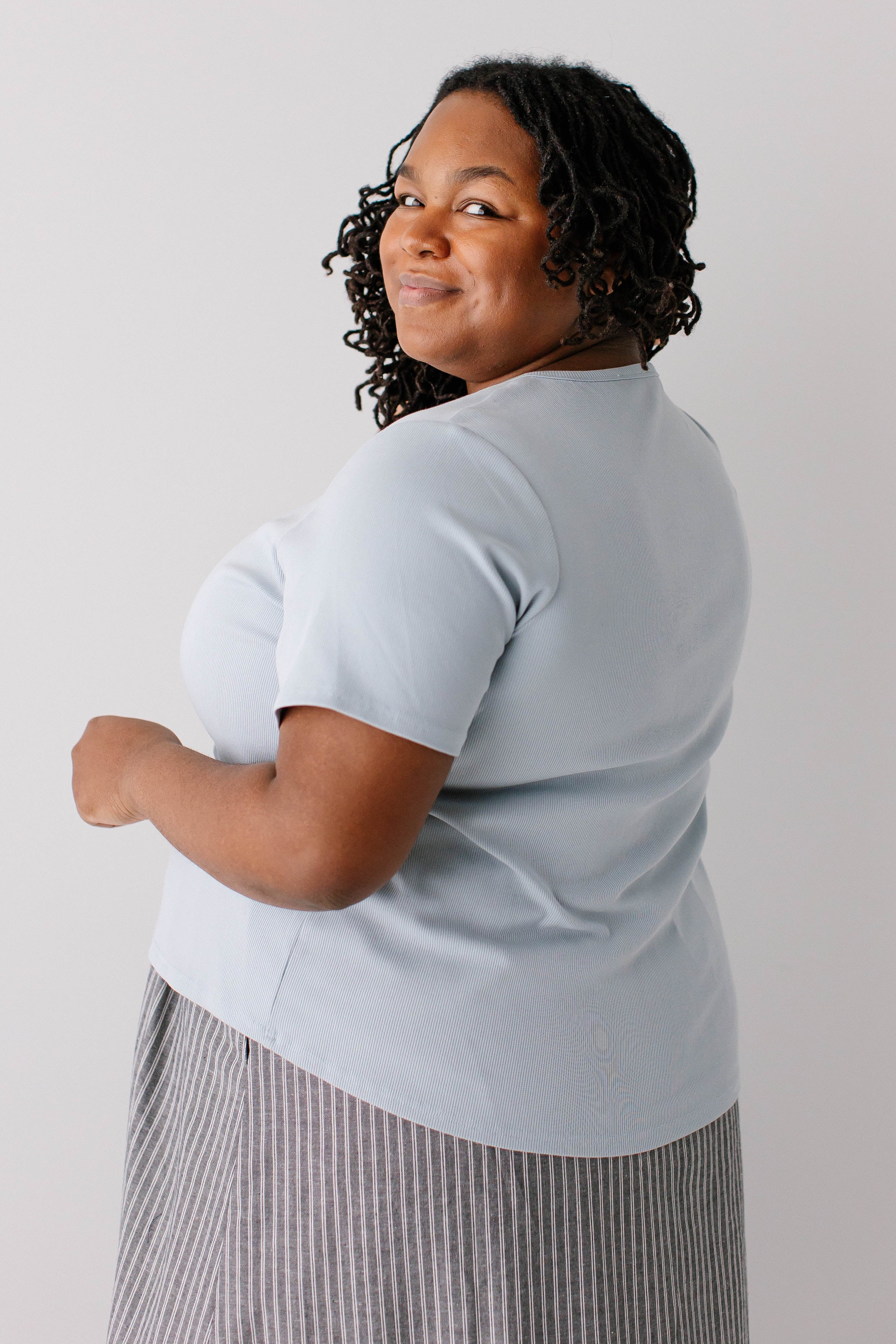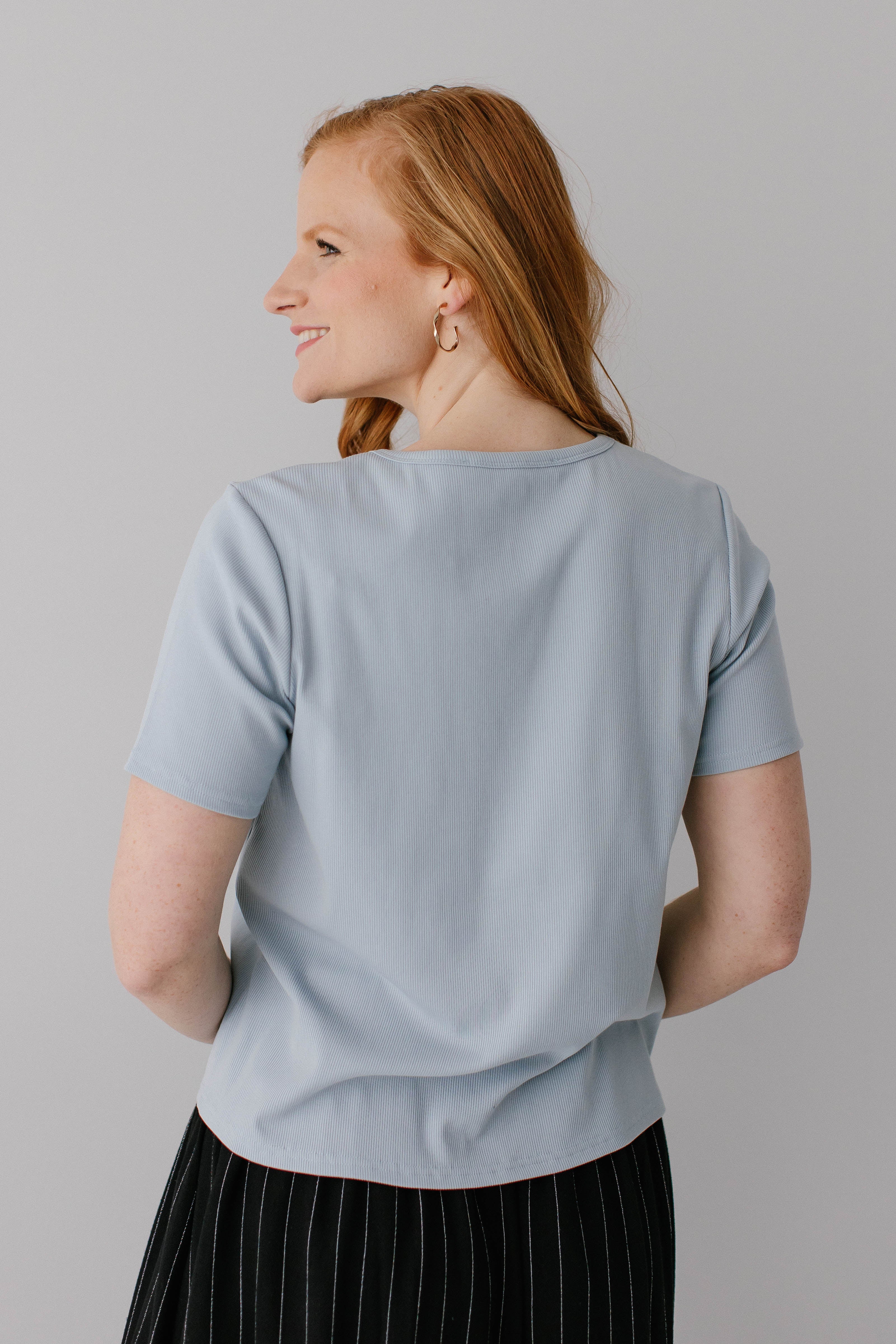 Model wearing the 'Shelly' Short Sleeve Ribbed Top in Powder Blue with the 'Dion' Pinstripe A-Line Midi Skirt