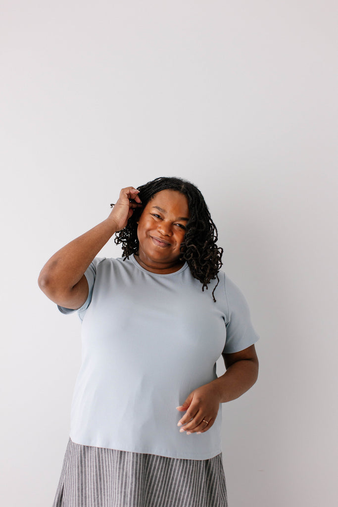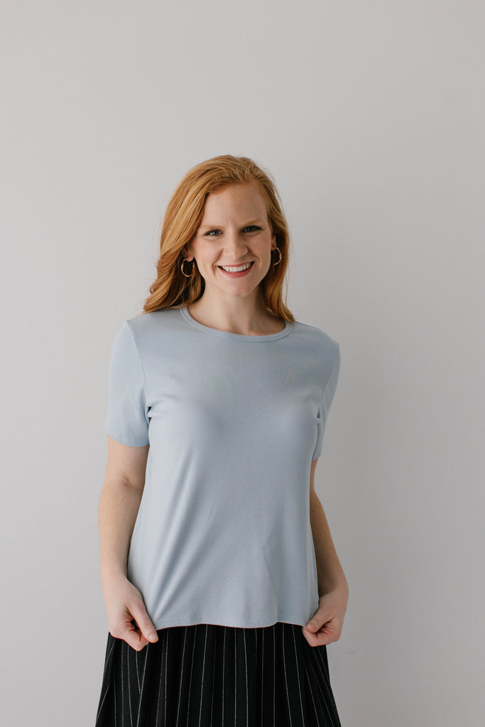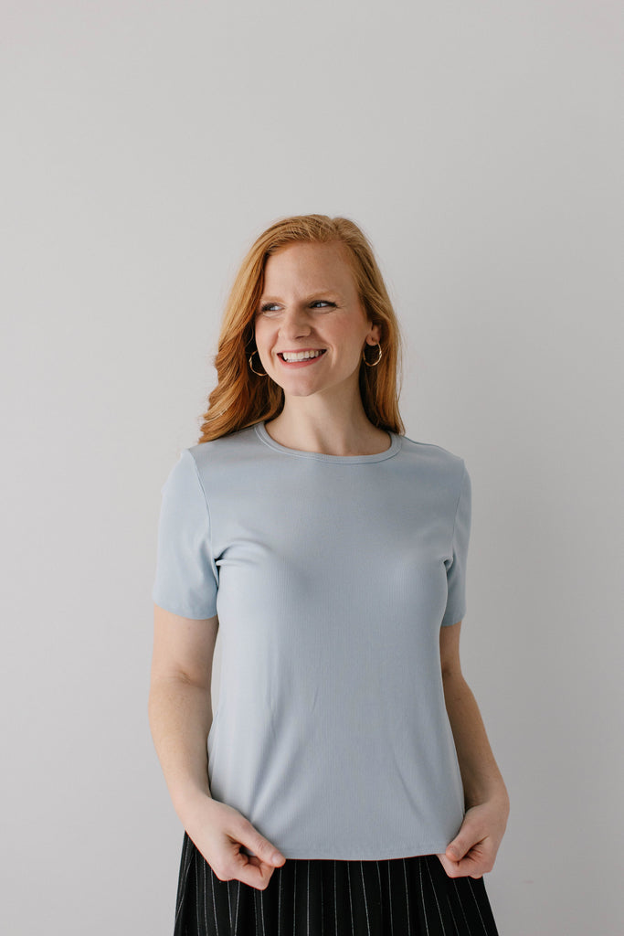 The ‘Shelly’ Ribbed Tee is back and ready for spring! This top is made from a soft comfortable ribbed fabric that is high quality and skims your figure effortlessly. The round neckline, short sleeves, and length also ensure a modest fit. The shelly also comes in two perfect colors - powder blue and olive green! Exclusively designed by us with you in mind.