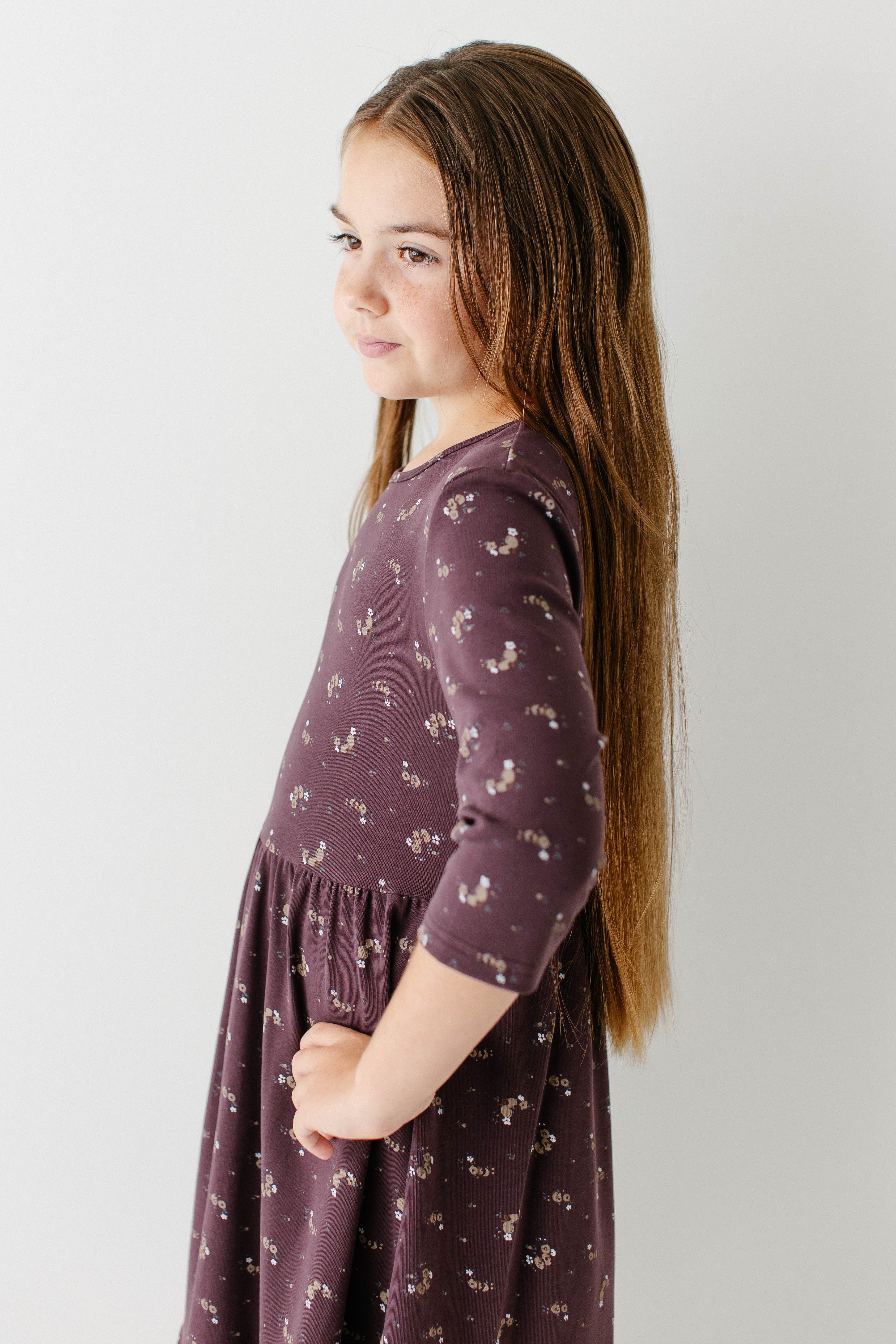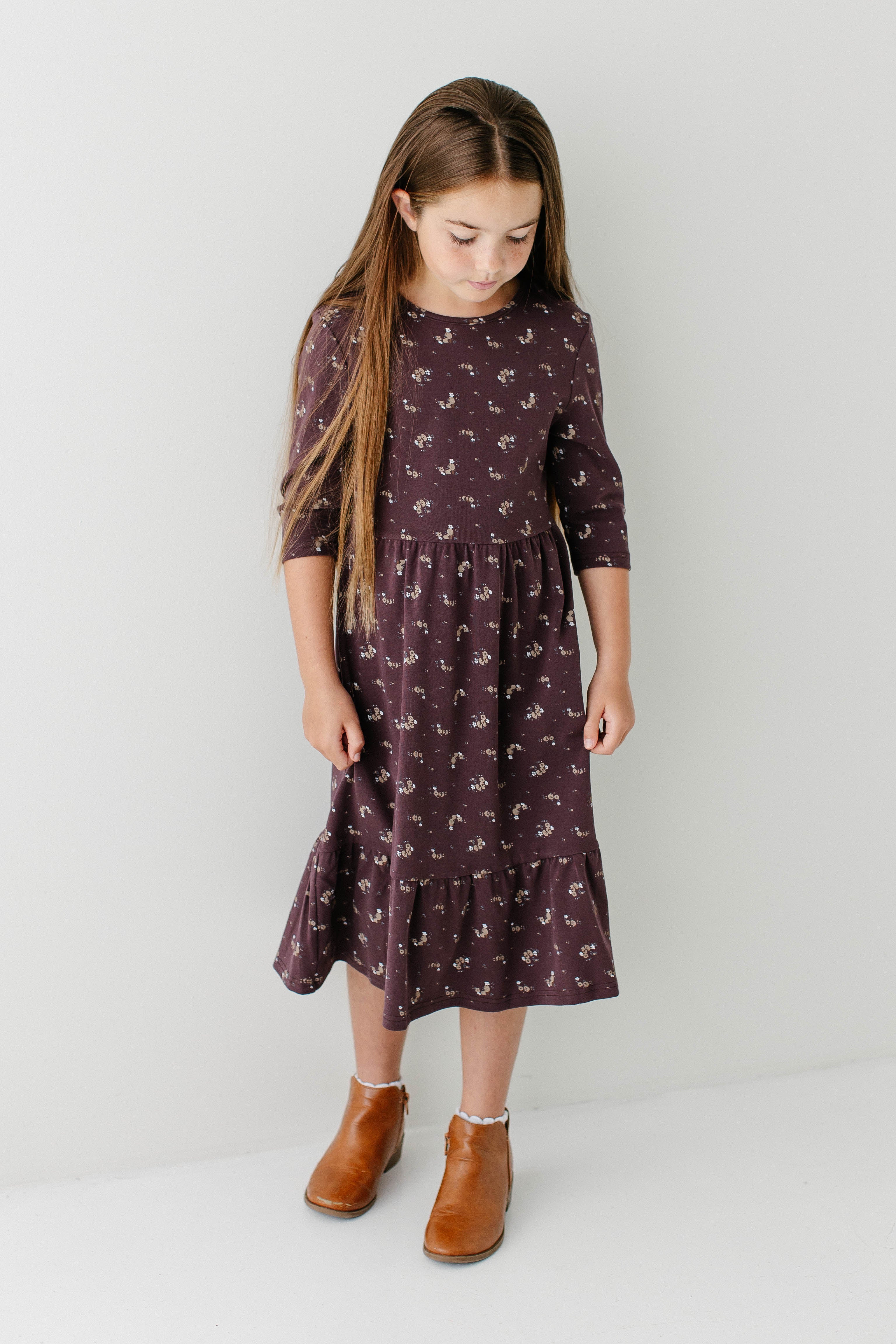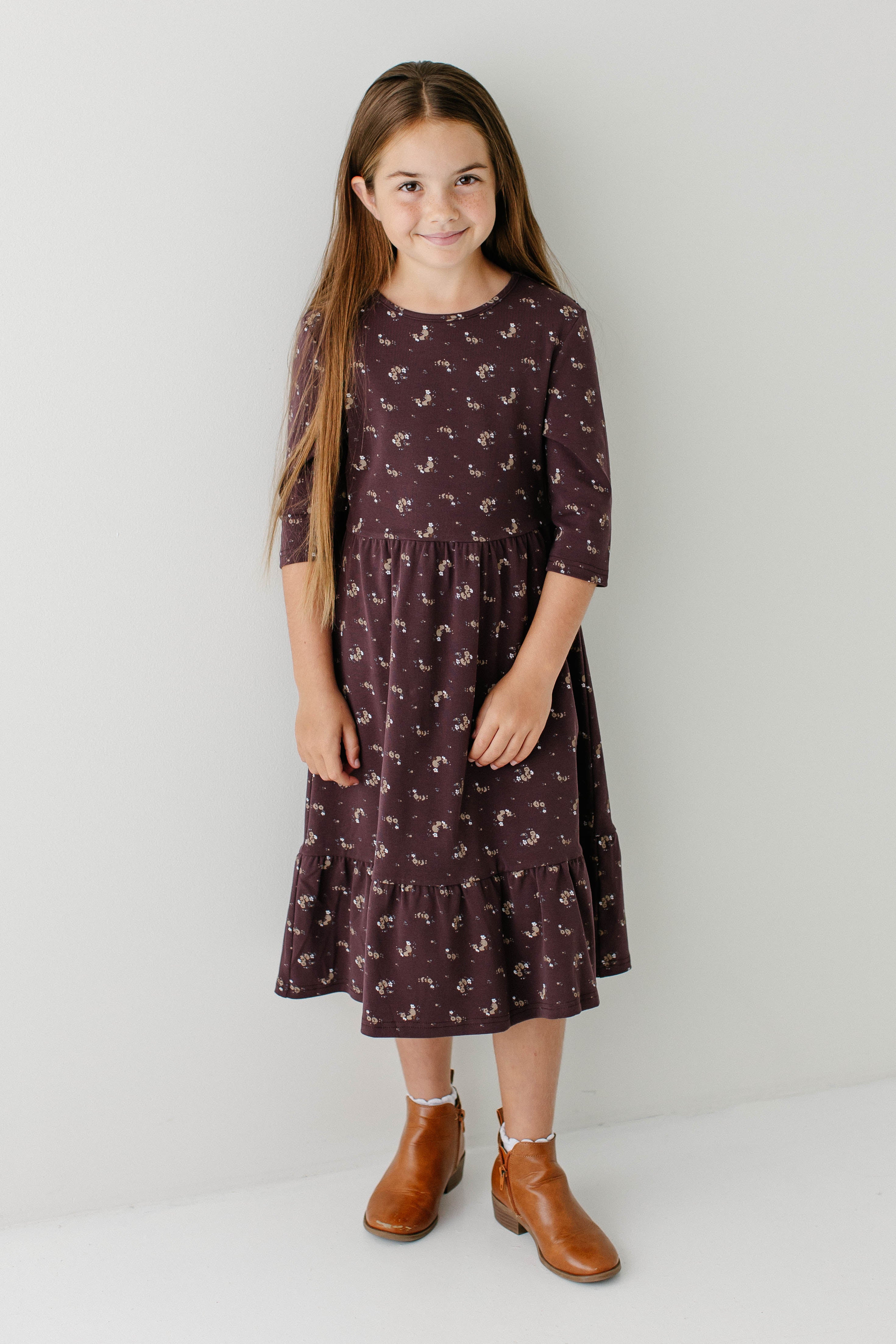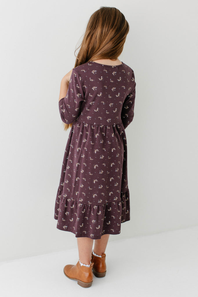 Your daughter’s new favorite dress, the 'Shiloh' Girl 3/4 Sleeve Tiered Midi Dress. This is our popular ‘Shiloh’ dress, now in the perfect fall style! Made with ¾ length sleeves that are perfect for cool weather and with a ditsy floral print on a dark purple background, this is a piece she is sure to want to wear over and over. Style the ‘Shiloh’ with her favorite boots for her next school outfit. Exclusively designed by us with you in mind.