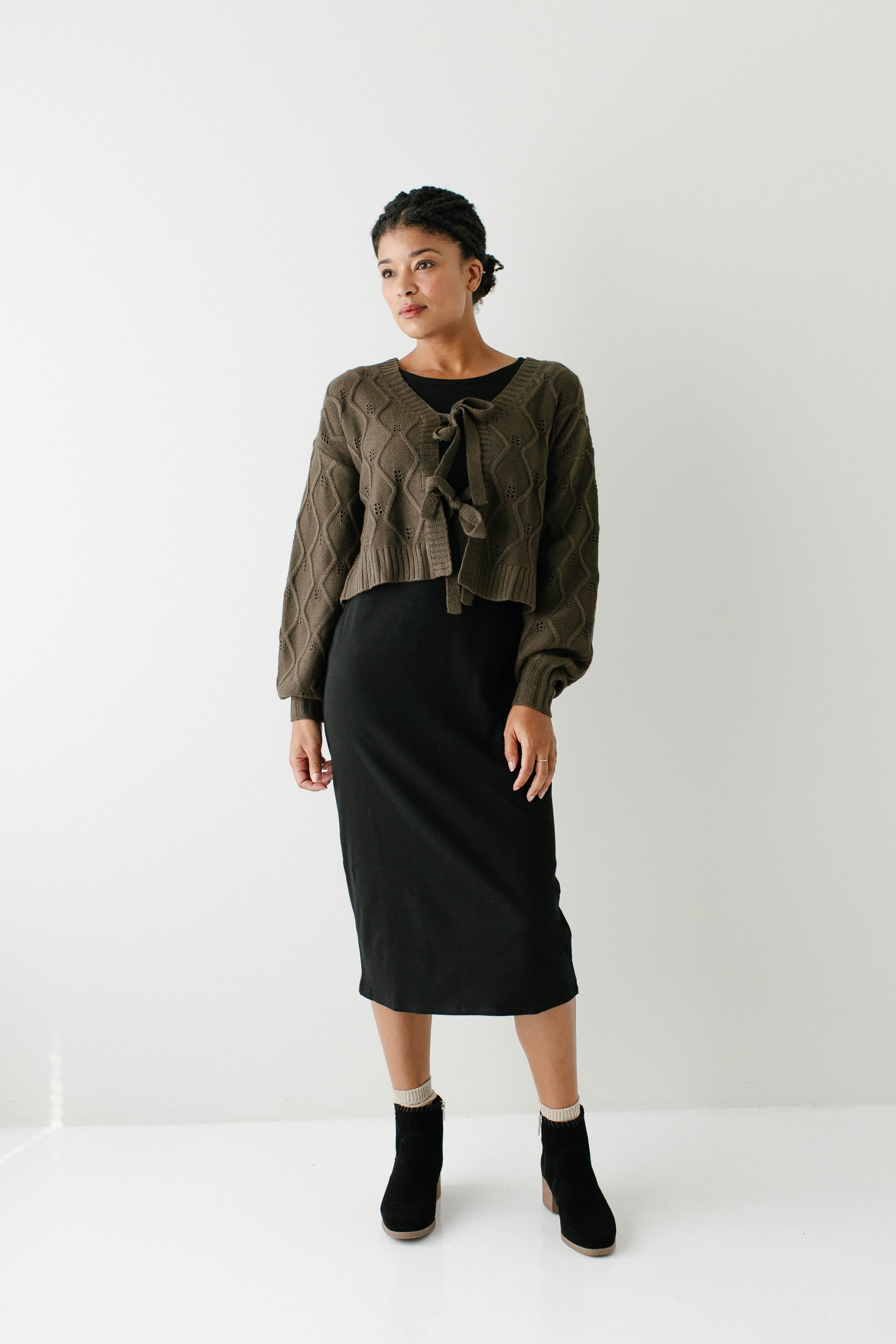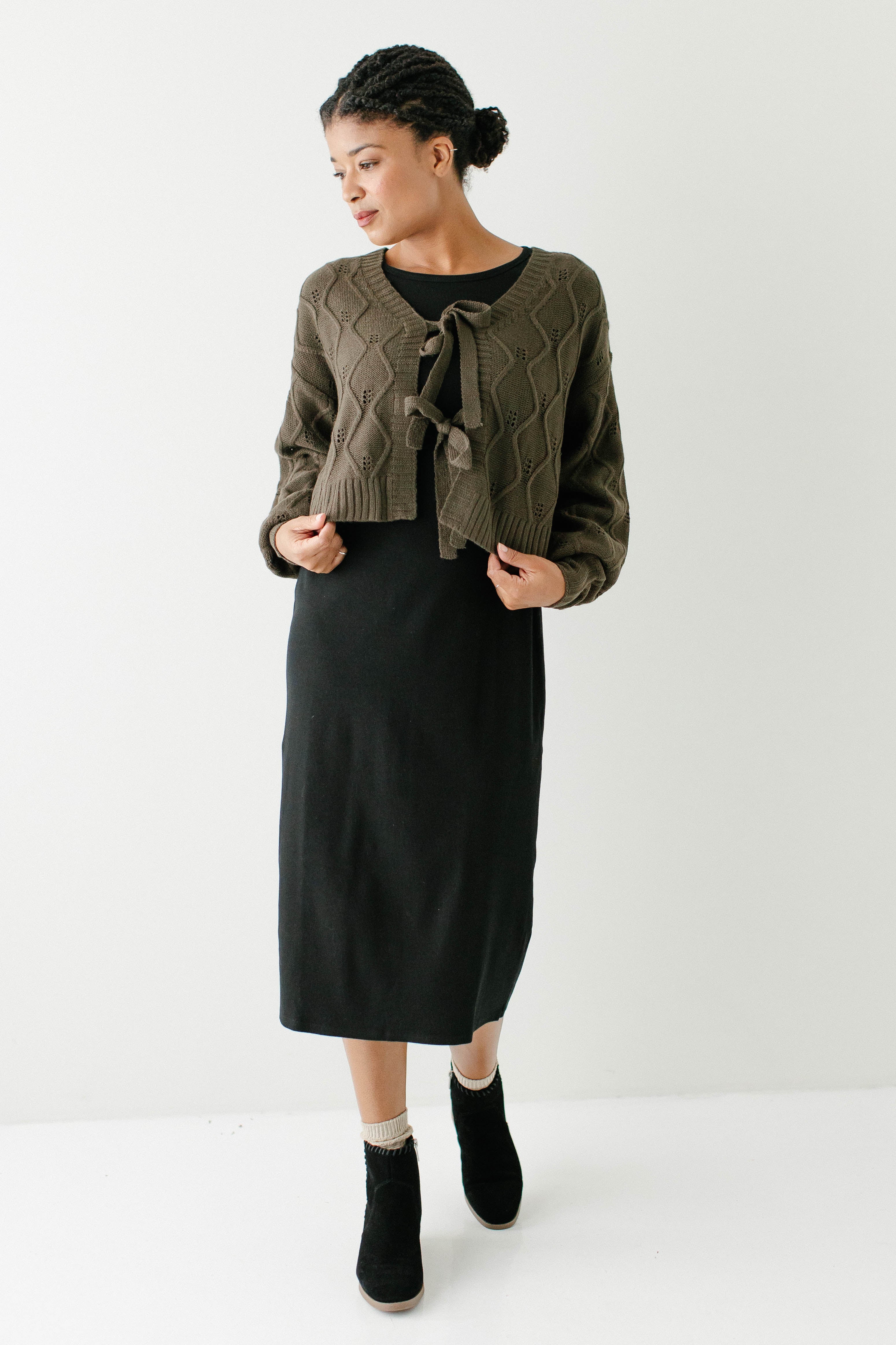 Model wearing the 'Constance' Bamboo Blend Ribbed Long Sleeve Midi Dress with the 'Sojourner' Bow Front Knit Cardigan