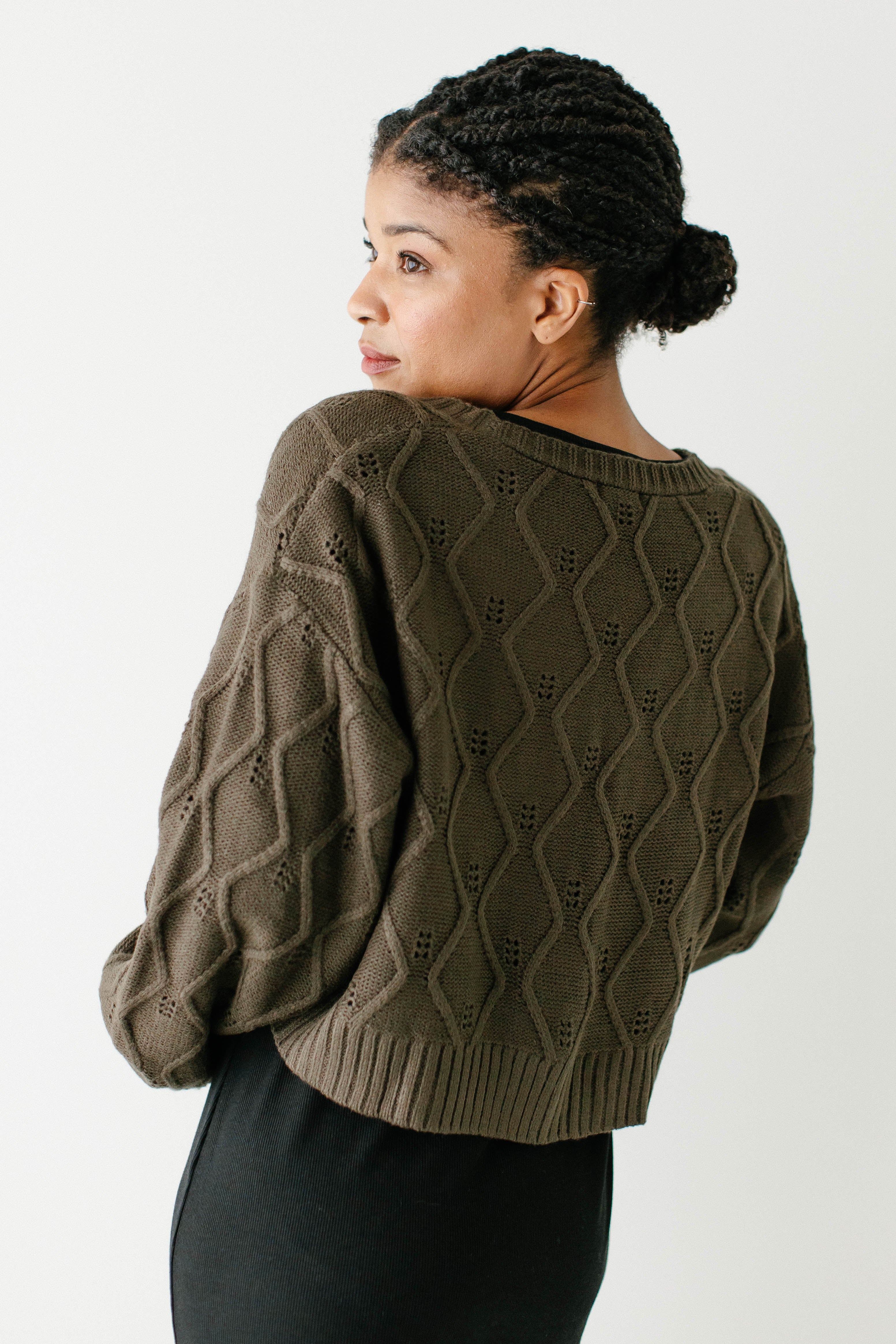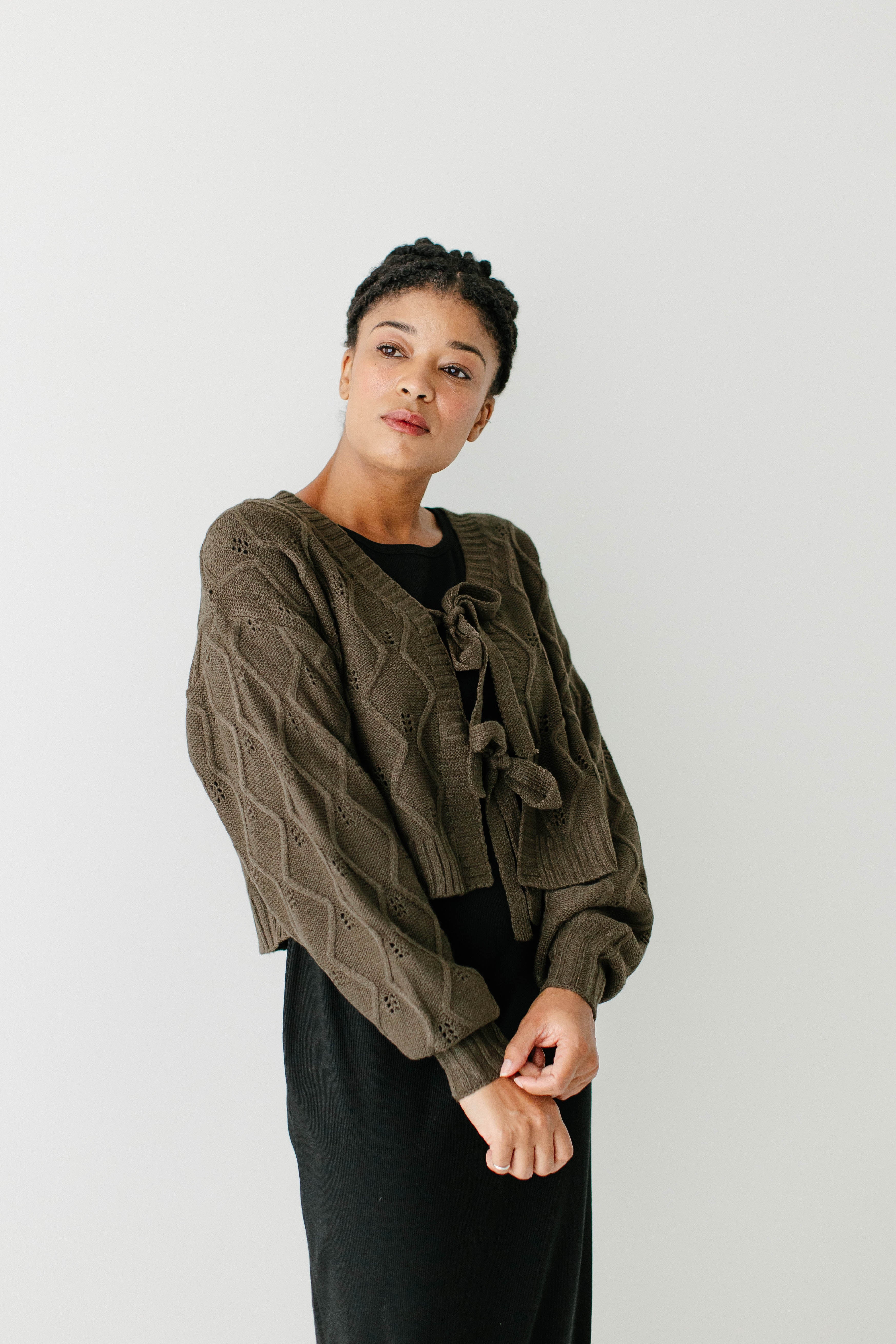 What better cardigan than one that’s perfect to pair over your favorite dress? The 'Sojourner' Bow Front Knit Cardigan is designed with a cable knit pattern, functional double bow detail, and slightly cropped style that not only pairs well with dresses for an updated look on a classic style, but also with a turtleneck and skirt. Wear the ‘Sojourner’ for a day spent at a fall fest!
