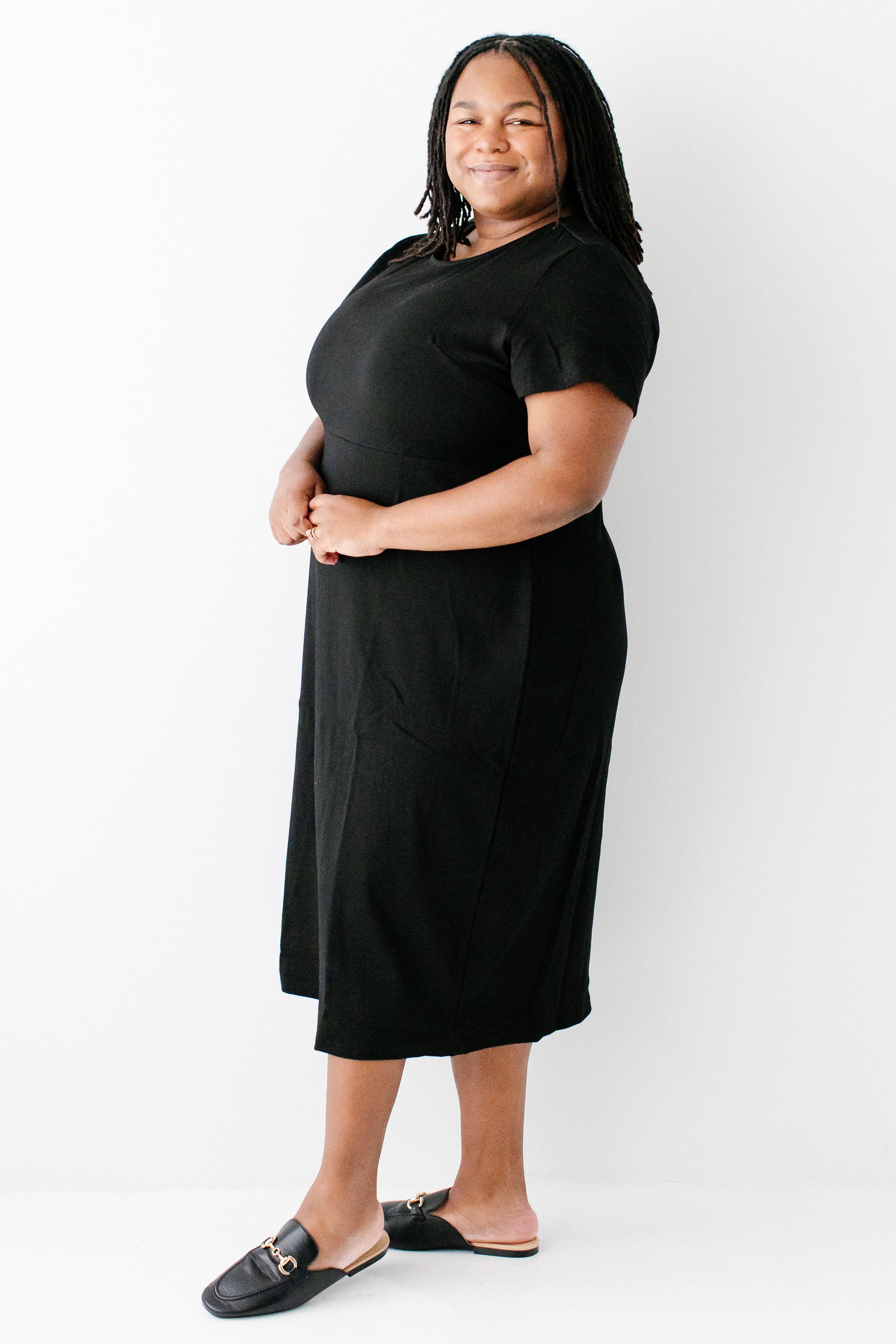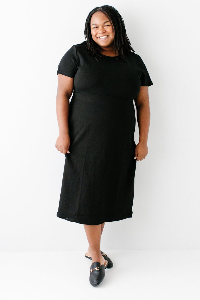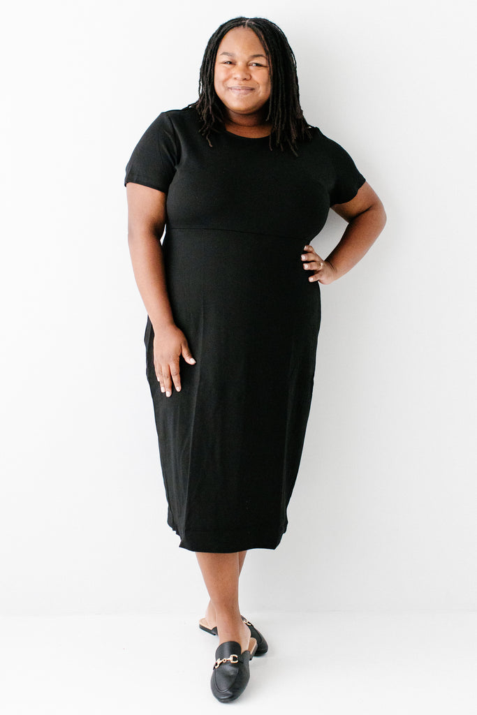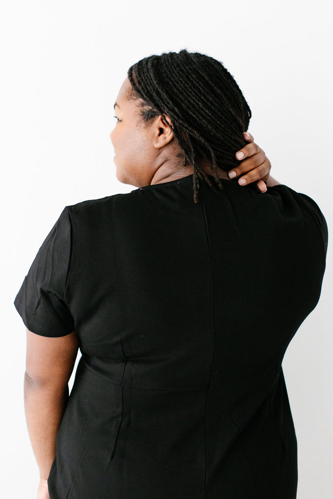 Update your closet basics with the Spencer dress! This comfortable short sleeved dress is made from a high quality soft and stretchy ponte knit fabric — making it sure to become a favorite in all seasons. Featuring a simple crewneck, back zipper and below-the-knee length for easy wear, this piece is a flattering staple for all body types! Pair the Spencer with slip-on flats, casual sneakers or wedge heel sandals to create a look that is completely YOU! Exclusively designed with you in mind.