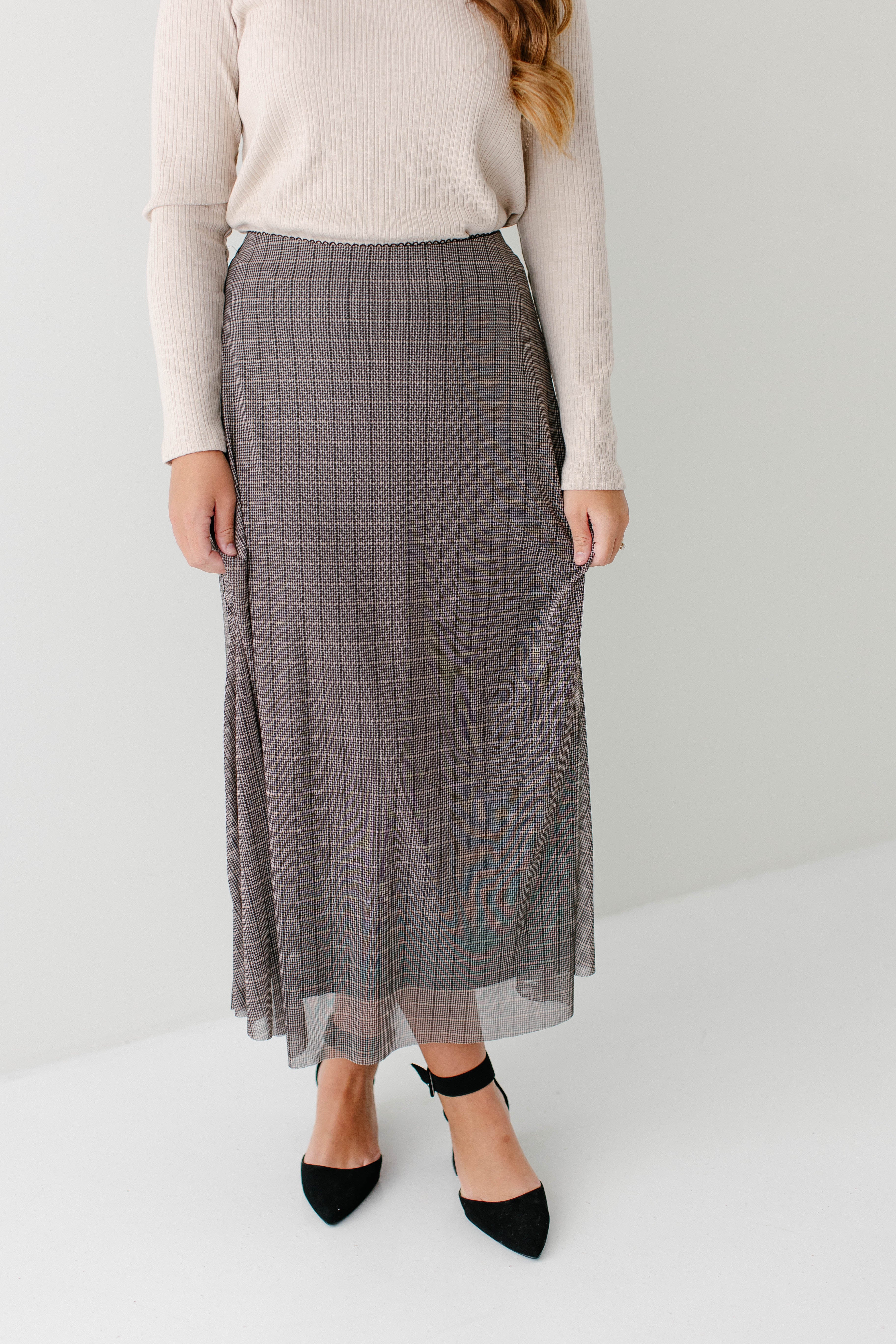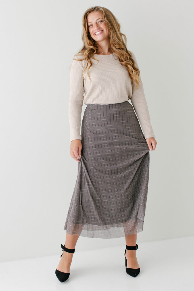 Model wearing 'Sasha' Long Sleeve Ribbed Top and the 'Talitha' Plaid Print Mesh Midi Skirt