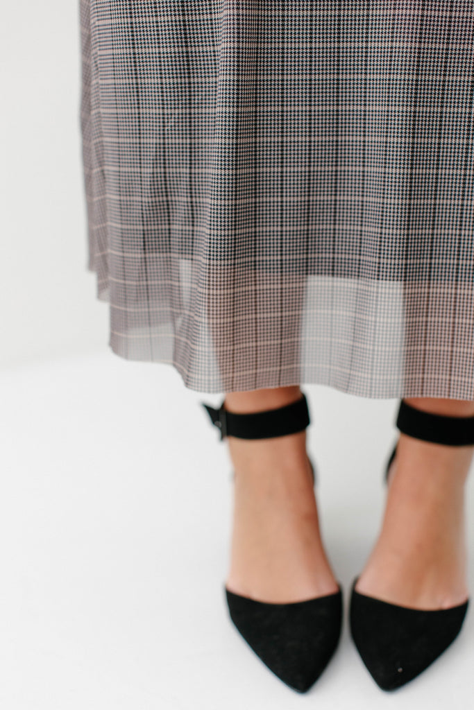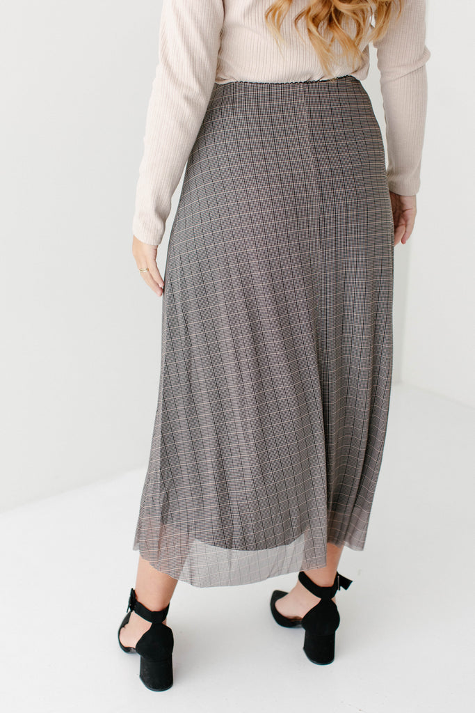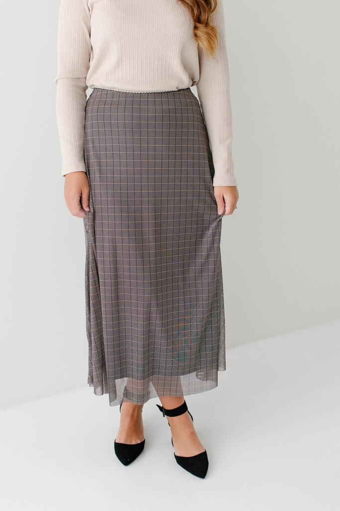 For your favorite professional looks, the 'Talitha' Plaid Print Mesh Midi Skirt is the perfect option! With soft mesh plaid print fabric, raw hem, elastic waistband full lining, and flattering draped silhouette, this skirt is full of all the details! Pair with a black mock neck top and black heels for a sleek outfit for a day in the office.