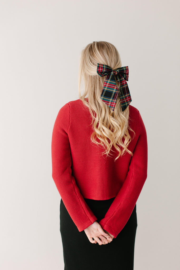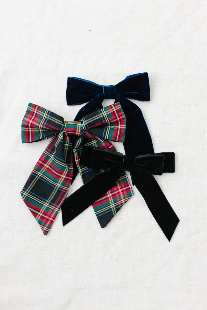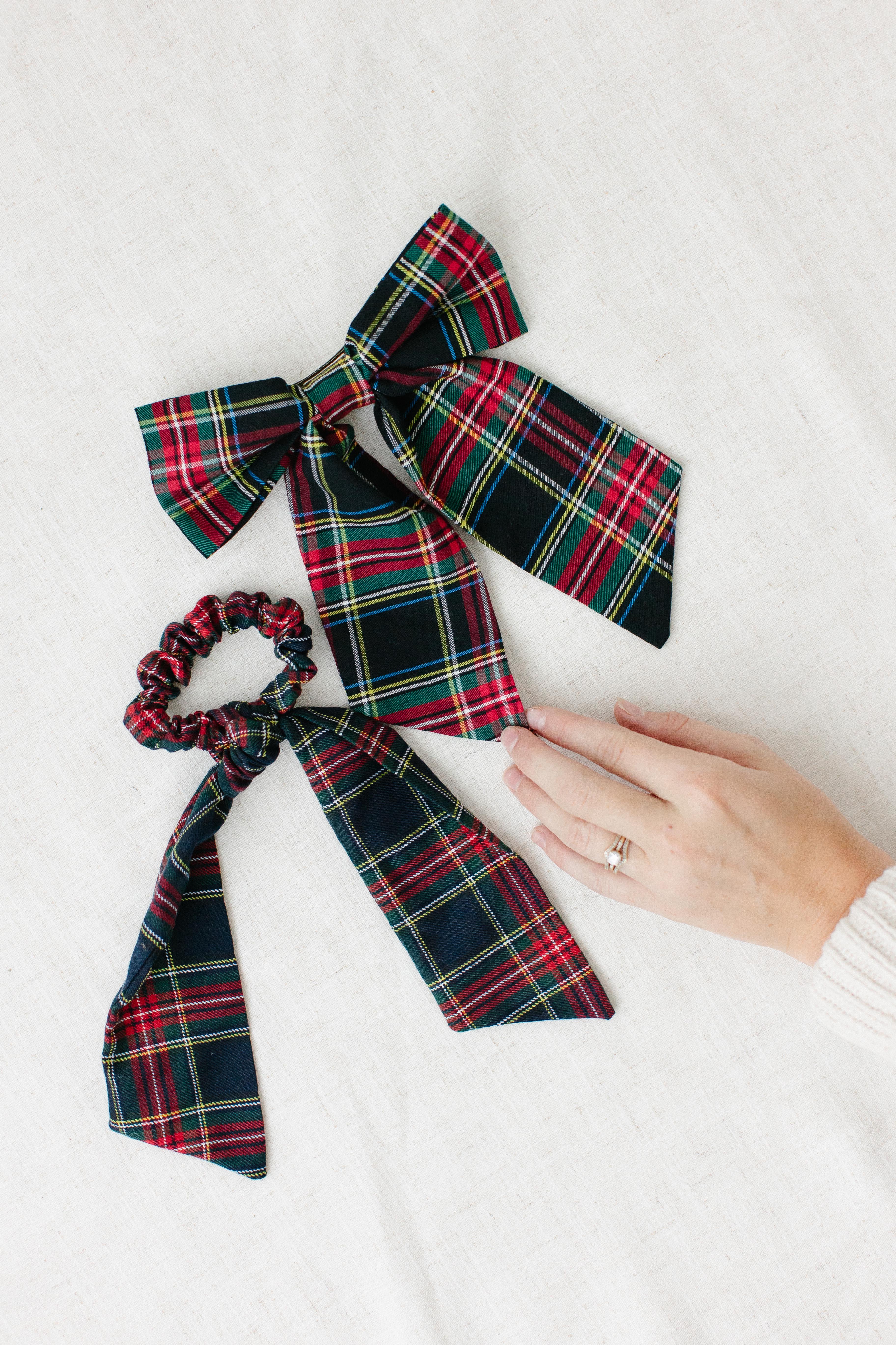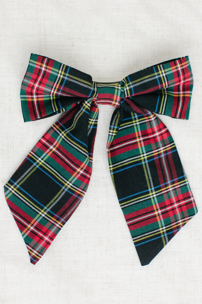 Add a festive accessory for a classic holiday look with the Tartan Plaid Bow Barrette! With a french barrette closure and tartan plaid on a black background, this is the cutest way to elevate your hair for all of your Christmas activities!