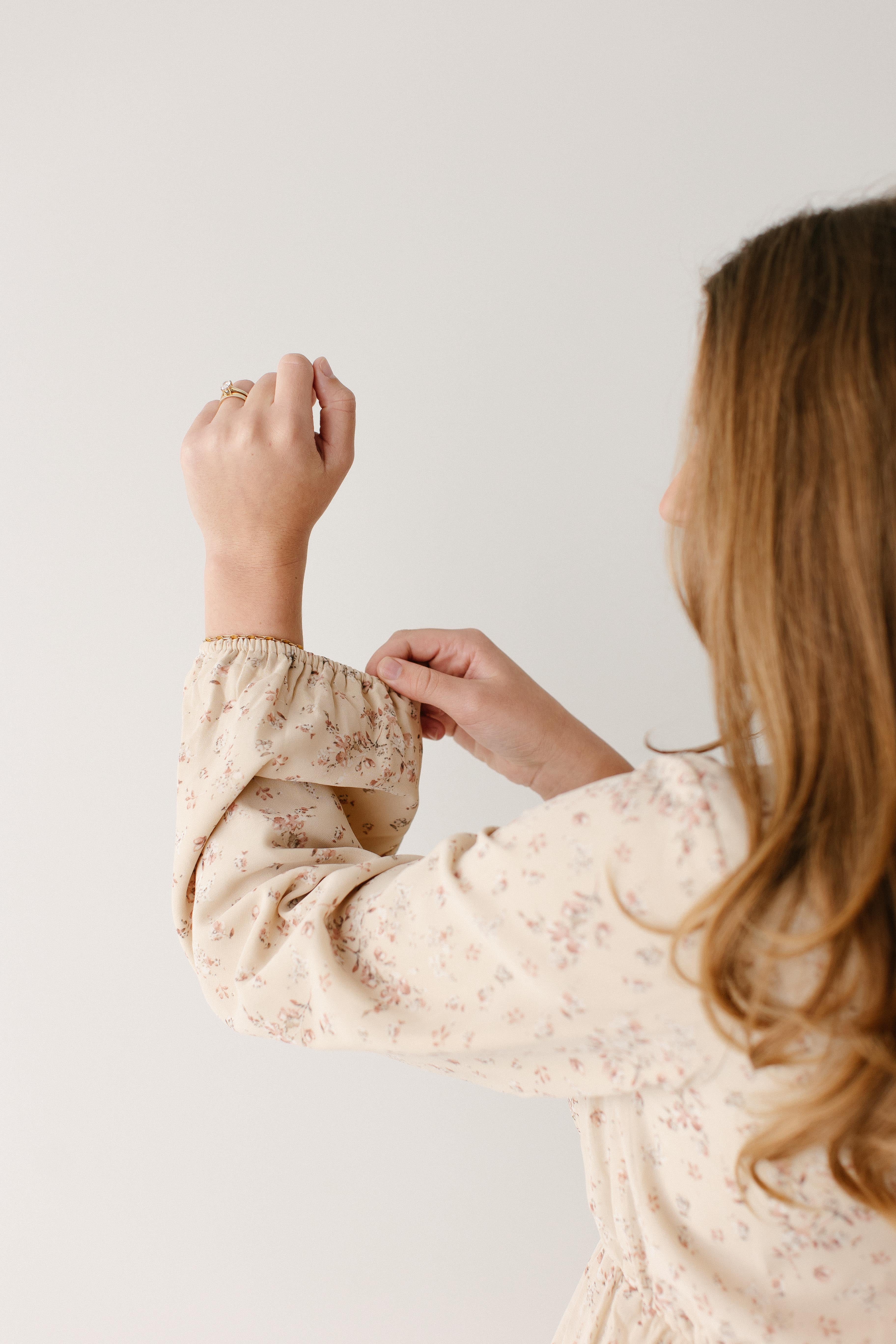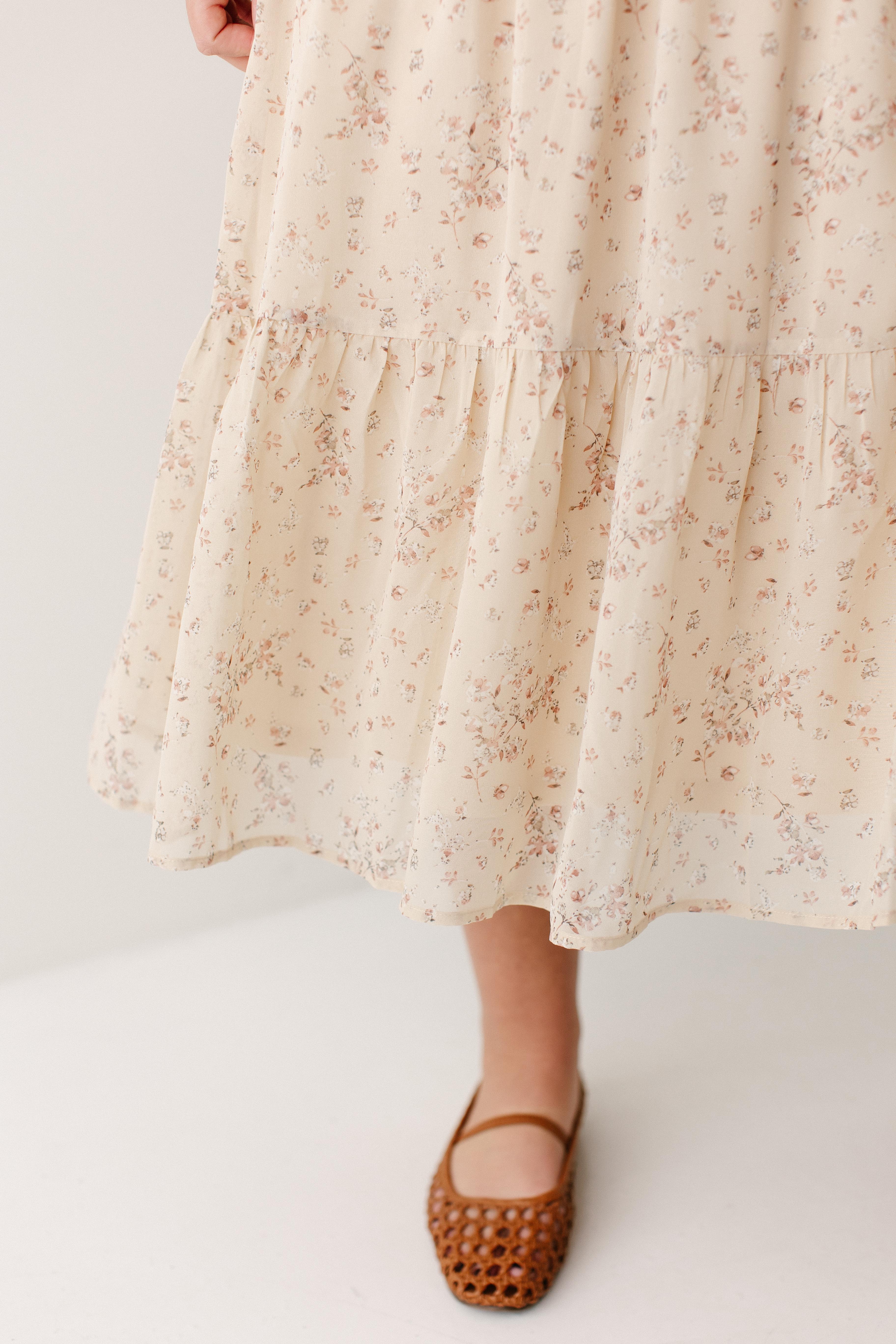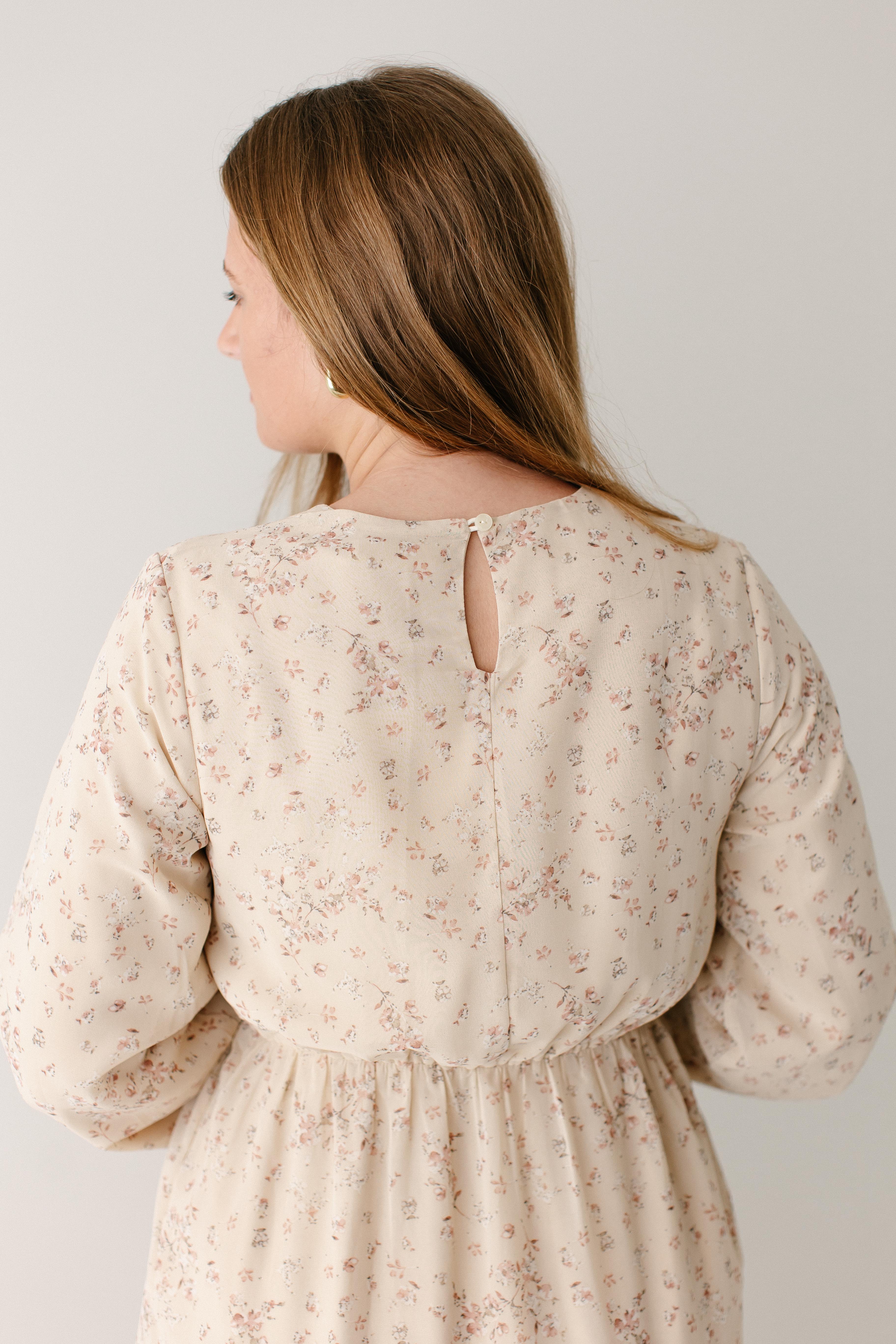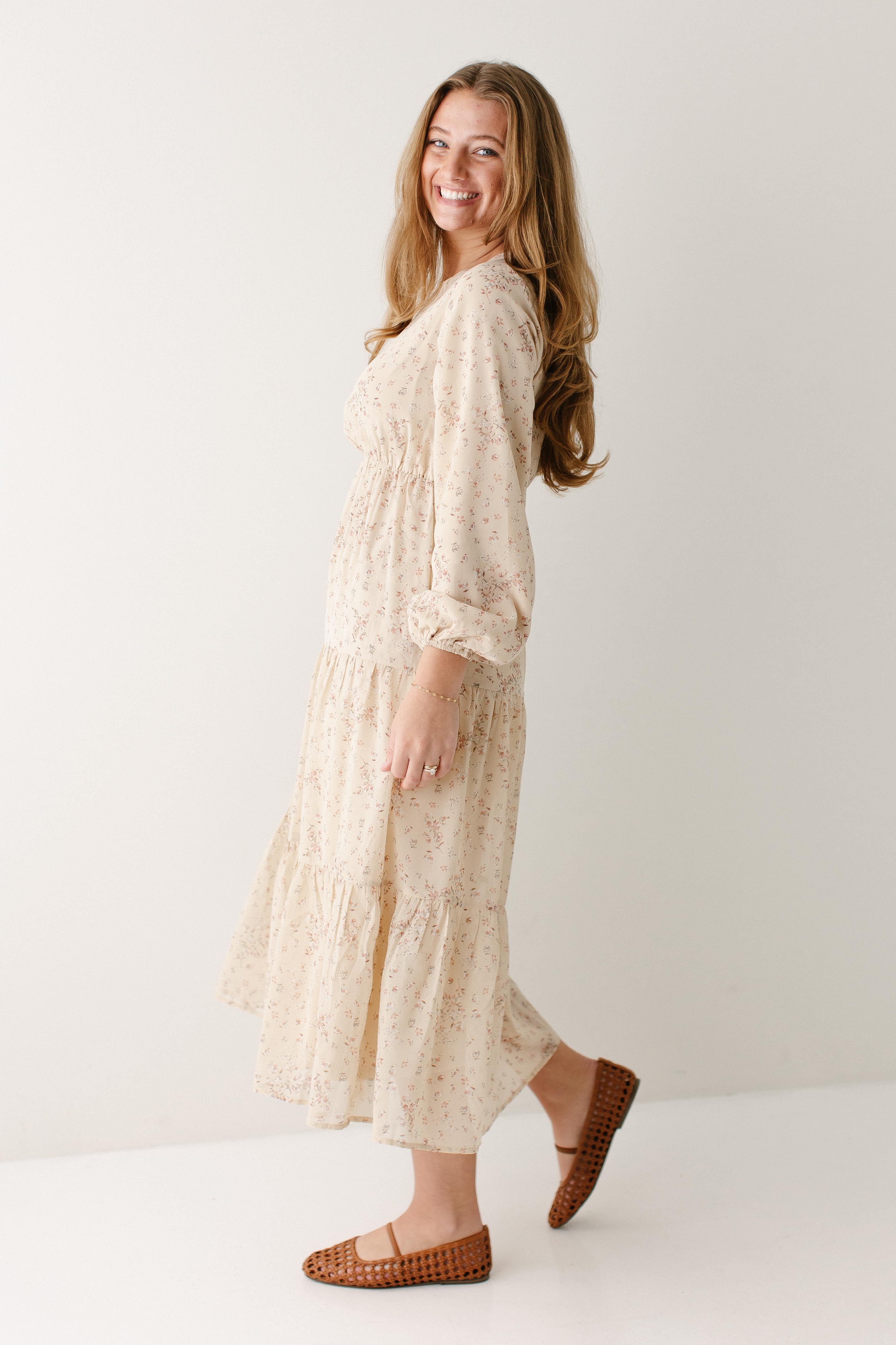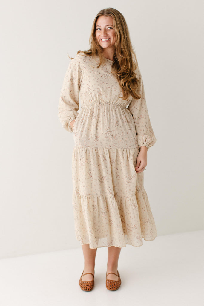 Meet the 'Tricia' Blush Floral Tiered Maxi Dress, the perfect long sleeve dress! Featuring dainty blush floral details, tiered skirt, modest round neck, and long sleeves with elastic detailing! This dress is also lined. Pair the ‘Tricia’ with heels or boots to complete your perfectly feminine look.
