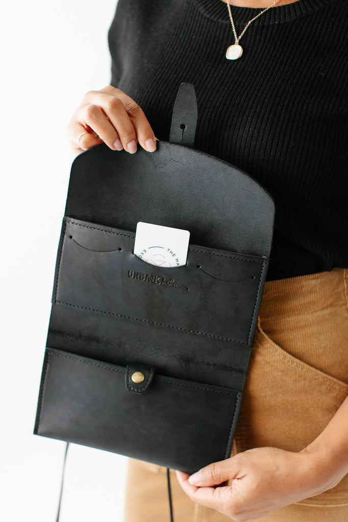 This crossbody wallet might just become your daily wallet! Made locally in Lancaster County out of genuine leather, these Urban Southern Crossbody Wallets features three card slots and an upper pocket for your cash and a lower strapped pocket for your phone. This purse has an adjustable strap that can range from 40" to 56" long, and comes in a rich chestnut or black!