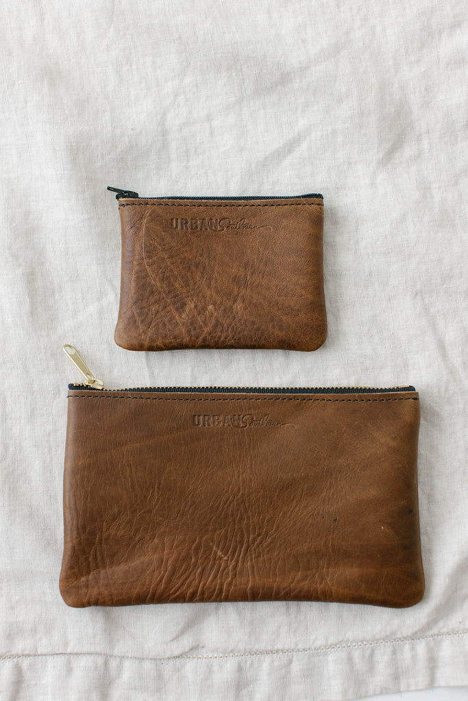A classy zipper pouch in 2 different size options that will stay with you for years to come. Made out of genuine leather and handcrafted locally in Lancaster County, this is a pouch that you can depend on to last!