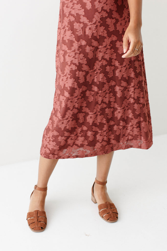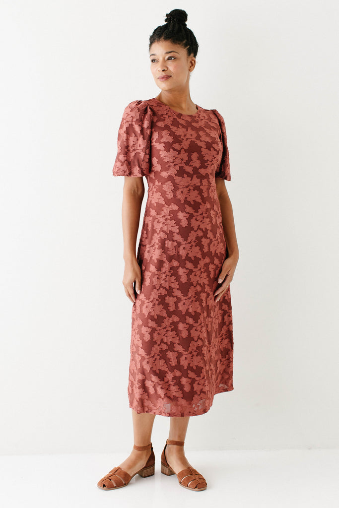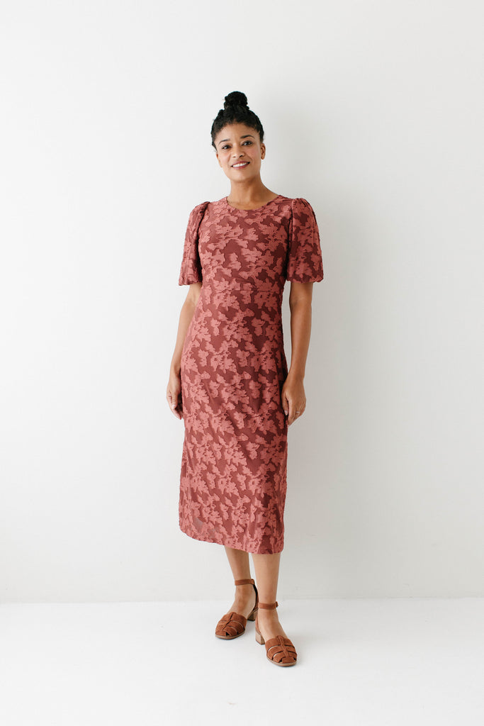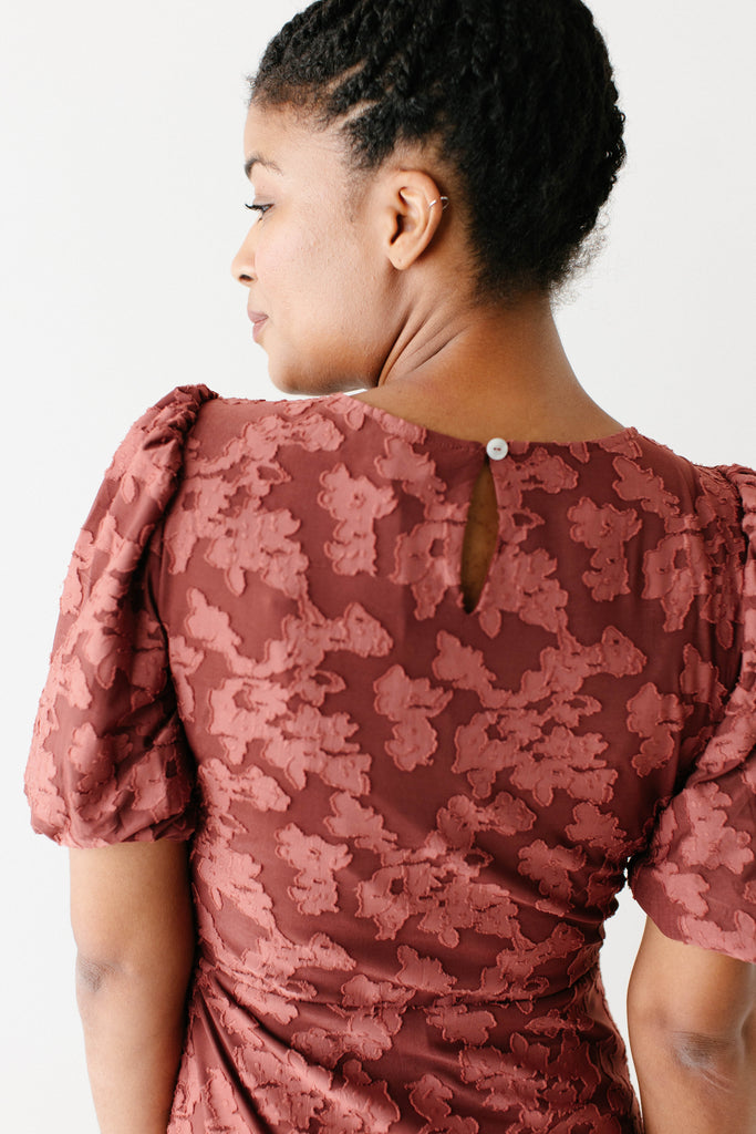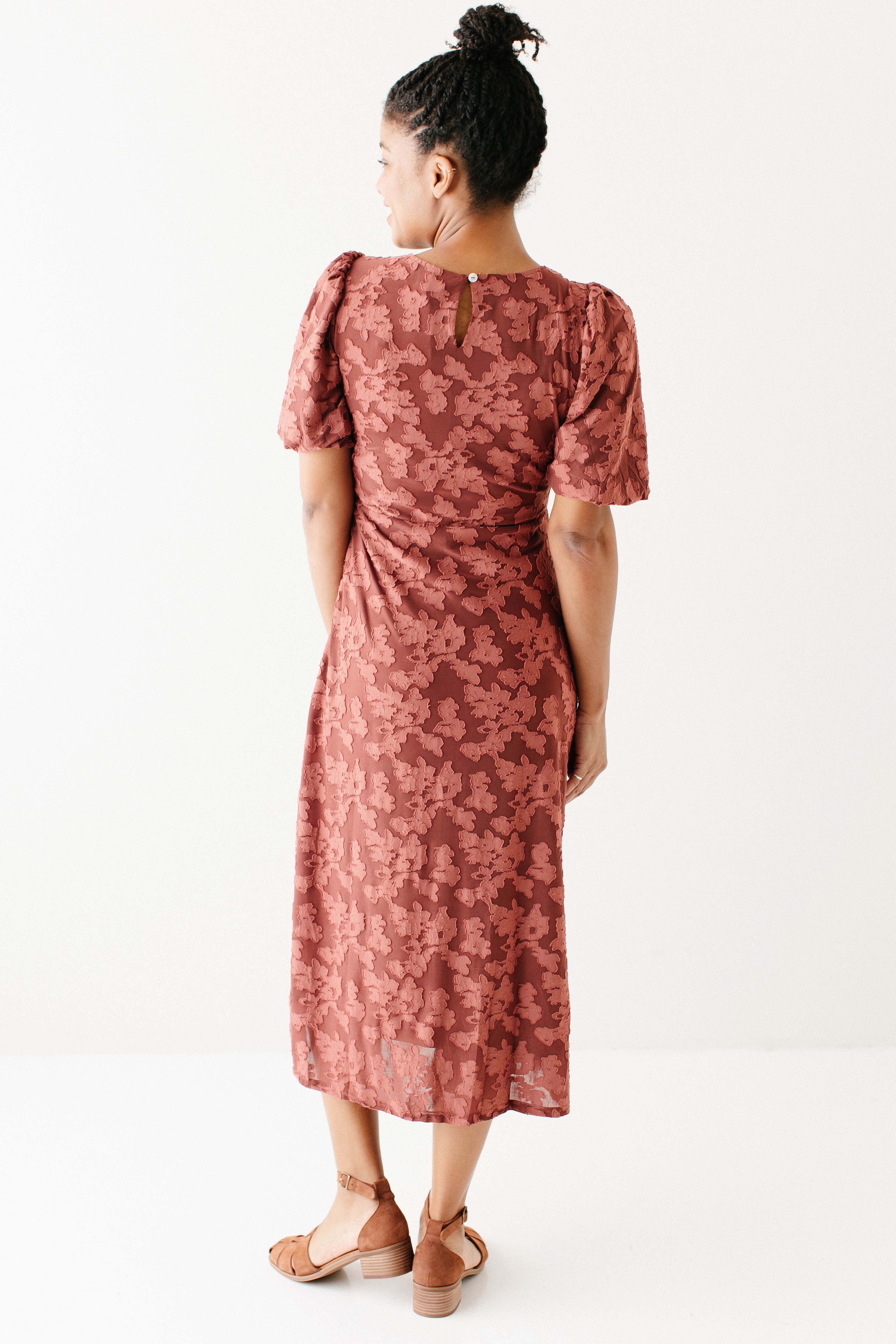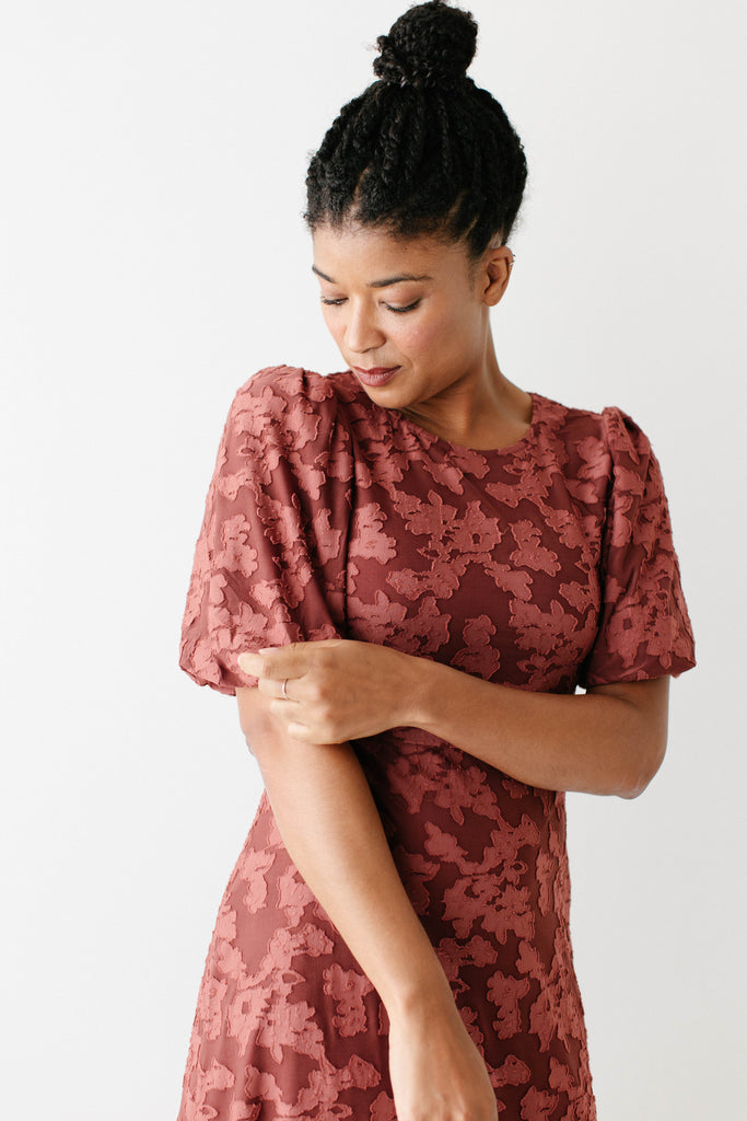 An easy addition to your closet for any season, the 'Vanessa' Textured Puff Sleeve Midi Dress! Designed in a textured floral fabric in an elegant, vintage-inspired silhouette, and a stunning dusty rose color, this dress is perfect to wear to your upcoming work events!